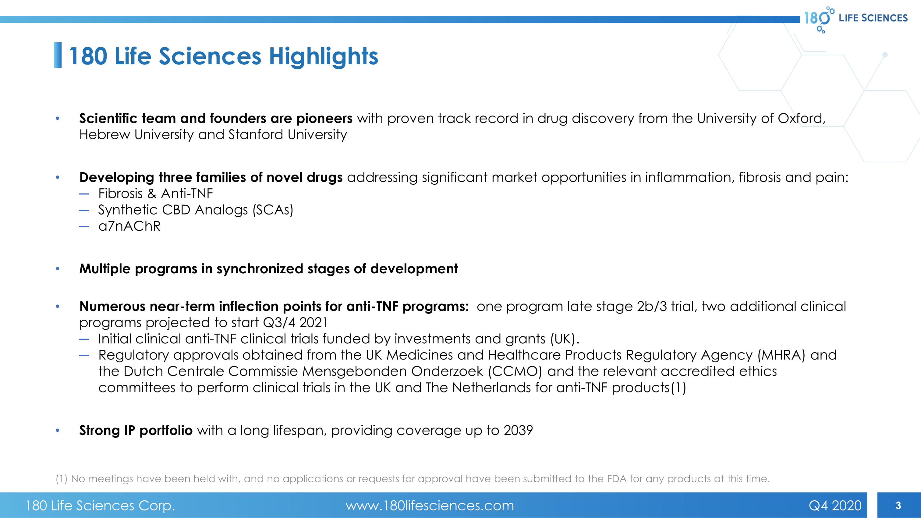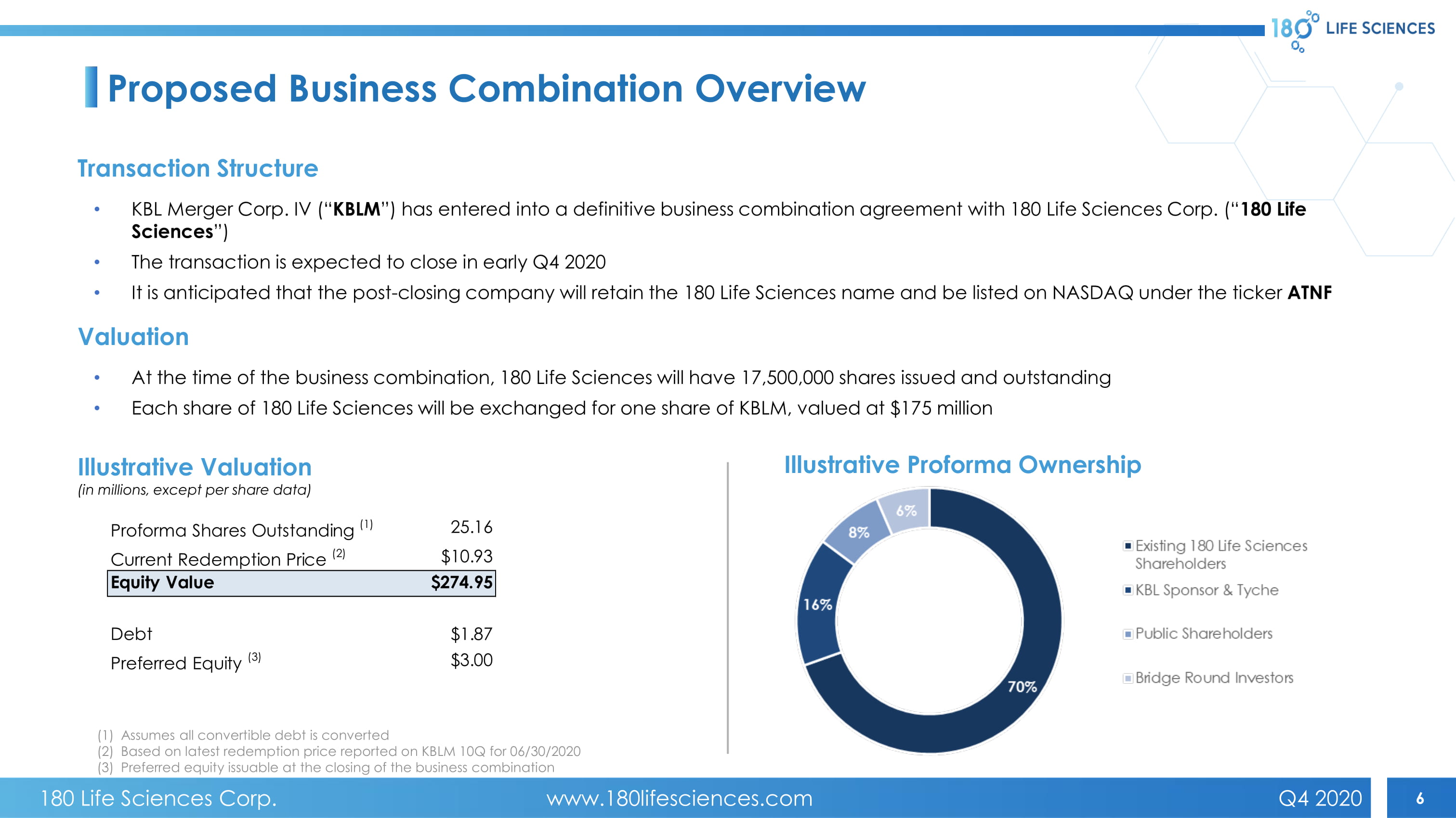 180 Life Sciences Corp. www.180lifesciences.com Q4 2020 2 This Presentation is for informational purposes only and does not constitute an offer to sell, a solicitation of an offer to buy , or a recommendation to purchase any equity, debt or other financial instruments of 180 LIFE SCIENCES Corp. (“180 Life Scie nce s”) or KBL Merger Corp. IV (“KBL”) or any of 180 Life Sciences’ or KBL’s affiliates’ securities. This Presentation has been prepared to assist interested parties in making their own evaluation with respect to the proposed business combination of 180 LIFE SCIENC ES and KBL and for no other purpose. The information contained herein does not purport to be all - inclusive. The data contained here in is derived from various internal and external sources. No representation is made as to the reasonableness of the assumptions made within or the accuracy or completeness of any projections or any other information contained herein. Any dat a o n past performance or projections contained herein is no indication as to future performance. 180 LIFE SCIENCES and KBL assume no obligation to update the information in this Presentation. Forward - Looking Statements This Presentation includes “forward - looking statements” within the meaning of U.S. federal securities laws. Words such as “expec t,” “estimate,” “project,” “budget,” “forecast,” “anticipate,” “intend,” “plan,” “may,” “will,” “could,” “should,” “believes, ” “predicts,” “potential,” “continue” and similar expressions are intended to identify such forward - looking statements. These forw ard - looking statements involve significant risks and uncertainties that could cause the actual results to differ materially from the expected results and, consequently, you should not rely on these forward - looking statements as predictions of future events. The se forward - looking statements and factors that may cause such differences include, without limitation, statements relating to the timing and completion of the proposed business combination; KBL’s continued listing on the Nasdaq Stock Market until clos ing of the proposed business combination; expectations regarding the capitalization, resources and ownership structure of the combined company; the inability to recognize the anticipated benefits of the proposed business combination, which may be affecte d by, among other things, the amount of cash available following redemptions by KBL stockholders; the ability to meet the Nasdaq Stock Market's listing standards following the consummation of the transactions contemplated by the proposed business com bination; costs related to the proposed business combination; expectations with respect to future performance, growth and anticipated acquisitions; ability to recognize the anticipated benefits of the proposed business combination; 180 Life Sc ien ces' ability to execute its plans to develop and market new drug products and the timing and costs of these development programs; 180 Life Sciences' estimates of the size of the markets for its potential drug products; potential litigation invol vin g KBL or 180 LIFE SCIENCES or the validity or enforceability of 180 Life Sciences’ intellectual property; global economic con dit ions; geopolitical events and regulatory changes; access to additional financing; and other risks and uncertainties indicated from tim e to time in filings with the Securities and Exchange Commission (the “SEC”). Other factors include the possibility that the proposed business combination does not close, including due to the failure to receive required security holder approvals, or the failure of other closing conditions. The foregoing list of factors is not exclusive. Additional information concerning these an d other risk factors is contained in KBL’s most recent filings with the SEC and will be contained in the proxy statement/prospe ctu s to be filed as result of the transactions described above. All subsequent written and oral forward - looking statements concerni ng KBL or 180 Life Sciences, the transactions described herein or other matters and attributable to KBL or 180 LIFE SCIENCES or any person acting on their behalf are expressly qualified in their entirety by the cautionary statements above. Readers are cauti on ed not to place undue reliance upon any forward - looking statements, which speak only as of the date made. None of KBL or 180 LIFE S CIENCES undertake or accept any obligation or undertaking to release publicly any updates or revisions to any forward - looking statement to reflect any change in their expectations or any change in events, conditions or circumstances on which a ny such statement is based. Additional Information and Where to Find It KBL has filed a registration statement on Form S - 4, which includes a preliminary proxy statement/prospectus for KBL’s stockholde rs, with the SEC. KBL’s definitive proxy statement/prospectus will be mailed to KBL’s stockholders that do not opt to receive th e document electronically. KBL and 180 LIFE SCIENCES urge investors, stockholders and other interested persons to read the prel imi nary proxy statement/prospectus, as well as other documents that will be filed with the SEC, because these documents will contain important information about the proposed business combination transaction. Such persons can also read KBL’s Annual Re por t on Form 10 - K for the fiscal year ended December 31, 2019, for a description of the security holdings of its officers and directors and their respective interests as security holders in the consummation of the proposed business combination transac tio n. KBL’s definitive proxy statement/prospectus, which is included in the registration statement, will be mailed to stockholde rs of KBL as of a record date to be established. KBL’s stockholders will also be able to obtain a copy of such documents, withou t c harge, by directing a req