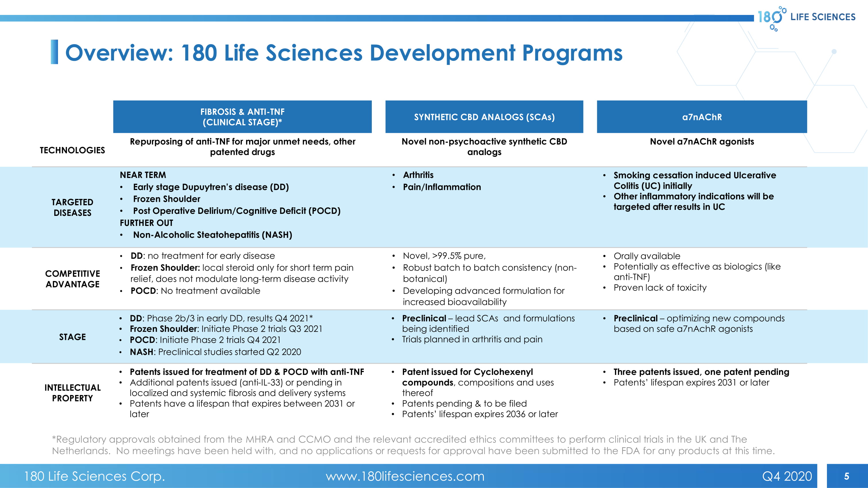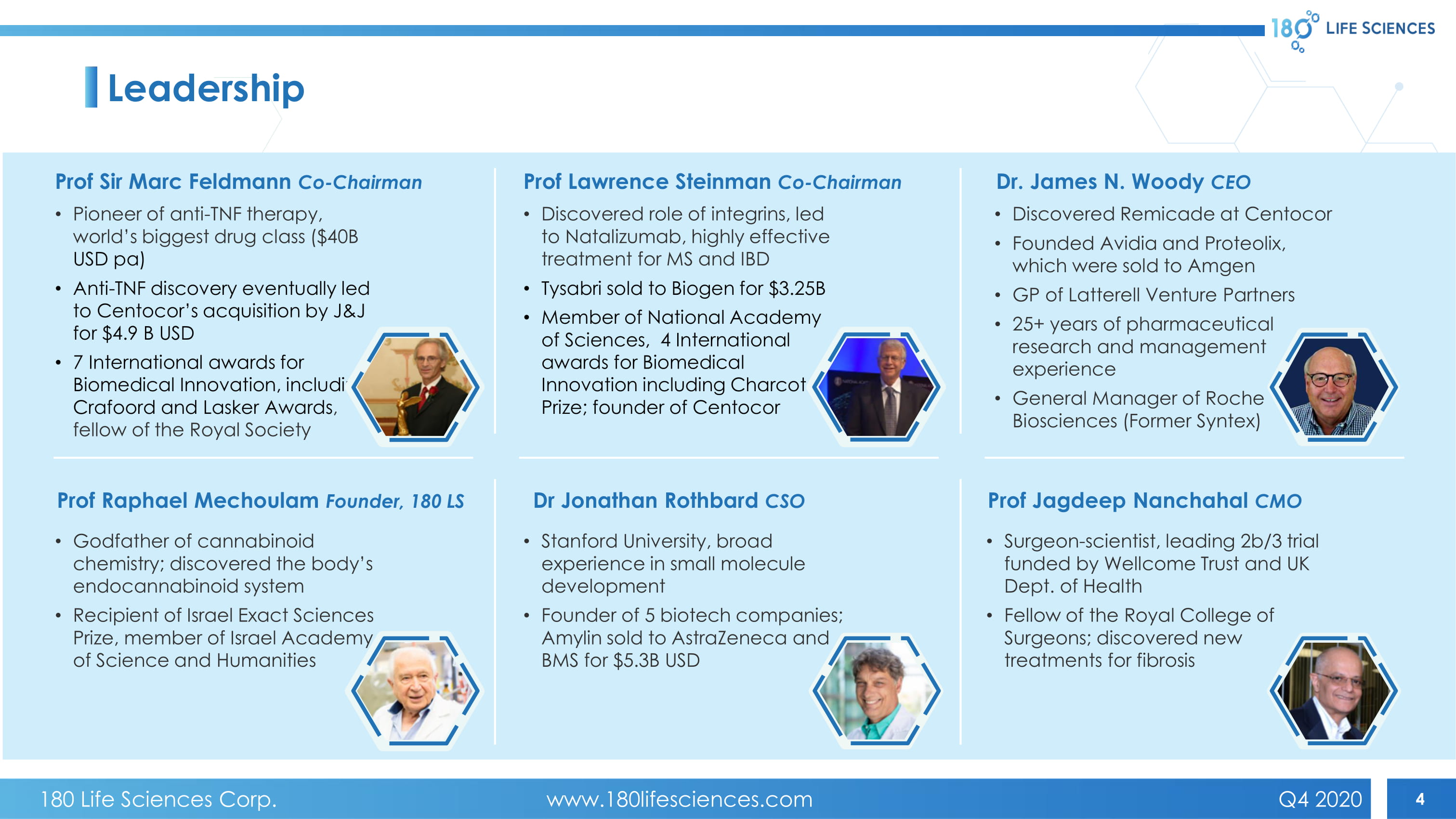 4 Leadership Prof Sir Marc Feldmann Co - Chairman • Pioneer of anti - TNF therapy, world’s biggest drug class ($40B USD pa) • Anti - TNF discovery eventually led to Centocor’s acquisition by J&J for $4.9 B USD • 7 International awards for Biomedical Innovation, including Crafoord and Lasker Awards , fellow of the Royal Society Prof Lawrence Steinman Co - Chairman • Discovered role of integrins, led to Natalizumab, highly effective treatment for MS and IBD • Tysabri sold to Biogen for $3.25B • Member of National Academy of Sciences, 4 International awards for Biomedical Innovation including Charcot Prize; founder of Centocor Prof Raphael Mechoulam Founder, 180 LS • Godfather of cannabinoid chemistry; discovered the body’s endocannabinoid system • Recipient of Israel Exact Sciences Prize, member of Israel Academy of Science and Humanities Dr. James N. Woody CEO • Discovered Remicade at Centocor • Founded Avidia and Proteolix , which were sold to Amgen • GP of Latterell Venture Partners • 25+ years of pharmaceutical research and management experience • General Manager of Roche Biosciences (Former Syntex ) Dr Jonathan Rothbard CSO • Stanford University, broad experience in small molecule development • Founder of 5 biotech companies; Amylin sold to AstraZeneca and BMS for $5.3B USD Prof Jagdeep Nanchahal CMO • Surgeon - scientist, leading 2b/3 trial funded by Wellcome Trust and UK Dept. of Health • Fellow of the Royal College of Surgeons; discovered new treatments for fibrosis 180 Life Sciences Corp. www.180lifesciences.com Q4 2020