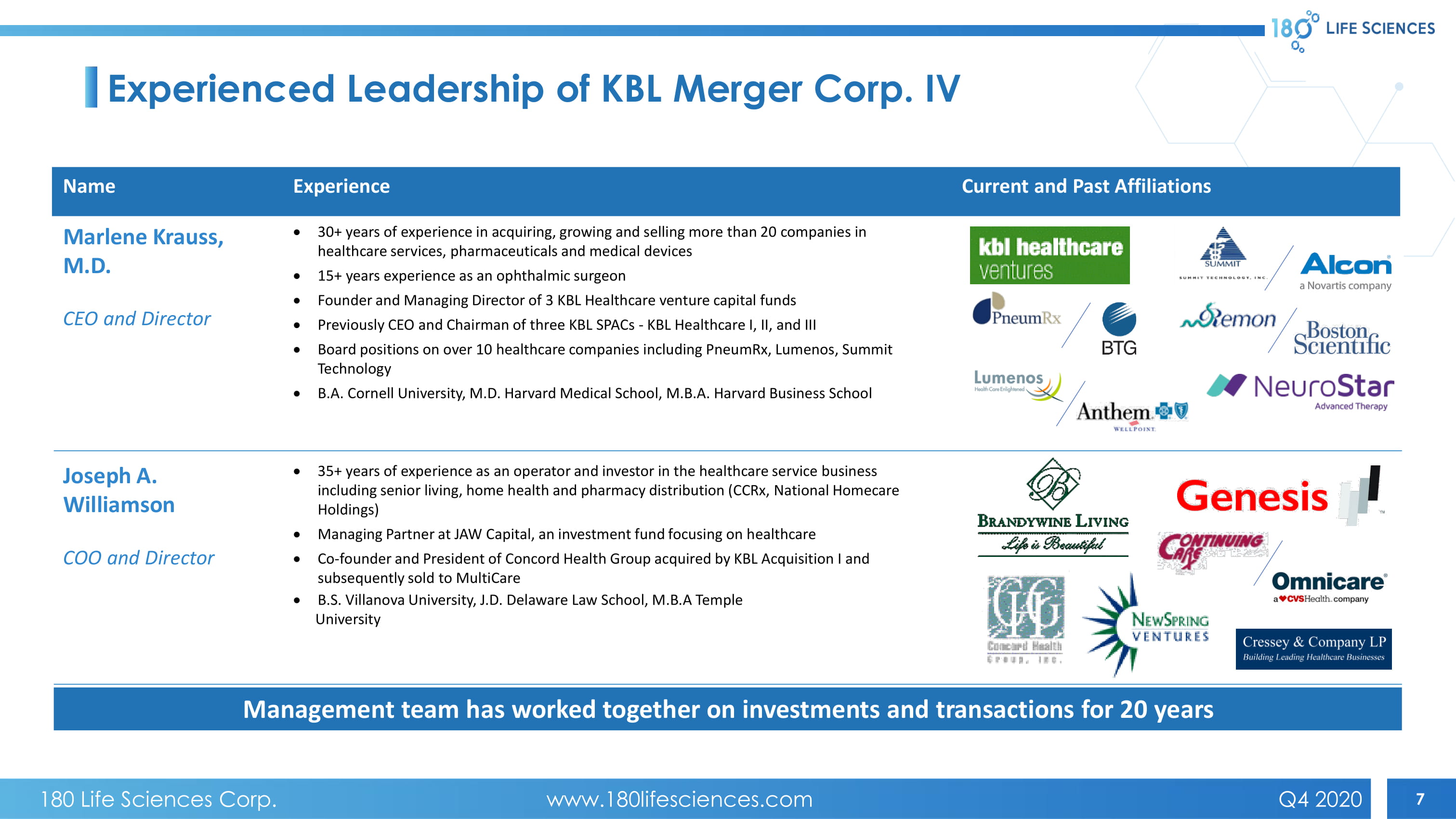 7 Management team has worked together on investments and transactions for 20 years Name Experience Current and Past Affiliations Marlene Krauss, M.D. CEO and Director 30+ years of experience in acquiring, growing and selling more than 20 companies in healthcare services, pharmaceuticals and medical devices 15+ years experience as an ophthalmic surgeon Founder and Managing Director of 3 KBL Healthcare venture capital funds Previously CEO and Chairman of three KBL SPACs - KBL Healthcare I, II, and III Board positions on over 10 healthcare companies including PneumRx , Lumenos , Summit Technology B.A. Cornell University, M.D. Harvard Medical School, M.B.A. Harvard Business School Joseph A. Williamson COO and Director 35+ years of experience as an operator and investor in the healthcare service business including senior living, home health and pharmacy distribution ( CCRx , National Homecare Holdings) Managing Partner at JAW Capital, an investment fund focusing on healthcare Co - founder and President of Concord Health Group acquired by KBL Acquisition I and subsequently sold to MultiCare B.S. Villanova University, J.D. Delaware Law School, M.B.A Temple University Experienced Leadership of KBL Merger Corp. IV 180 Life Sciences Corp. www.180lifesciences.com Q4 2020