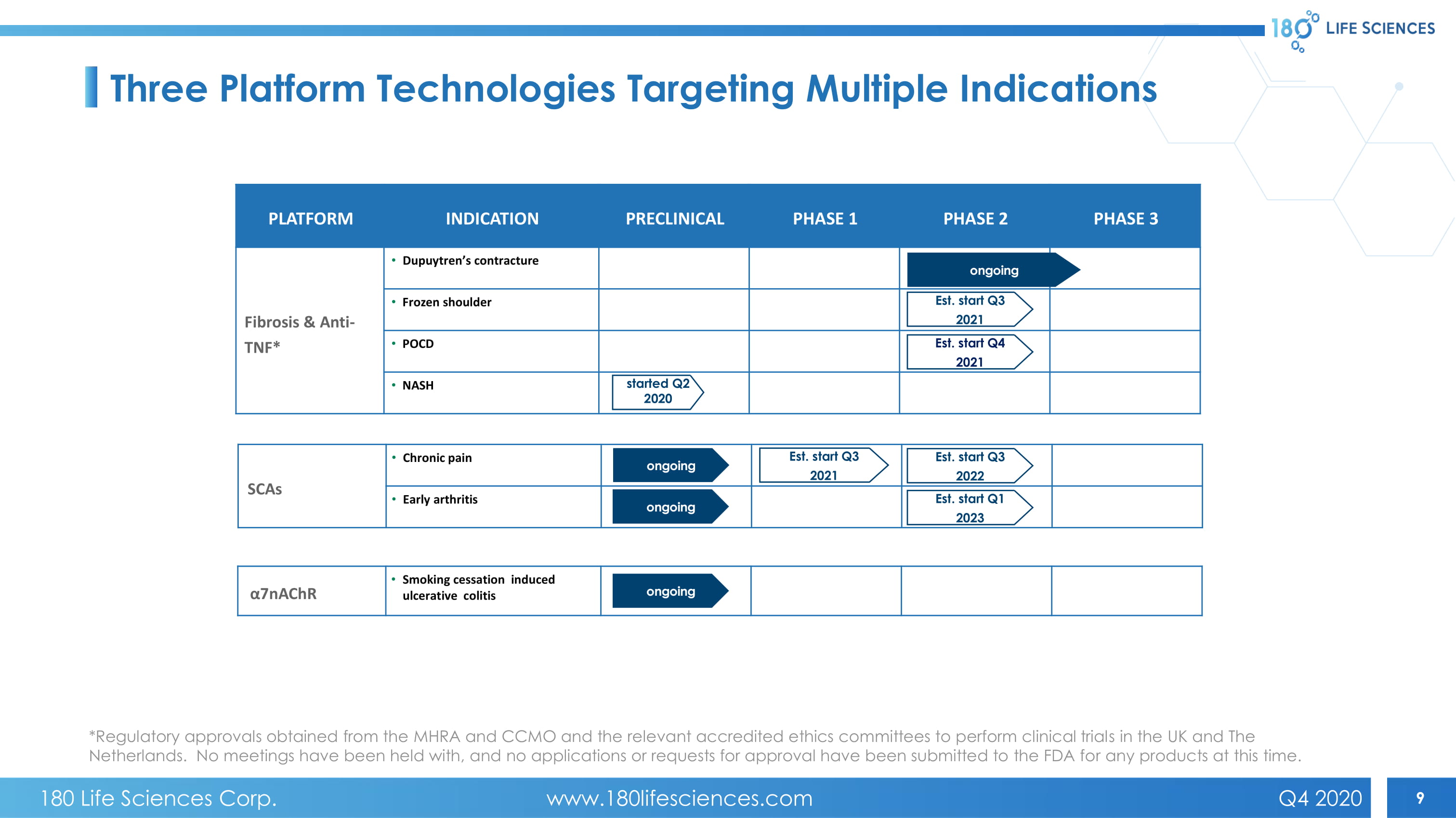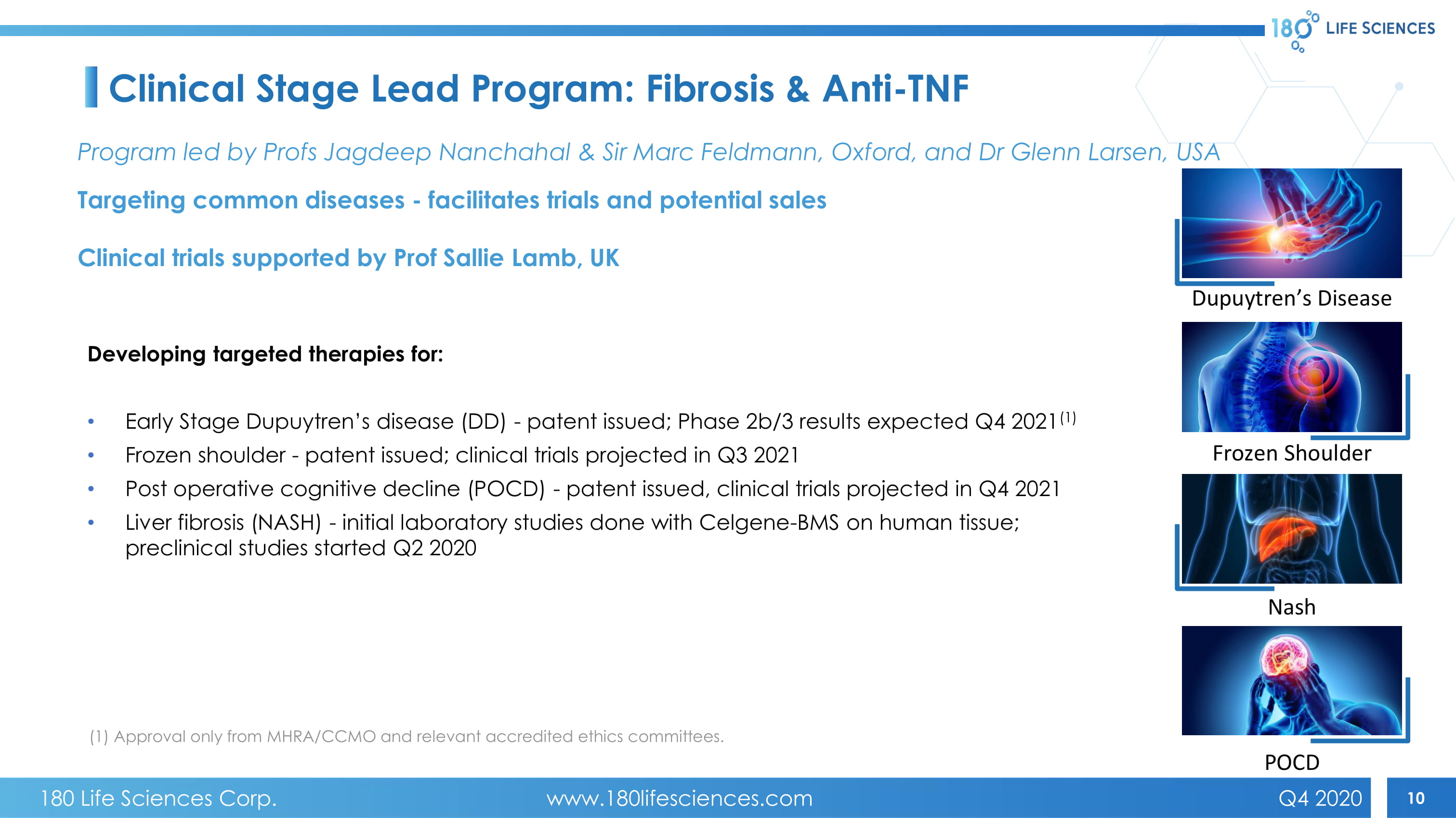 9 α7nAChR • Smoking cessation induced ulcerative colitis SCAs • Chronic pain • Early arthritis PLATFORM INDICATION PRECLINICAL PHASE 1 PHASE 2 PHASE 3 Fibrosis & Anti - TNF * • Dupuytren’s contracture • Frozen shoulder • PO C D • NASH Est. start Q1 2023 Est. start Q3 2022 started Q2 2020 Est. start Q3 2021 Est. start Q4 2021 ongoing ongoing ongoing ongoing Three Platform Technologies Targeting Multiple Indications Est. start Q3 2021 *Regulatory approvals obtained from the MHRA and CCMO and the relevant accredited ethics committees to perform clinical trial s i n the UK and The Netherlands. No meetings have been held with, and no applications or requests for approval have been submitted to the FDA fo r a ny products at this time. 180 Life Sciences Corp. www.180lifesciences.com Q4 2020