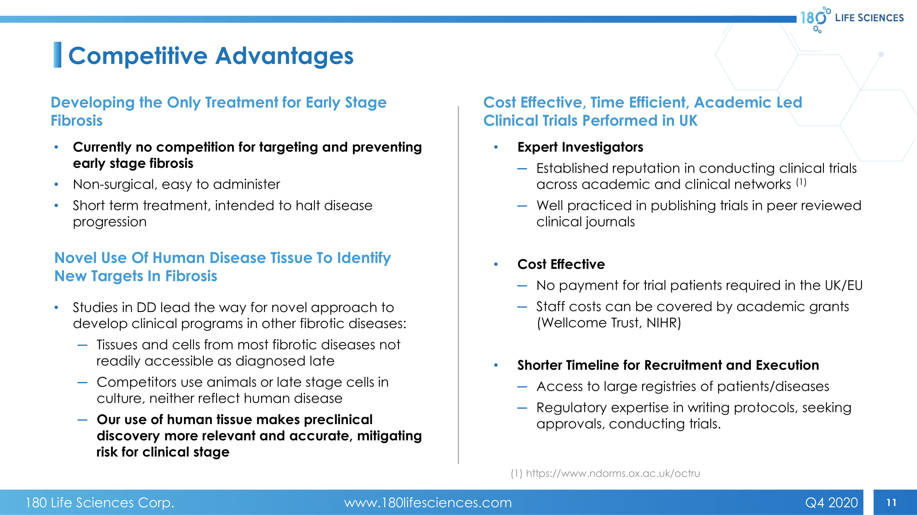 10 Clinical Stage Lead Program: Fibrosis & Anti - TNF Targeting common diseases - facilitates trials and potential sales Clinical trials supported by Prof Sallie Lamb, UK Developing targeted therapies for: • Early Stage Dupuytren’s disease (DD) - patent issued; Phase 2b/3 results expected Q4 2021 (1) • Frozen shoulder - patent issued; clinical trials projected in Q3 2021 • Post operative cognitive decline (POCD) - patent issued, clinical trials projected in Q4 2021 • Liver fibrosis (NASH) - initial laboratory studies done with Celgene - BMS on human tissue; preclinical studies started Q2 2020 (1) Approval only from MHRA/CCMO and relevant accredited ethics committees. Dupuytren’s Disease Frozen Shoulder Nash POCD Program led by Profs Jagdeep Nanchahal & Sir Marc Feldmann, Oxford, and Dr Glenn Larsen, USA 180 Life Sciences Corp. www.180lifesciences.com Q4 2020