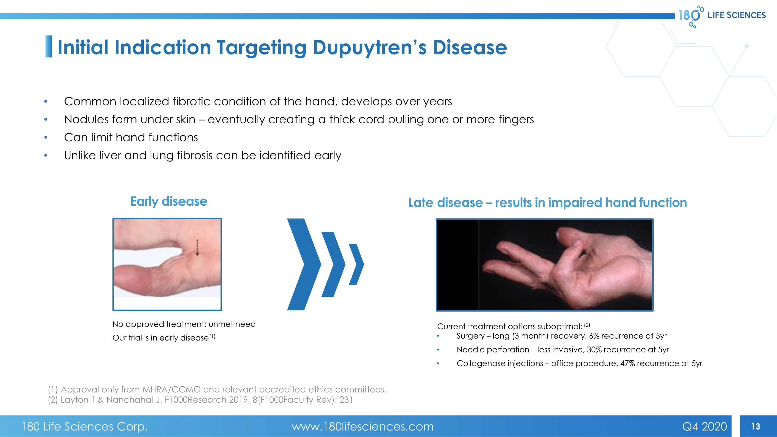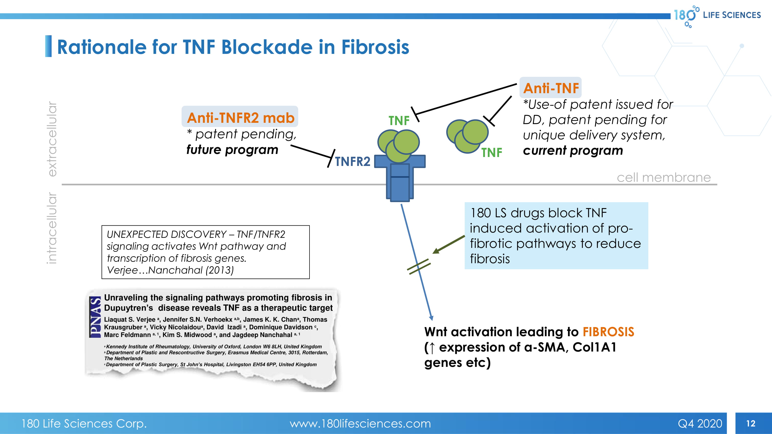 12 TNFR2 cell membrane extracellular intracellular Anti - TNF *Use - of patent issued for DD, patent pending for unique delivery system, current program TNF Anti - TNFR2 mab * patent pending, future program TNF Wnt activation leading to FIBROSIS (↑ expression of a - SMA, Col1A1 genes etc ) UNEXPECTED DISCOVERY – TNF/TNFR2 signaling activates Wnt pathway and transcription of fibrosis genes. Verjee…Nanchahal (2013) 180 LS drugs block TNF induced activation of pro - fibrotic pathways to reduce fibrosis Unraveling the signaling pathways promoting fibrosis in Dupuytren’s disease reveals TNF as a therapeutic target Liaquat S. Verjee a , Jennifer S.N. Verhoekx a,b , James K. K. Chan a , Thomas Krausgruber a , Vicky Nicolaidou a , David Izadi a , Dominique Davidson c , Marc Feldmann a, 1 , Kim S. Midwood a , and Jagdeep Nanchahal a, 1 a Kennedy Institute of Rheumatology, University of Oxford, London W6 8LH, United Kingdom b Department of Plastic and Rescontructive Surgery, Erasmus Medical Centre, 3015, Rotterdam, The Netherlands c Department of Plastic Surgery, St John’s Hospital, Livingston EH54 6PP, United Kingdom Rationale for TNF Blockade in Fibrosis 180 Life Sciences Corp. www.180lifesciences.com Q4 2020