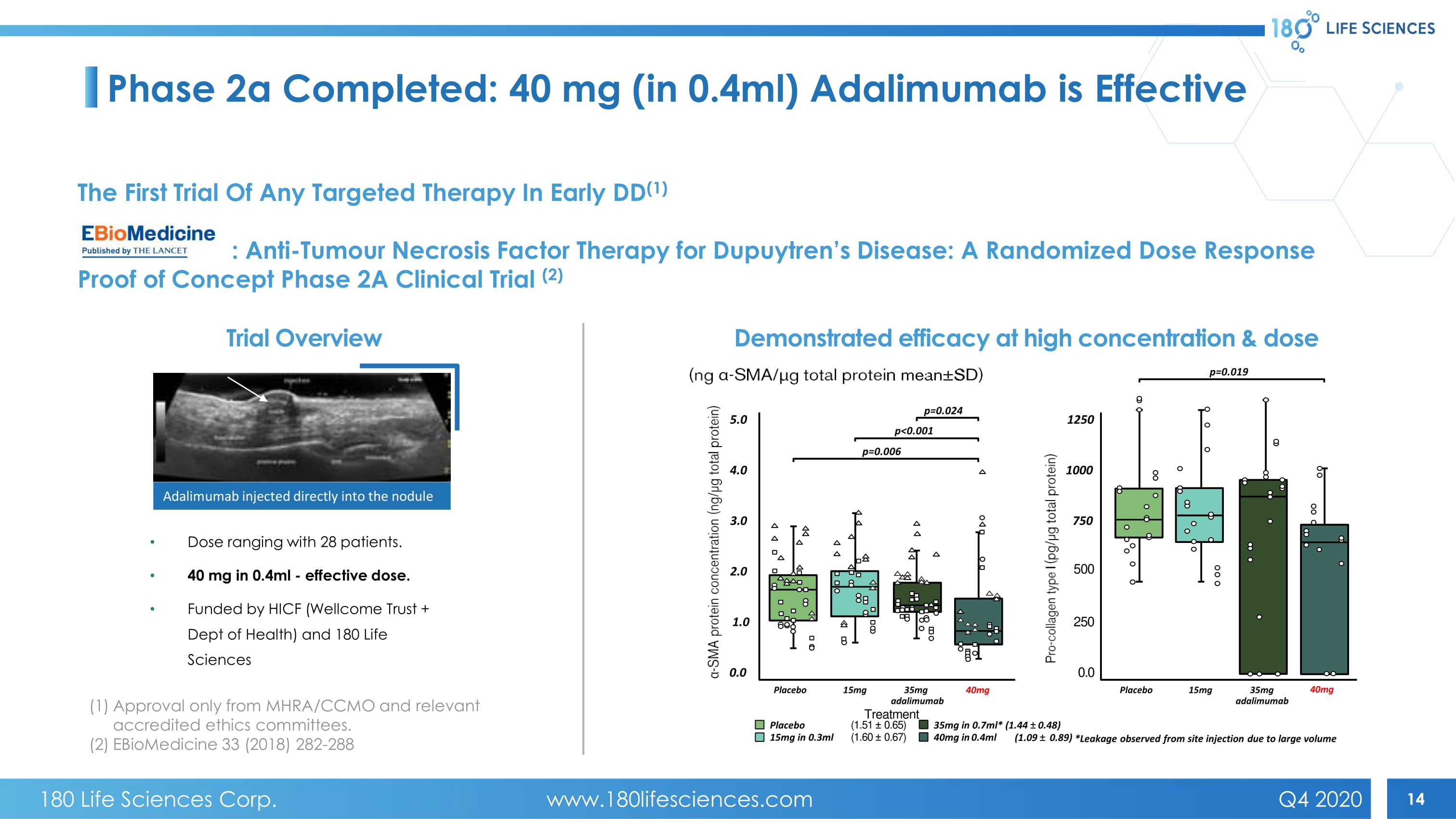 13 • Common localized fibrotic condition of the hand , develops over years • Nodules form under skin – eventually creating a thick cord pulling one or more fingers • Can limit hand functions • Unlike liver and lung fibrosis can be identified early Early disease Late disease – results in impaired hand function No approved treatment : unmet need Our trial is in early disease (1) Current treatment options suboptimal: (2) • Sur gery – long (3 month) recovery, 6% recurrence at 5yr • N eedle perforation – less invasive, 30% recurrence at 5yr • C ollagenase injections – office procedure, 47% recurrence at 5yr Initial Indication Targeting Dupuytren’s Disease (1) Approval only from MHRA/CCMO and relevant accredited ethics committees. (2) Layton T & Nanchahal J. F1000Research 2019, 8(F1000Faculty Rev): 231 180 Life Sciences Corp. www.180lifesciences.com Q4 2020