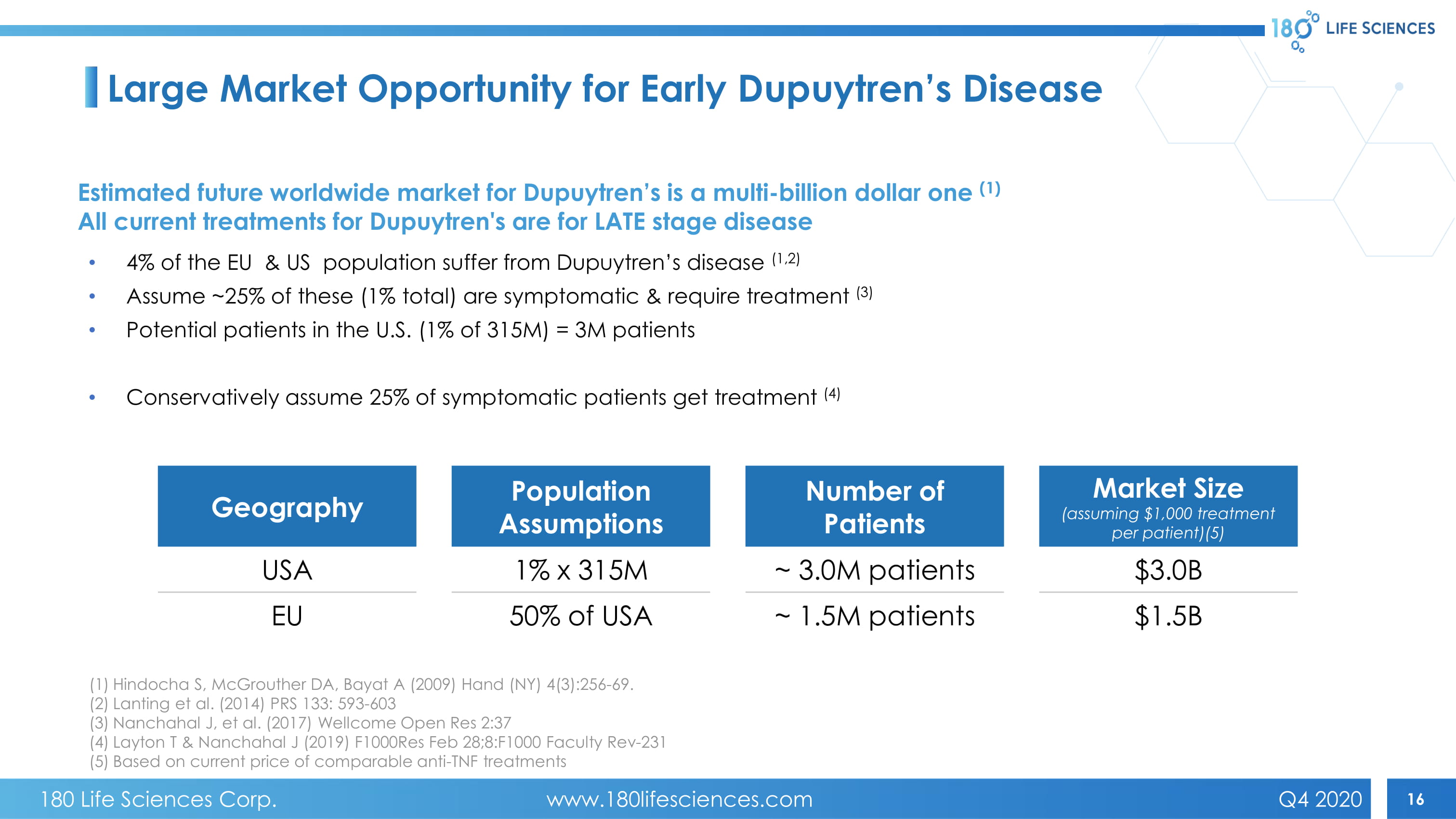 15 180 LIFE SCIENCES clinical trial 2b/3 - Nanchahal J et al, 2017 Wellcome Open Research, 2:37 Phase 2b/3 Trial Fully Enrolled – Local Adalimumab in Early DD • Randomized blinded trial in patients with early DD injected with optimal dose adalimumab (1) • Every 3 months for 1 year (4 injections), following for a total of 18 months • Outcome measures include nodule hardness, size and disease progression • Randomized 181 patients across 3 sites in UK and the Netherlands • FULLY ENROLLED, FULLY PAID FOR • All UK patients have received final injection • Results expected Q4 2021 • Trial sites: Oxford, Edinburgh, Groningen (1) Approval only from MHRA/CCMO and relevant accredited ethics committees. Primary Objective Secondary Objectives Tertiary Objectives To determine if injection with adalimumab is superior to placebo injection of normal saline in controlling disease progression. Hardness of selected nodule. 1. To compare the development of Dupuytren’s nodules and associated cord, flexion deformities of the fingers and impairment of hand function for participants on each treatment. 1.1. Ultrasound imaging of nodule size. 1.2. Range of motion of the affected digit. 1.3. Grip strength. 1.4. Participant Reported Outcomes: Michigan Hand Outcomes Questionnaire (MHQ) Participant identified activity most restricted by DD scored on a scale of 1 - 10. 1.5. Clinical assessment of the hand. 2.1. Adverse event assessment comparing active and placebo groups using visual inspection of injection site and laboratory reports. 2.2. Progression to surgery of the digit being assessed. 3. Analysis of health care resource utilisation data and EQ - 5D - 5L data to estimate cost and utilities from participants on each treatment. 4. Analysis of blood sample. 2. Monitor for adverse events. 3. To assess if early DD injection therapy represents good value for money compared to current clinical care. 4. Monitor circulating levels of adalimumab and antibodies to adalimumab in the blood. Objectives Outcome measures 180 Life Sciences Corp. www.180lifesciences.com Q4 2020
