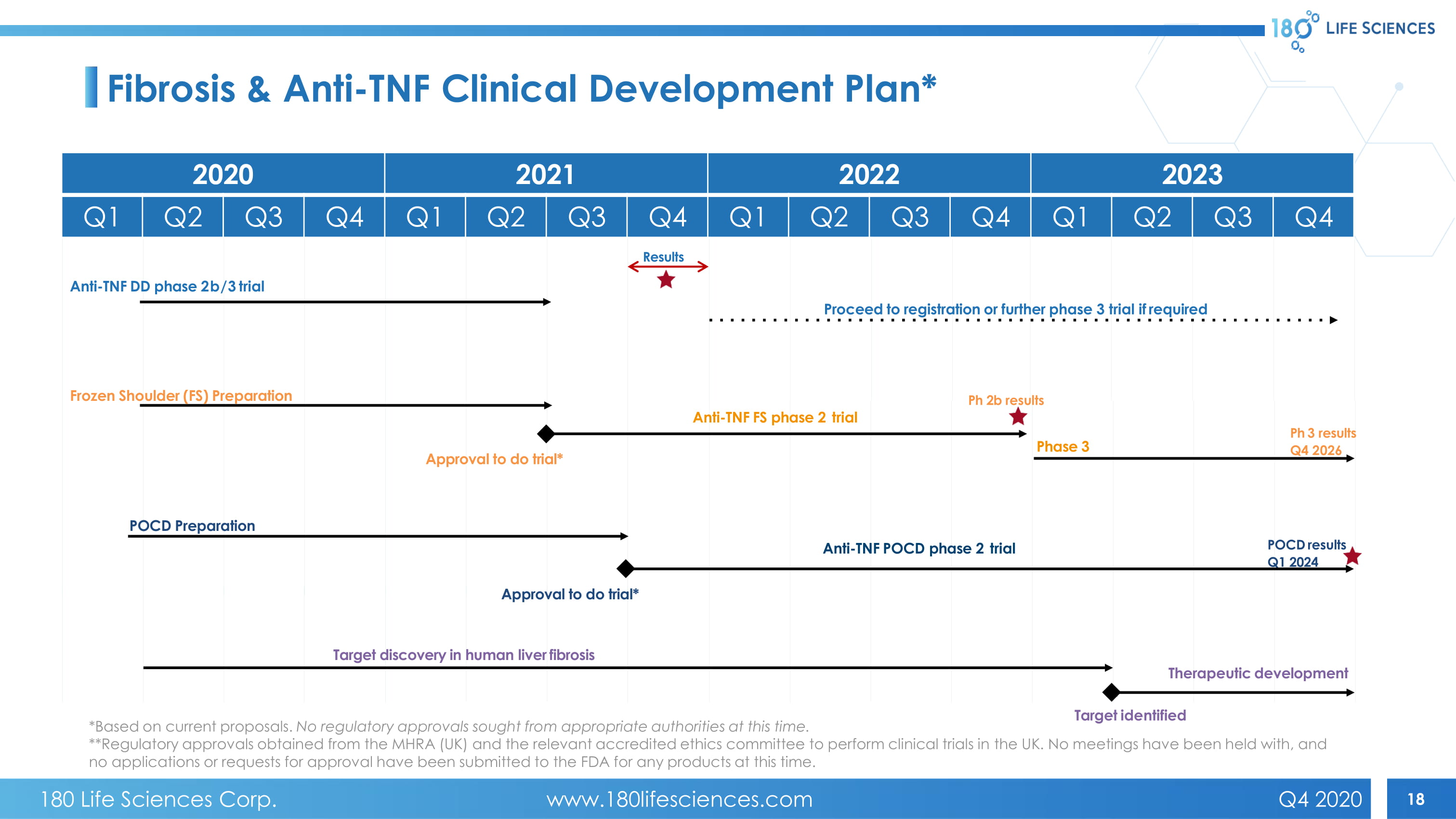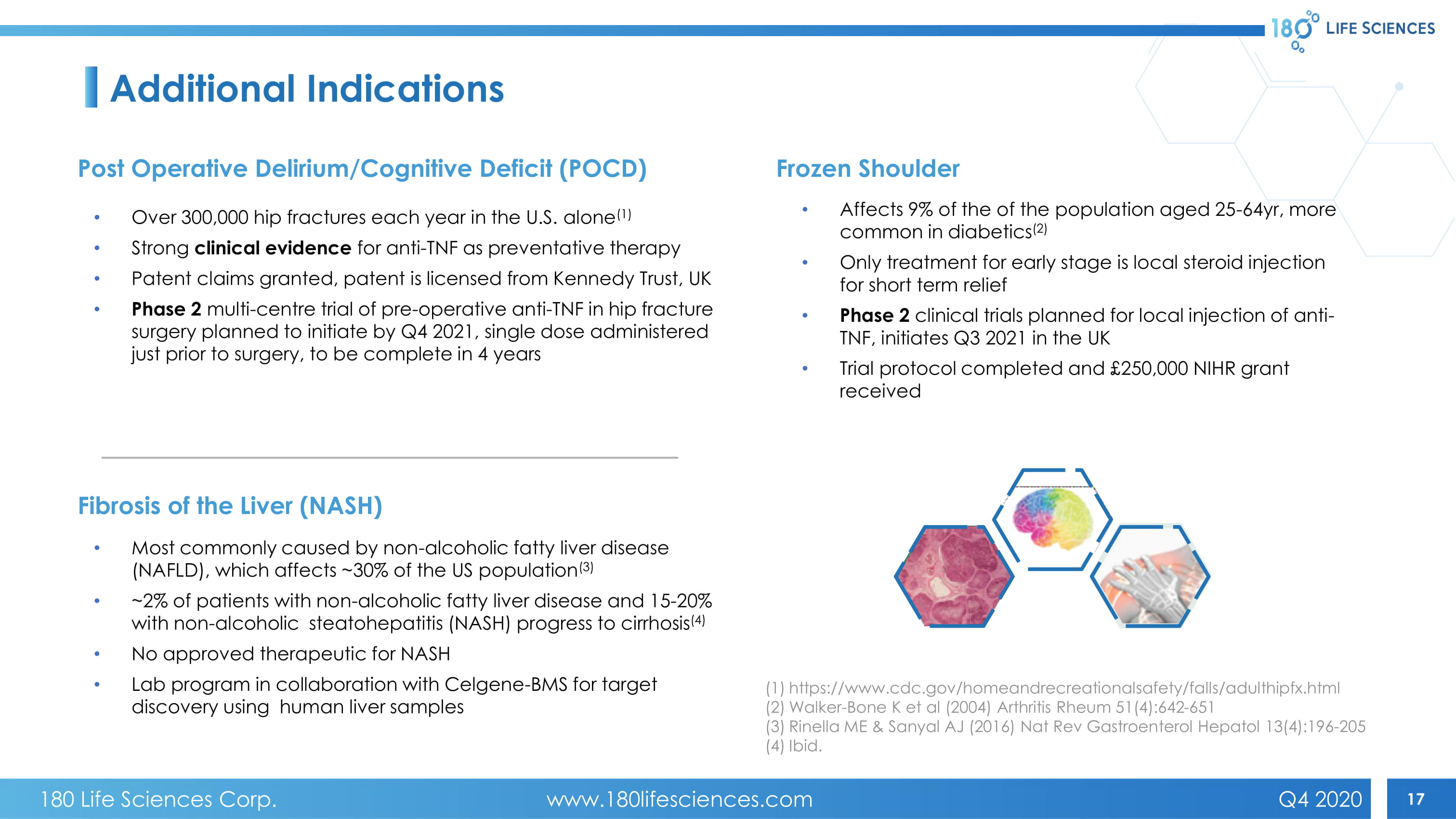 17 Additional Indications • Over 300,000 hip fractures each year in the U.S. alone (1) • Strong clinical evidence for anti - TNF as preventative therapy • Patent claims granted, patent is licensed from Kennedy Trust, UK • Phase 2 multi - centre trial of pre - operative anti - TNF in hip fracture surgery planned to initiate by Q4 2021, single dose administered just prior to surgery, to be complete in 4 years Post Operative Delirium/Cognitive Deficit (POCD) Frozen Shoulder • Affects 9% of the of the population aged 25 - 64yr, more common in diabetics (2) • Only treatment for early stage is local steroid injection for short term relief • Phase 2 clinical trials planned for local injection of anti - TNF, initiates Q3 2021 in the UK • Trial protocol completed and £250,000 NIHR grant received (1) https://www.cdc.gov/homeandrecreationalsafety/falls/adulthipfx.html (2) Walker - Bone K et al (2004) Arthritis Rheum 51(4):642 - 651 (3) Rinella ME & Sanyal AJ (2016) Nat Rev Gastroenterol Hepatol 13(4):196 - 205 (4) Ibid. Fibrosis of the Liver (NASH) • Most commonly caused by non - alcoholic fatty liver disease (NAFLD), which affects ~30% of the US population (3) • ~2% of patients with non - alcoholic fatty liver disease and 15 - 20% with non - alcoholic steatohepatitis (NASH) progress to cirrhosis (4) • No approved therapeutic for NASH • Lab program in collaboration with Celgene - BMS for target discovery using human liver samples 180 Life Sciences Corp. www.180lifesciences.com Q4 2020