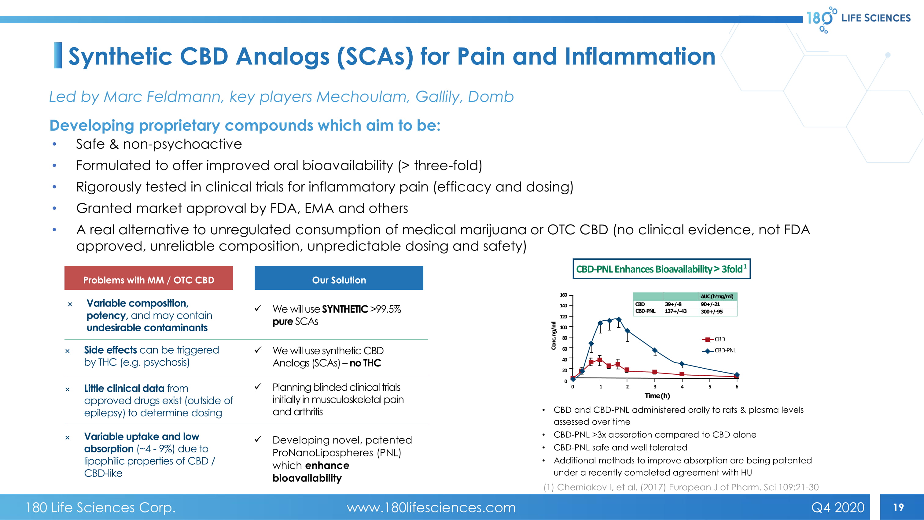 19 Synthetic CBD Analogs (SCAs) for Pain and Inflammation • Safe & non - psychoactive • Formulated to offer improved oral bioavailability (> three - fold) • Rigorously tested in clinical trials for inflammatory pain (efficacy and dosing) • Granted market approval by FDA, EMA and others • A real alternative to unregulated consumption of medical marijuana or OTC CBD (no clinical evidence, not FDA approved, unreliable composition, unpredictable dosing and safety) × Variable composition, potency, and may contain undesirable contaminants x We will use SYNTHETIC >99.5% pure SCAs Problems with MM / OTC CBD Our Solution × Side effects can be triggered by THC (e.g. psychosis) × Little clinical data from approved drugs exist (outside of epilepsy) to determine dosing × Variable uptake and low absorption (~4 - 9%) due to lipophilic properties of CBD / CBD - like x We will use synthetic CBD Analogs (SCAs) – no THC x P lanning blinded clinical trials initially in musculoskeletal pain and arthritis x Developing novel, patented ProNanoLipospheres (PNL) which enhance bioavailability • CBD and CBD - PNL administered orally to rats & plasma l evels assessed over time • CBD - PNL >3x absorption compared to CBD alone • CBD - PNL safe and well tolerated • Additional methods to improve absorption are being patented under a recently completed agreement with HU (1) Cherniakov I, et al. (2017) European J of Pharm. Sci 109:21 - 30 Led by Marc Feldmann, key players Mechoulam , Gallily , Domb Developing proprietary compounds which aim to be: 160 140 120 100 80 60 40 20 0 0 1 2 3 4 5 6 CBD CBD - PNL Time (h) Conc. ng/ml AUC (h*ng/ml) 90+/ - 21 300+/ - 95 39+/ - 8 137+/ - 43 CBD CBD - PNL CBD - PNL Enhances Bioavailability ! 3 fold 1 180 Life Sciences Corp. www.180lifesciences.com Q4 2020