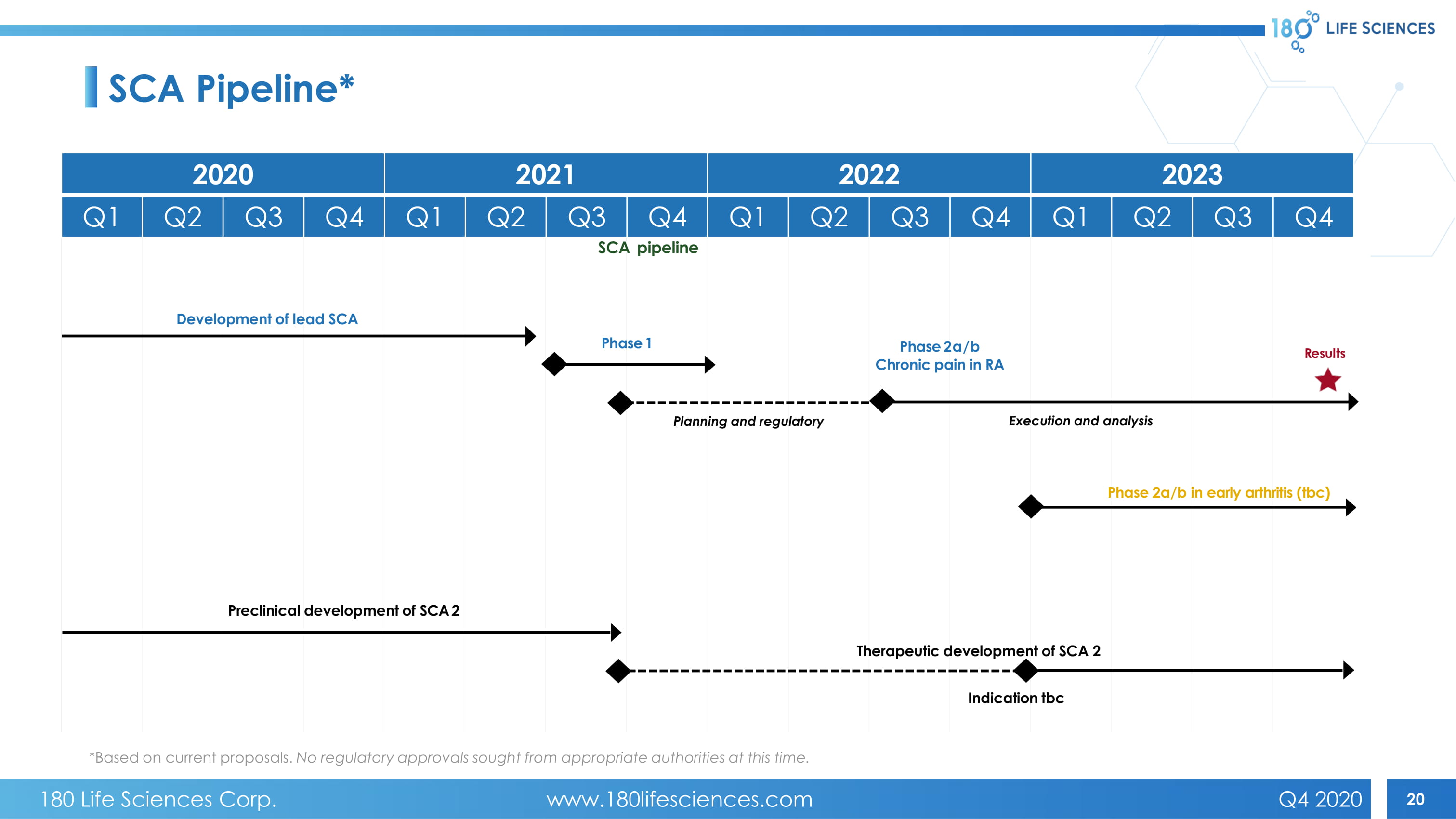 20 SCA Pipeline* Development of l ead SCA Phase 1 Phase 2a/b Chronic pain in RA R e s ul t s SCA pipeline Phase 2a/b in early arthritis (tbc) Therapeutic development of SCA 2 Preclinical development of SCA 2 Indication tbc 2020 2021 2022 2023 Q1 Q2 Q3 Q4 Q1 Q2 Q3 Q4 Q1 Q2 Q3 Q4 Q1 Q2 Q3 Q4 *Based on current proposals. No regulatory approvals sought from appropriate authorities at this time. Execution and analysis Planning and regulatory 180 Life Sciences Corp. www.180lifesciences.com Q4 2020
