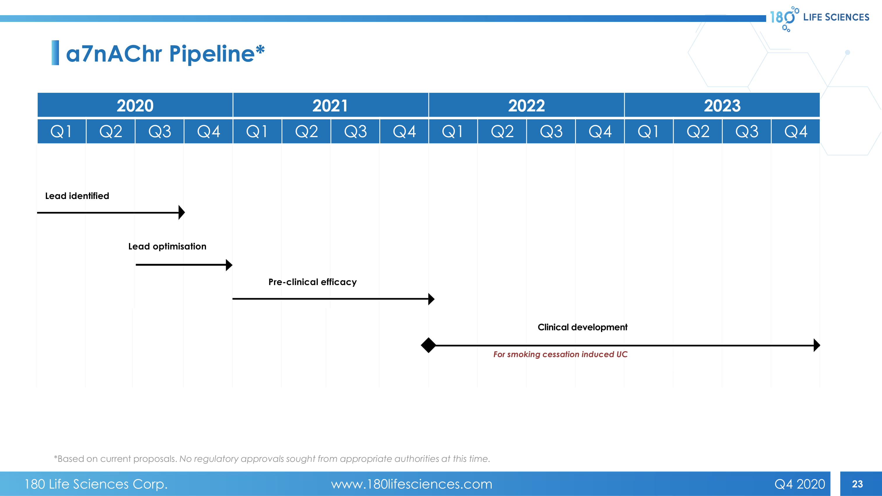 22 Faster Time to Market Lower Development Costs Targeted Clinical Trial Novel Therapeutic Target Significant Unmet Need Repurposing drugs previously proven safe (targeted Alzheimer’s & Schizophrenia) Drugs stimulate vagal nerve, leading to localized anti - inflammatory response, similar to nicotine’s MoA Existing therapies have occasional serious adverse effects and target the disease’s pathogenesis further downstream First clinical trial targeting patients who ceased smoking and developed ulcerative colitis Nicotine consumption protects against ulcerative colitis, lupus, and schizophrenia a7 nAChR Platform, a Novel Therapeutic Platform for UC Essential receptor in the neutral circuit controlled by the vagus nerve 180 Life Sciences Corp. www.180lifesciences.com Q4 2020