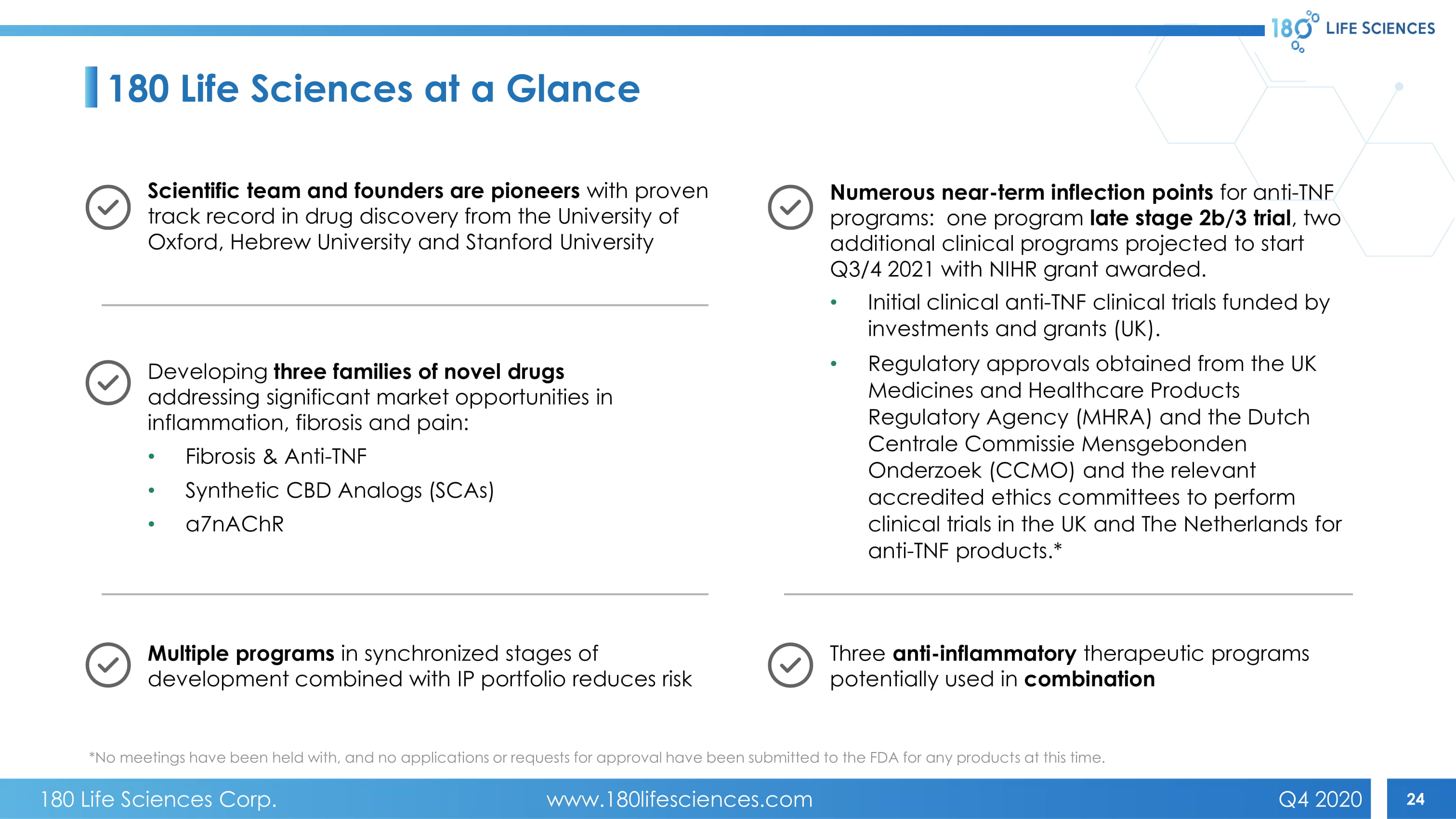 23 Pre - clinical efficacy Lead identified Lead optimisation Clinical development For smoking cessation induced UC a7nAChr Pipeline* 2020 2021 2022 2023 Q1 Q2 Q3 Q4 Q1 Q2 Q3 Q4 Q1 Q2 Q3 Q4 Q1 Q2 Q3 Q4 *Based on current proposals. No regulatory approvals sought from appropriate authorities at this time. 180 Life Sciences Corp. www.180lifesciences.com Q4 2020