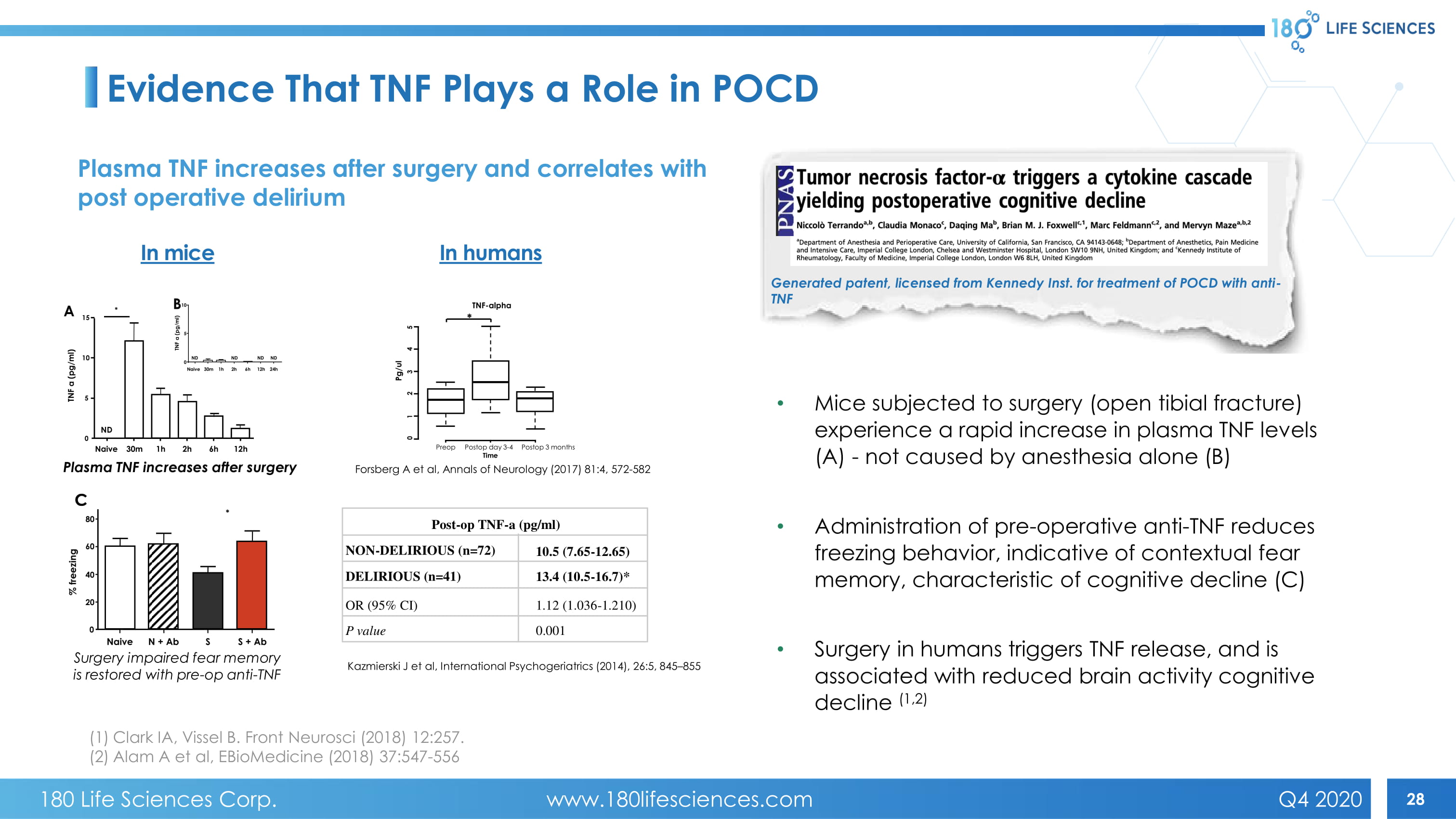 28 C Plasma TNF increases after surgery Surgery impaired fear memory is restored with pre - op anti - TNF Generated patent, licensed from Kennedy Inst. for treatment of POCD with anti - TNF Evidence That TNF Plays a Role in POCD In mice Forsberg A et al, Annals of Neurology (2017) 81:4, 572 - 582 Kazmierski J et al, International Psychogeriatrics (2014), 26:5, 845 – 855 In humans • Mice subjected to surgery (open tibial fracture) experience a rapid increase in plasma TNF levels (A) - not caused by anesthesia alone (B) • Administration of pre - operative anti - TNF reduces freezing behavior, indicative of contextual fear memory, characteristic of cognitive decline (C) • Surgery in humans triggers TNF release, and is associated with reduced brain activity cognitive decline (1,2) Plasma TNF increases after surgery and correlates with post operative delirium (1) Clark IA, Vissel B. Front Neurosci (2018) 12:257. (2) Alam A et al, EBioMedicine (2018) 37:547 - 556 Post - op TNF - a (pg/ml) NON - DELIRIOUS (n=72) DELIRIOUS (n=41) OR (95% CI) P value 10.5 (7.65 - 12.65) 13.4 (10.5 - 16.7)* 1.12 (1.036 - 1.210) 0.001 TNF - alpha Pg/ul Preop Postop day 3 - 4 Time Postop 3 months * 5 4 3 2 1 0 * A 15 10 5 0 Naive 30m 1h 2h 6h 12h TNF a (pg/ml) ND B TNF a (pg/ml) Naive 30m 1h 2h 6h 12h 24h 10 5 0 ND ND ND ND * 80 60 40 20 0 % freezing C Naive N + Ab S S + Ab 180 Life Sciences Corp. www.180lifesciences.com Q4 2020