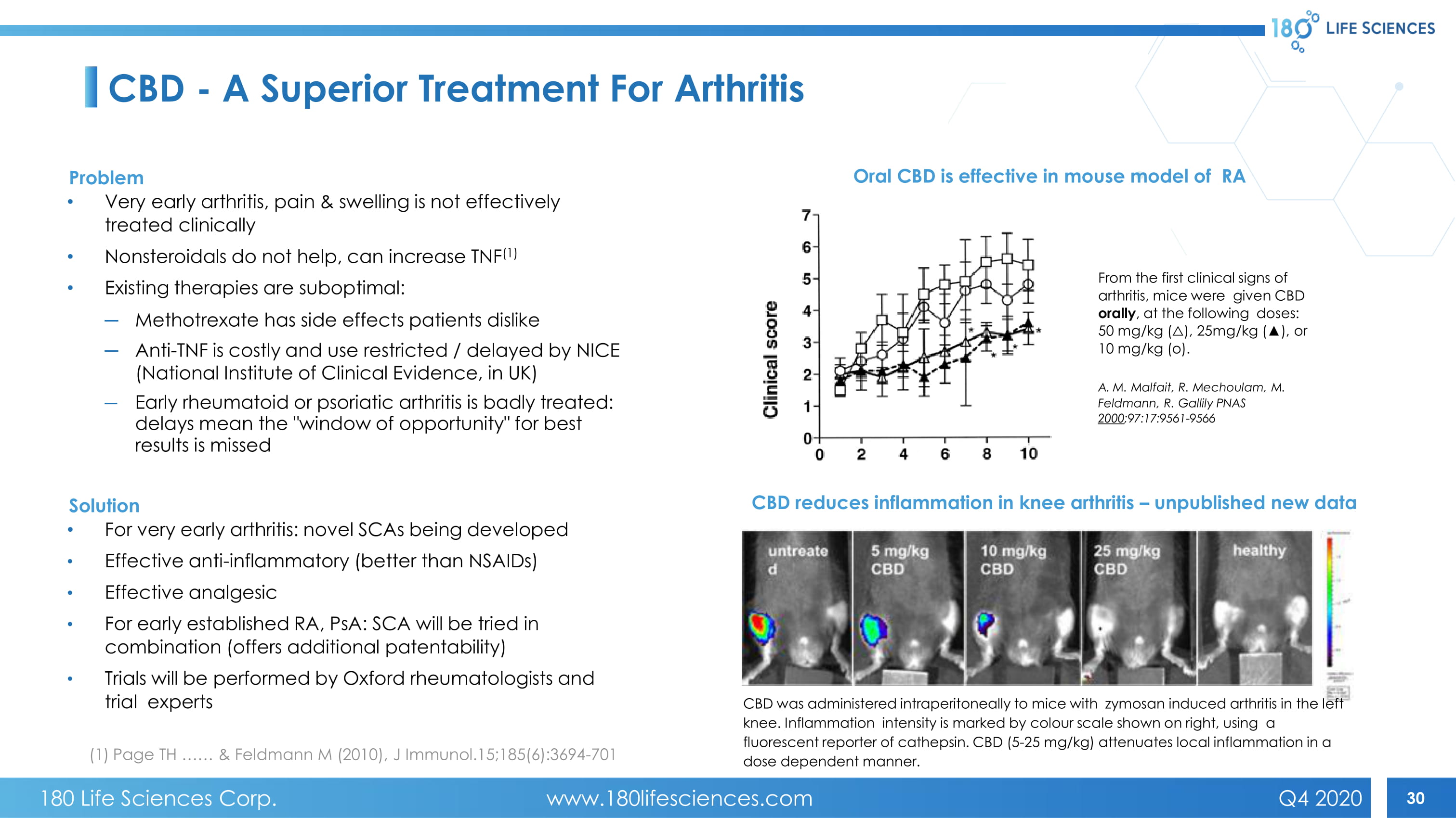 30 CBD - A Superior Treatment For Arthritis Problem • Very early arthritis, pain & swelling is not effectively treated clinically • Nonsteroidals do not help, can increase TNF (1) • Existing therapies are suboptimal: ─ Methotrexate has side effects patients dislike ─ Anti - TNF is costly and use restricted / delayed by NICE (National Institute of Clinical Evidence, in UK) ─ Early rheumatoid or psoriatic arthritis is badly treated: delays mean the " window of opportunity " for best results is missed Solution • For v ery early arthritis: novel SCAs being developed • Effective anti - inflammatory (better than NSAIDs) • Effective analgesic • For e arly established RA, PsA : SCA will be tried in combination (offers additional patentability) • Trials will be performed by Oxford rheumatologists and trial experts Oral CBD is effective in mouse model of RA From the first clinical signs of arthritis, mice were given CBD orally , at the following doses: 50 mg/kg ( ᇞ ), 25mg/kg ( Ÿ ), or 10 mg/kg (o). A. M. Malfait, R. Mechoulam , M. Feldmann, R. Gallily PNAS 2000 ;97:17:9561 - 9566 CBD reduces inflammation in knee arthritis – unpublished new data CBD was administered intraperitoneally to mice with zymosan induced arthritis in the left knee. Inflammation intensity is marked by colour scale shown on right, using a fluorescent reporter of cathepsin. CBD (5 - 25 mg/kg) attenuates local inflammation in a dose dependent manner. (1) Page TH …… & Feldmann M (2010), J Immunol.15;185(6):3694 - 701 180 Life Sciences Corp. www.180lifesciences.com Q4 2020