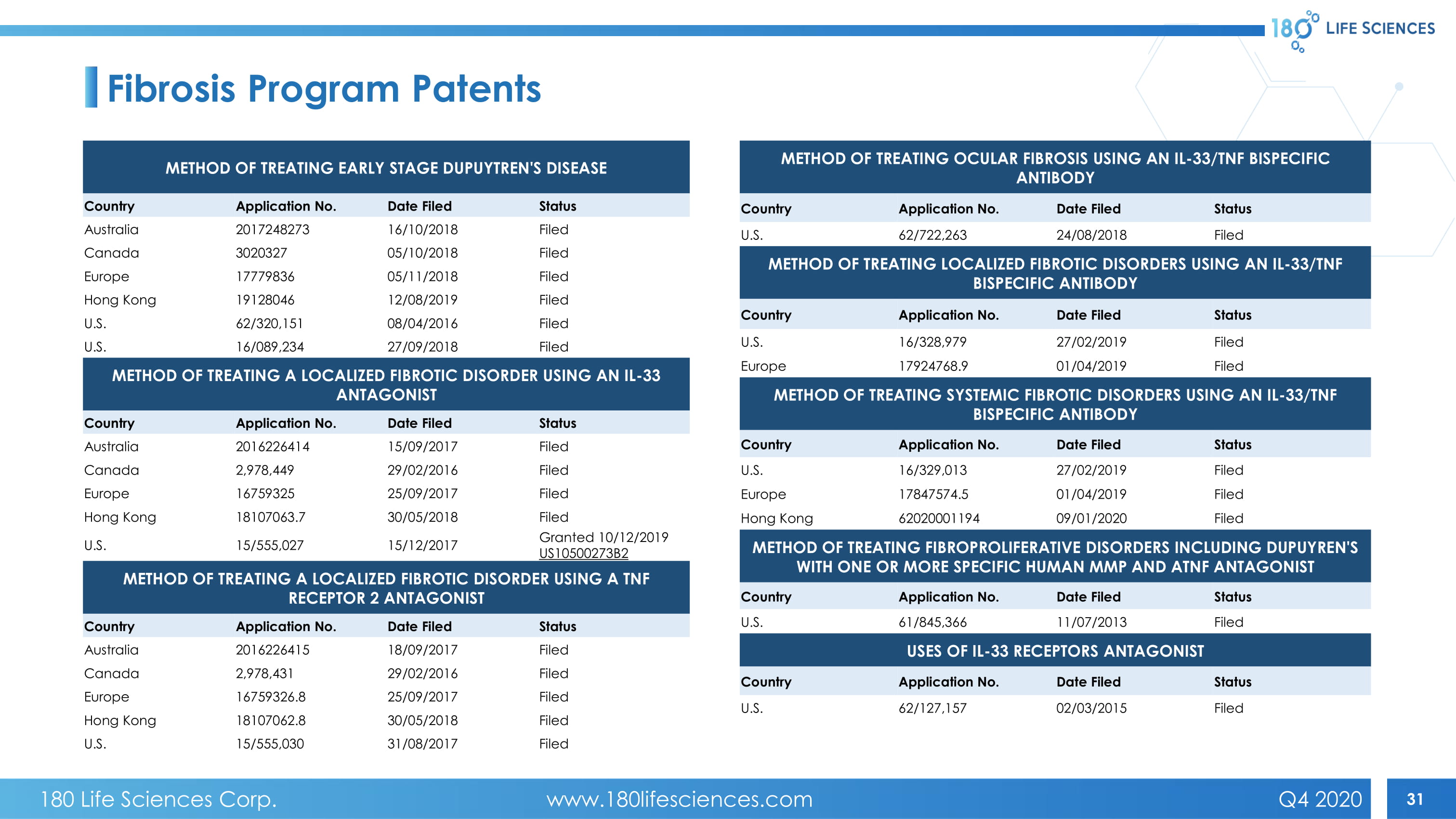 31 Fibrosis Program Patents METHOD OF TREATING EARLY STAGE DUPUYTREN'S DISEASE Country Application No. Date Filed Status Australia 2017248273 16/10/2018 Filed Canada 3020327 05/10/2018 Filed Europe 17779836 05/11/2018 Filed Hong Kong 19128046 12/08/2019 Filed U.S. 62/320,151 08/04/2016 Filed U.S. 16/089,234 27/09/2018 Filed METHOD OF TREATING A LOCALIZED FIBROTIC DISORDER USING AN IL - 33 ANTAGONIST Country Application No. Date Filed Status Australia 2016226414 15/09/2017 Filed Canada 2,978,449 29/02/2016 Filed Europe 16759325 25/09/2017 Filed Hong Kong 18107063.7 30/05/2018 Filed U.S. 15/555,027 15/12/2017 Granted 10/12/2019 US10500273B2 METHOD OF TREATING A LOCALIZED FIBROTIC DISORDER USING A TNF RECEPTOR 2 ANTAGONIST Country Application No. Date Filed Status Australia 2016226415 18/09/2017 Filed Canada 2,978,431 29/02/2016 Filed Europe 16759326.8 25/09/2017 Filed Hong Kong 18107062.8 30/05/2018 Filed U.S. 15/555,030 31/08/2017 Filed METHOD OF TREATING OCULAR FIBROSIS USING AN IL - 33/TNF BISPECIFIC ANTIBODY Country Application No. Date Filed Status U.S. 62/722,263 24/08/2018 Filed METHOD OF TREATING LOCALIZED FIBROTIC DISORDERS USING AN IL - 33/TNF BISPECIFIC ANTIBODY Country Application No. Date Filed Status U.S. 16/328,979 27/02/2019 Filed Europe 17924768.9 01/04/2019 Filed METHOD OF TREATING SYSTEMIC FIBROTIC DISORDERS USING AN IL - 33/TNF BISPECIFIC ANTIBODY Country Application No. Date Filed Status U.S. 16/329,013 27/02/2019 Filed Europe 17847574.5 01/04/2019 Filed Hong Kong 62020001194 09/01/2020 Filed METHOD OF TREATING FIBROPROLIFERATIVE DISORDERS INCLUDING DUPUYREN'S WITH ONE OR MORE SPECIFIC HUMAN MMP AND ATNF ANTAGONIST Country Application No. Date Filed Status U.S. 61/845,366 11/07/2013 Filed USES OF IL - 33 RECEPTORS ANTAGONIST Country Application No. Date Filed Status U.S. 62/127,157 02/03/2015 Filed 180 Life Sciences Corp. www.180lifesciences.com Q4 2020