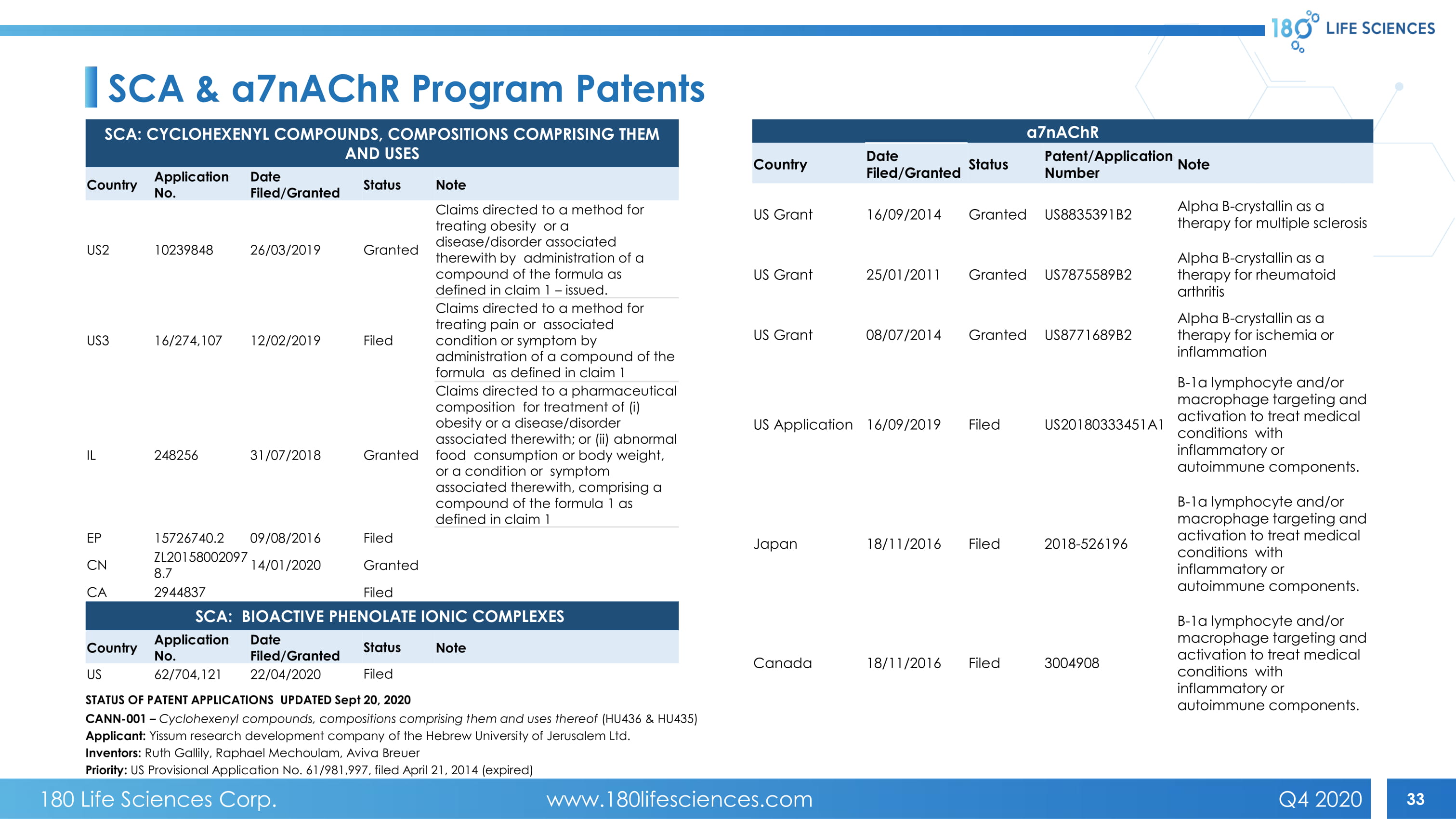 33 SCA & α7 nAChR Program Patents SCA: CYCLOHEXENYL COMPOUNDS, COMPOSITIONS COMPRISING THEM AND USES Country Application No. Date Filed/Granted Status Note US2 10239848 26/03/2019 Granted Claims directed to a method for treating obesity or a disease/disorder associated therewith by administration of a compound of the formula as defined in claim 1 – issued. US3 16/274,107 12/02/2019 Filed Claims directed to a method for treating pain or associated condition or symptom by administration of a compound of the formula as defined in claim 1 IL 248256 31/07/2018 Granted Claims directed to a pharmaceutical composition for treatment of (i) obesity or a disease/disorder associated therewith; or (ii) abnormal food consumption or body weight, or a condition or symptom associated therewith, comprising a compound of the formula 1 as defined in claim 1 EP 15726740.2 09/08/2016 Filed CN ZL20158002097 8.7 14/01/2020 Granted CA 2944837 Filed SCA: BIOACTIVE PHENOLATE IONIC COMPLEXES Country Application No. Date Filed/Granted Status Note US 62/704,121 22/04/2020 Filed α7 nAChR Country Date Filed/Granted Status Patent/Application Number Note US Grant 16/09/2014 Granted US8835391B2 Alpha B - crystallin as a therapy for multiple sclerosis US Grant 25/01/2011 Granted US7875589B2 Alpha B - crystallin as a therapy for rheumatoid arthritis US Grant 08/07/2014 Granted US8771689B2 Alpha B - crystallin as a therapy for ischemia or inflammation US Application 16/09/2019 Filed US20180333451A1 B - 1a lymphocyte and/or macrophage targeting and activation to treat medical conditions with inflammatory or autoimmune components. Japan 18/11/2016 Filed 2018 - 526196 B - 1a lymphocyte and/or macrophage targeting and activation to treat medical conditions with inflammatory or autoimmune components. Canada 18/11/2016 Filed 3004908 B - 1a lymphocyte and/or macrophage targeting and activation to treat medical conditions with inflammatory or autoimmune components. STATUS OF PATENT APPLICATIONS UPDATED Sept 20 , 2020 CANN - 001 – Cyclohexenyl compounds, compositions comprising them and uses thereof (HU436 & HU435) Applicant: Yissum research development company of the Hebrew University of Jerusalem Ltd. Inventors: Ruth Gallily , Raphael Mechoulam , Aviva Breuer Priority: US Provisional Application No. 61/981,997, filed April 21, 2014 (expired) 180 Life Sciences Corp. www.180lifesciences.com Q4 2020