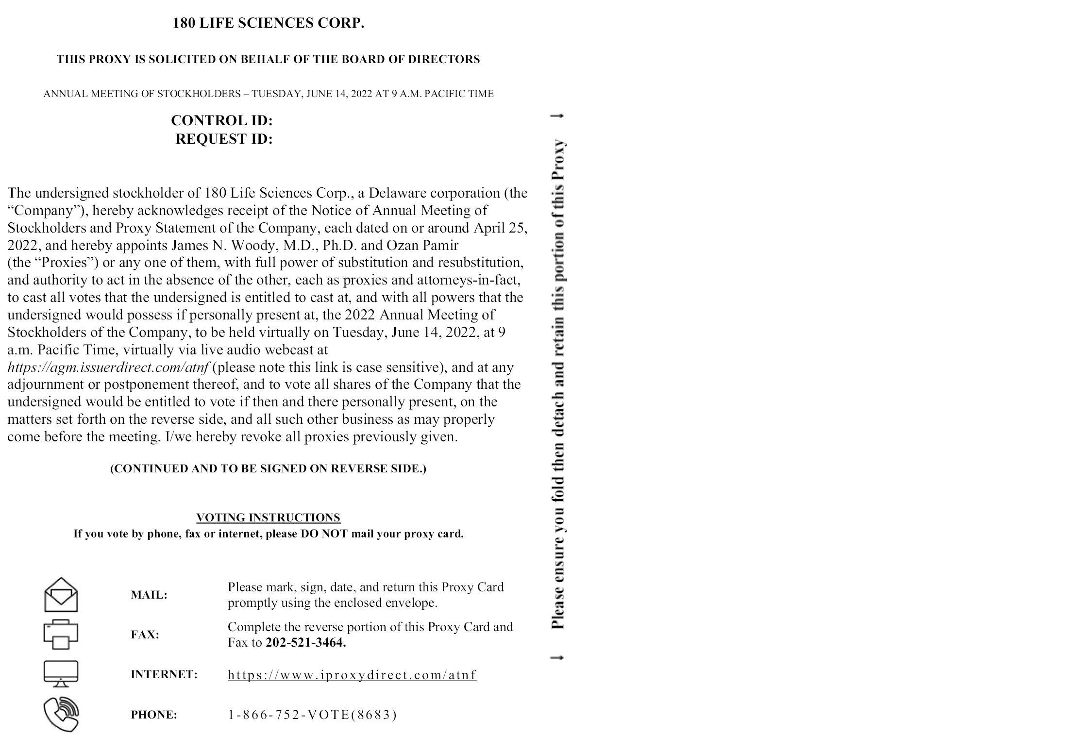 180 LIFE SCIENCES CORP. THIS PROXY IS SOLICITED ON BEHALF OF THE BOARD OF DIRECTORS ANNUAL MEETING OF STOCKHOLDERS – TUESDAY, JUNE 14, 2022 AT 9 A.M. PACIFIC TIME CONTROL ID: REQUEST ID: The undersigned stockholder of 180 Life Sciences Corp., a Delaware corporation (the “Company”), hereby acknowledges receipt of the Notice of Annual Meeting of Stockholders and Proxy Statement of the Company, each dated on or around April 25, 2022, and hereby appoints James N. Woody, M.D., Ph.D. and Ozan Pamir (the “Proxies”) or any one of them, with full power of substitution and resubstitution, and authority to act in the absence of the other, each as proxies and attorneys-in-fact, to cast all votes that the undersigned is entitled to cast at, and with all powers that the undersigned would possess if personally present at, the 2022 Annual Meeting of Stockholders of the Company, to be held virtually on Tuesday, June 14, 2022, at 9 a.m. Pacific Time, virtually via live audio webcast at https://agm.issuerdirect.com/atnf (please note this link is case sensitive), and at any adjournment or postponement thereof, and to vote all shares of the Company that the undersigned would be entitled to vote if then and there personally present, on the matters set forth on the reverse side, and all such other business as may properly come before the meeting. I/we hereby revoke all proxies previously given. (CONTINUED AND TO BE SIGNED ON REVERSE SIDE.) VOTING INSTRUCTIONS If you vote by phone, fax or internet, please DO NOT mail your proxy card. MAIL: Please mark, sign, date, and return this Proxy Card promptly using the enclosed envelope. FAX: Complete the reverse portion of this Proxy Card and Fax to 202-521-3464. INTERNET: https://www.iproxydirect.com/atnf PHONE: 1-866-752-VOTE(8683)
