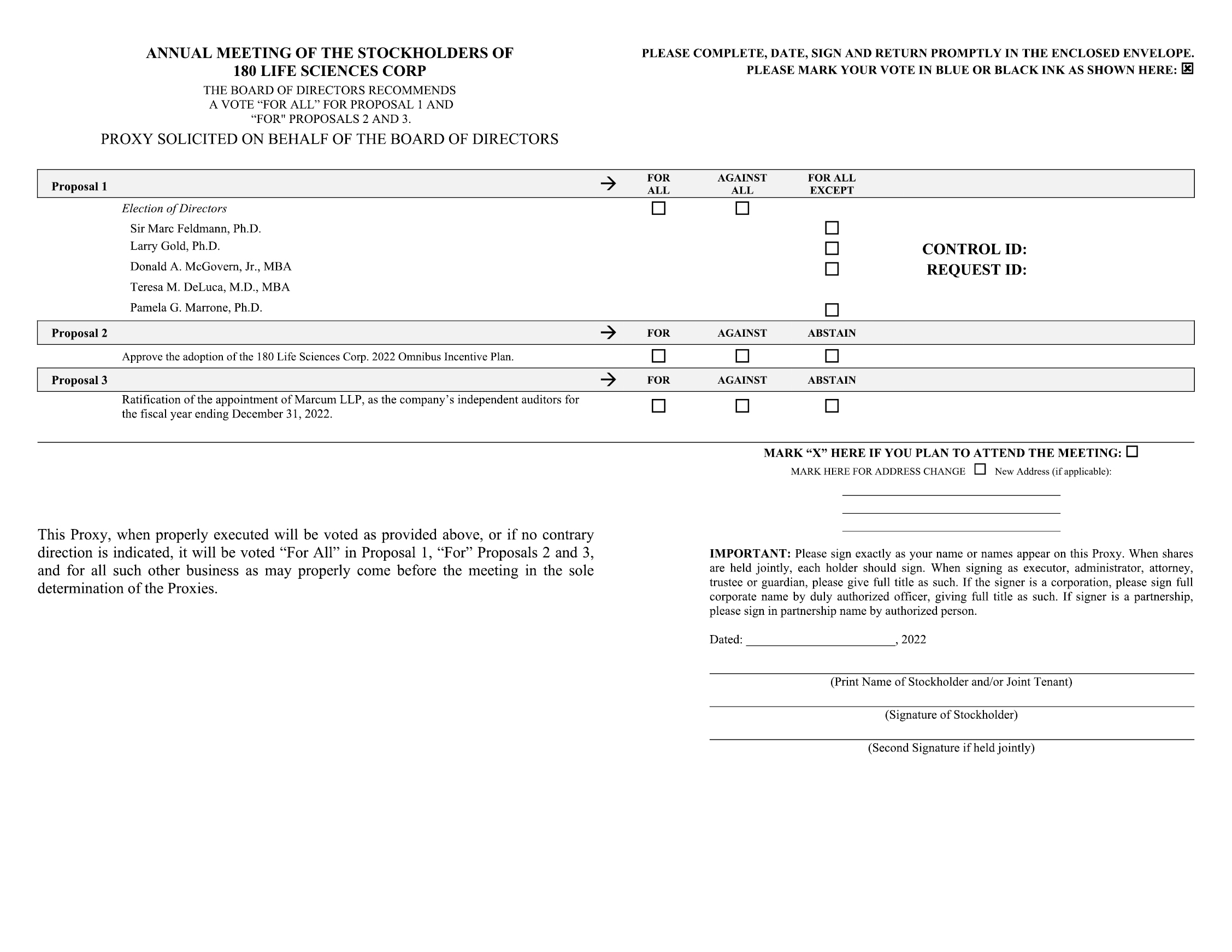 ANNUAL MEETING OF THE STOCKHOLDERS OF 180 LIFE SCIENCES CORP PLEASE COMPLETE, DATE, SIGN AND RETURN PROMPTLY IN THE ENCLOSED ENVELOPE. PLEASE MARK YOUR VOTE IN BLUE OR BLACK INK AS SHOWN HERE: THE BOARD OF DIRECTORS RECOMMENDS A VOTE “FOR ALL” FOR PROPOSAL 1 AND “FOR” PROPOSALS 2 AND 3. PROXY SOLICITED ON BEHALF OF THE BOARD OF DIRECTORS Proposal 1 FOR ALL AGAINST ALL FOR ALL EXCEPT Election of Directors • • Sir Marc Feldmann, Ph.D. • Larry Gold, Ph.D. • CONTROL ID: Donald A. McGovern, Jr., MBA • REQUEST ID: Teresa M. DeLuca, M.D., MBA Pamela G. Marrone, Ph.D. • Proposal 2 FOR AGAINST ABSTAIN Approve the adoption of the 180 Life Sciences Corp. 2022 Omnibus Incentive Plan. • • • Proposal 3 FOR AGAINST ABSTAIN Ratification of the appointment of Marcum LLP, as the company’s independent auditors for the fiscal year ending December 31, 2022. • • • MARK “X” HERE IF YOU PLAN TO ATTEND THE MEETING: • This Proxy, when properly executed will be voted as provided above, or if no contrary direction is indicated, it will be voted “For All” in Proposal 1, “For” Proposals 2 and 3, and for all such other business as may properly come before the meeting in the sole determination of the Proxies. MARK HERE FOR ADDRESS CHANGE • New Address (if applicable): IMPORTANT: Please sign exactly as your name or names appear on this Proxy. When shares are held jointly, each holder should sign. When signing as executor, administrator, attorney, trustee or guardian, please give full title as such. If the signer is a corporation, please sign full corporate name by duly authorized officer, giving full title as such. If signer is a partnership, please sign in partnership name by authorized person. Dated:, 2022 (Print Name of Stockholder and/or Joint Tenant) (Signature of Stockholder) (Second Signature if held jointly)