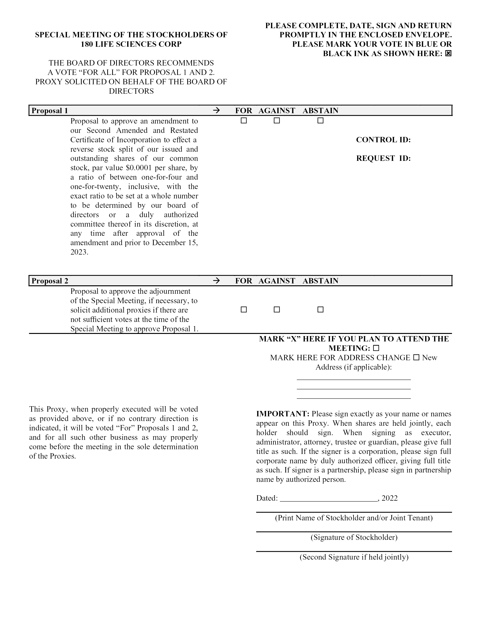 SPECIAL MEETING OF THE STOCKHOLDERS OF 180 LIFE SCIENCES CORP PLEASE COMPLETE, DATE, SIGN AND RETURN PROMPTLY IN THE ENCLOSED ENVELOPE. PLEASE MARK YOUR VOTE IN BLUE OR BLACK INK AS SHOWN HERE: THE BOARD OF DIRECTORS RECOMMENDS A VOTE “FOR ALL” FOR PROPOSAL 1 AND 2. PROXY SOLICITED ON BEHALF OF THE BOARD OF DIRECTORS Proposal 1 FORAGAINST ABSTAIN Proposal to approve an amendment to our Second Amended and Restated Certificate of Incorporation to effect a reverse stock split of our issued and outstanding shares of our common stock, par value $0.0001 per share, by a ratio of between one-for-four and one-for-twenty, inclusive, with the exact ratio to be set at a whole number to be determined by our board of directors or a duly authorized committee thereof in its discretion, at any time after approval of the amendment and prior to December 15, 2023. CONTROL ID: REQUEST ID: Proposal 2 FORAGAINST ABSTAIN Proposal to approve the adjournment of the Special Meeting, if necessary, to solicit additional proxies if there are not sufficient votes at the time of the Special Meeting to approve Proposal 1. MARK “X” HERE IF YOU PLAN TO ATTEND THE MEETING: This Proxy, when properly executed will be voted as provided above, or if no contrary direction is indicated, it will be voted “For” Proposals 1 and 2, and for all such other business as may properly come before the meeting in the sole determination of the Proxies. MARK HERE FOR ADDRESS CHANGE New Address (if applicable): IMPORTANT: Please sign exactly as your name or names appear on this Proxy. When shares are held jointly, each holder should sign. When signing as executor, administrator, attorney, trustee or guardian, please give full title as such. If the signer is a corporation, please sign full corporate name by duly authorized officer, giving full title as such. If signer is a partnership, please sign in partnership name by authorized person. Dated: , 2022 (Print Name of Stockholder and/or Joint Tenant) (Signature of Stockholder) (Second Signature if held jointly)