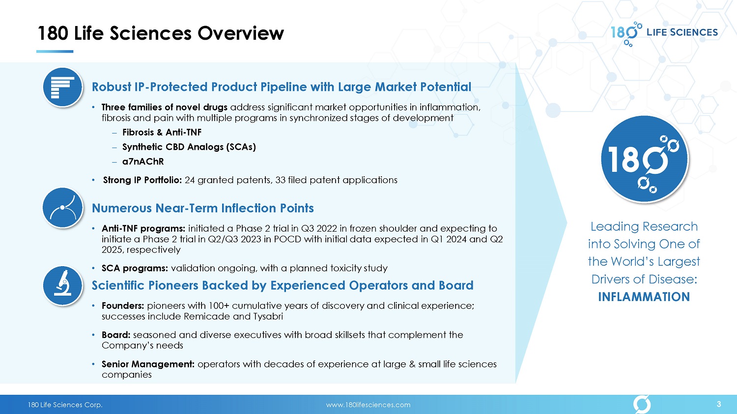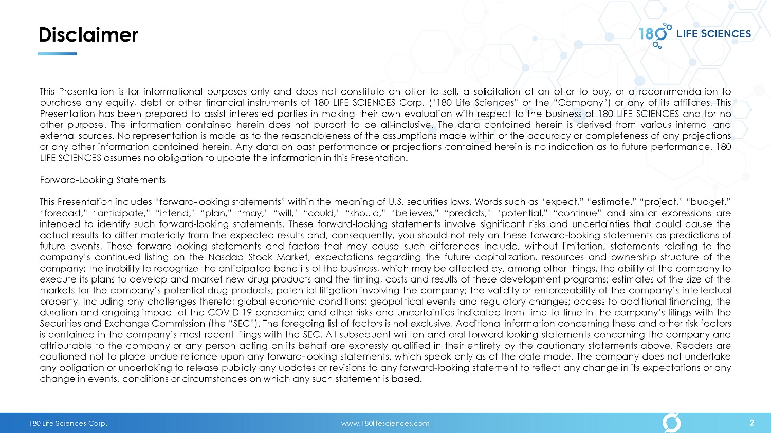 180 Life Sciences Corp. www.180lifesciences.com This Presentation is for informational purposes only and does not constitute an offer to sell, a solicitation of an offer to buy, or a recommendation to purchase any equity, debt or other financial instruments of 180 LIFE SCIENCES Corp . (“ 180 Life Sciences” or the “Company”) or any of its affiliates . This Presentation has been prepared to assist interested parties in making their own evaluation with respect to the business of 180 LIFE SCIENCES and for no other purpose . The information contained herein does not purport to be all - inclusive . The data contained herein is derived from various internal and external sources . No representation is made as to the reasonableness of the assumptions made within or the accuracy or completeness of any projections or any other information contained herein . Any data on past performance or projections contained herein is no indication as to future performance . 180 LIFE SCIENCES assumes no obligation to update the information in this Presentation . Forward - Looking Statements This Presentation includes “forward - looking statements” within the meaning of U . S . securities laws . Words such as “expect,” “estimate,” “project,” “budget,” “forecast,” “anticipate,” “intend,” “plan,” “may,” “will,” “could,” “should,” “believes,” “predicts,” “potential,” “continue” and similar expressions are intended to identify such forward - looking statements . These forward - looking statements involve significant risks and uncertainties that could cause the actual results to differ materially from the expected results and, consequently, you should not rely on these forward - looking statements as predictions of future events . These forward - looking statements and factors that may cause such differences include, without limitation, statements relating to the company’s continued listing on the Nasdaq Stock Market ; expectations regarding the future capitalization, resources and ownership structure of the company ; the inability to recognize the anticipated benefits of the business, which may be affected by, among other things, the ability of the company to execute its plans to develop and market new drug products and the timing, costs and results of these development programs ; estimates of the size of the markets for the company’s potential drug products ; potential litigation involving the company ; the validity or enforceability of the company’s intellectual property, including any challenges thereto ; global economic conditions ; geopolitical events and regulatory changes ; access to additional financing ; the duration and ongoing impact of the COVID - 19 pandemic ; and other risks and uncertainties indicated from time to time in the company’s filings with the Securities and Exchange Commission (the “SEC”) . The foregoing list of factors is not exclusive . Additional information concerning these and other risk factors is contained in the company’s most recent filings with the SEC . All subsequent written and oral forward - looking statements concerning the company and attributable to the company or any person acting on its behalf are expressly qualified in their entirety by the cautionary statements above . Readers are cautioned not to place undue reliance upon any forward - looking statements, which speak only as of the date made . The company does not undertake any obligation or undertaking to release publicly any updates or revisions to any forward - looking statement to reflect any change in its expectations or any change in events, conditions or circumstances on which any such statement is based . Disclaimer 2