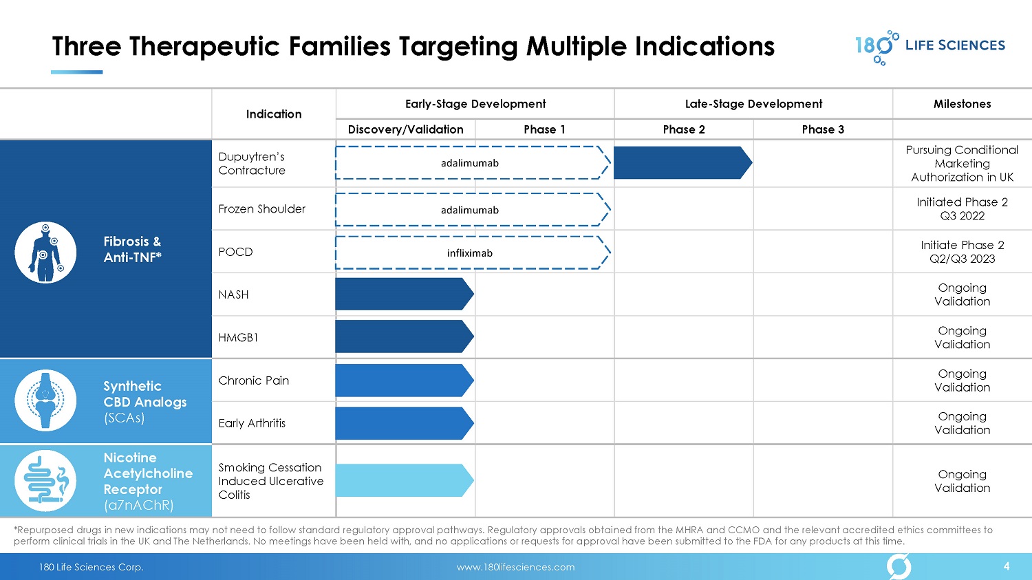 180 Life Sciences Corp. www.180lifesciences.com 180 Life Sciences Overview Leading Research into Solving One of the World’s Largest Drivers of Disease: INFLAMMATION 3 Robust IP - Protected Product Pipeline with Large Market Potential • Three families of novel drugs address significant market opportunities in inflammation, fibrosis and pain with multiple programs in synchronized stages of development ⎼ Fibrosis & Anti - TNF ⎼ Synthetic CBD Analogs (SCAs) ⎼ a7nAChR • Strong IP Portfolio: 24 granted patents, 33 filed patent applications Scientific Pioneers Backed by Experienced Operators and Board • Founders: pioneers with 100+ cumulative years of discovery and clinical experience; successes include Remicade and Tysabri • Board: seasoned and diverse executives with broad skillsets that complement the Company’s needs • Senior Management: operators with decades of experience at large & small life sciences companies Numerous Near - Term Inflection Points • Anti - TNF programs: initiated a Phase 2 trial in Q3 2022 in frozen shoulder and expecting to initiate a Phase 2 trial in Q2/Q3 2023 in POCD with initial data expected in Q1 2024 and Q2 2025, respectively • SCA programs: validation ongoing, with a planned toxicity study