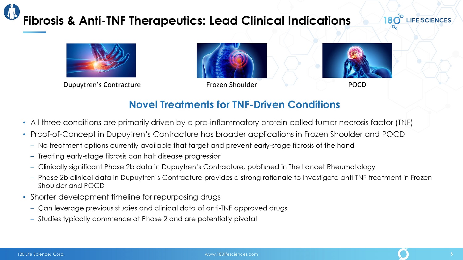 180 Life Sciences Corp. www.180lifesciences.com 5 Frank Knuettel II, MBA Independent Director Pamela Marrone, PhD Independent Director Prof. Larry Gold, PhD Independent Director Donald McGovern, Jr. Independent Director Russell Ray, MBA Independent Director Teresa DeLuca, MD, MBA Independent Director James Woody, MD, PhD Director, CEO Prof. Sir Marc Feldmann Executive Co - Chairman Co - Founder University of Oxford Prof. Lawrence Steinman Executive Co - Chairman Co - Founder Stanford University Jonathan Rothbard, PhD Chief Scientific Officer Prof. Jagdeep Nanchahal Co - Founder; Chair, Clinical Advisory Board University of Oxford Prof . Raphael Mechoulam Co - Founder Hebrew University Ozan Pamir Chief Financial Officer Management Team Board of Directors James Woody, MD, PhD Chief Executive Officer Prof. Sir Marc Feldmann Co - Chairman Prof. Lawrence Steinman Co - Chairman Experienced Leadership Team Founders