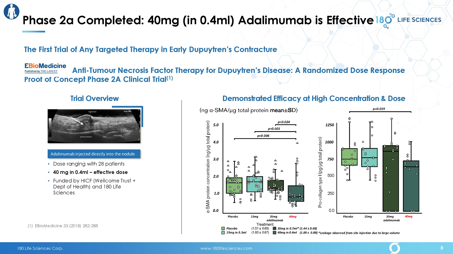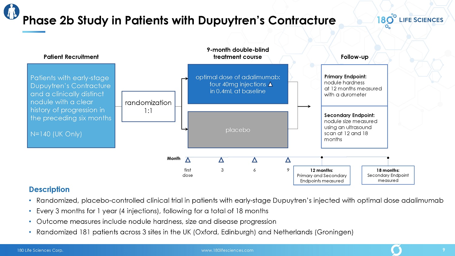 180 Life Sciences Corp. www.180lifesciences.com Phase 2a Completed: 40mg (in 0.4ml) Adalimumab is Effective • Dose ranging with 28 patients • 40 mg in 0.4ml – effective dose • Funded by HICF (Wellcome Trust + Dept of Health) and 180 Life Sciences Trial Overview Adalimumab injected directly into the nodule Demonstrated Efficacy at High C oncentration & D ose 15mg in 0.3ml (1.60 0.67) 40mg in 0.4ml Placebo (1.51 0.65) 35mg in 0.7ml* (1.44 0.48) (1.09 0.89) *Leakage observed from site injection due to large volume 5.0 4.0 3.0 2.0 1.0 0.0 Placebo 15mg 35mg 40mg a dalimumab Treatment p=0.024 p=0.006 p<0.001 1250 1000 750 500 250 0.0 Placebo 15mg 35mg 40mg a dalimumab p=0.019 The First Trial of Any Targeted Therapy in Early Dupuytren’s Contracture Anti - Tumour Necrosis Factor Therapy for Dupuytren’s Disease: A Randomized Dose Response Proof of Concept Phase 2A Clinical Trial (1) (1) EBioMedicine 33 (2018) 282 - 288 8
