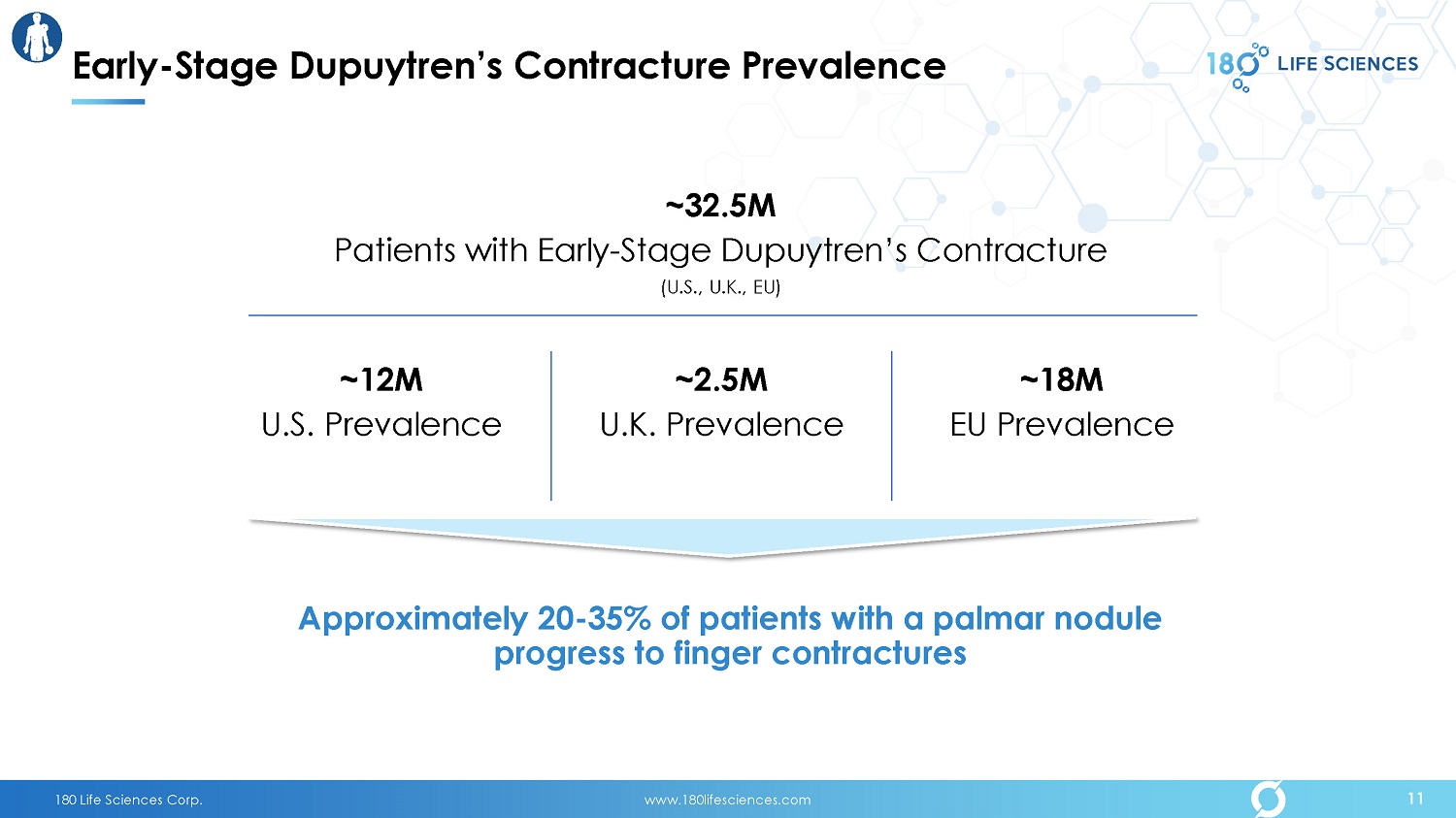 180 Life Sciences Corp. www.180lifesciences.com Characteristics • Common localized fibrotic condition of the hand , develops over years • Nodules form under skin – eventually creating a thick cord pulling one or more fingers • Can limit hand functions • Unlike liver and lung fibrosis, can be identified early Early D isease Late D isease – Results in Impaired H and Function No approved treatment Large unmet need Phase 2b trial treated early disease Current treatment options suboptimal: (1) • Sur gery – long (3 month) recovery, 6% recurrence at 5yr • N eedle perforation – less invasive, 30% recurrence at 5yr • C ollagenase injections – office procedure, 47% recurrence at 5 yr Initial Indication Targeting Dupuytren’s Contracture ( 1 ) Layton T & Nanchahal J. F1000Research 2019, 8(F1000Faculty Rev): 231 7