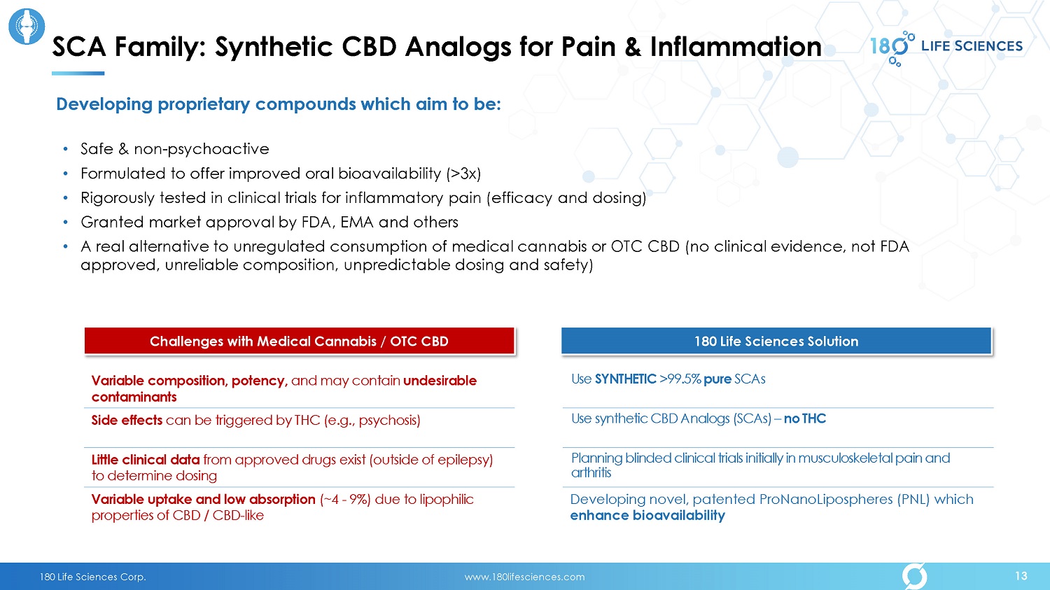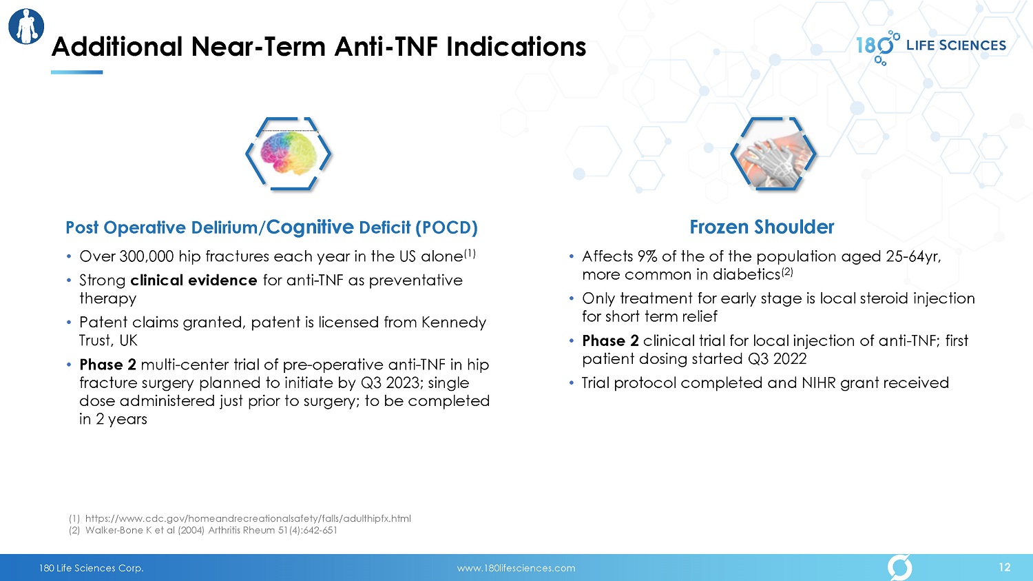 180 Life Sciences Corp. www.180lifesciences.com • Over 300,000 hip fractures each year in the US alone (1) • Strong clinical evidence for anti - TNF as preventative therapy • Patent claims granted, patent is licensed from Kennedy Trust, UK • Phase 2 multi - center trial of pre - operative anti - TNF in hip fracture surgery planned to initiate by Q3 2023; single dose administered just prior to surgery; to be completed in 2 years Post Operative Delirium/ Cognitive Deficit (POCD) Frozen Shoulder • Affects 9% of the of the population aged 25 - 64yr, more common in diabetics (2) • Only treatment for early stage is local steroid injection for short term relief • Phase 2 clinical trial for local injection of anti - TNF; first patient dosing started Q3 2022 • Trial protocol completed and NIHR grant received (1) https://www.cdc.gov/homeandrecreationalsafety/falls/adulthipfx.html (2) Walker - Bone K et al (2004) Arthritis Rheum 51(4):642 - 651 12 Additional Near - Term Anti - TNF Indications