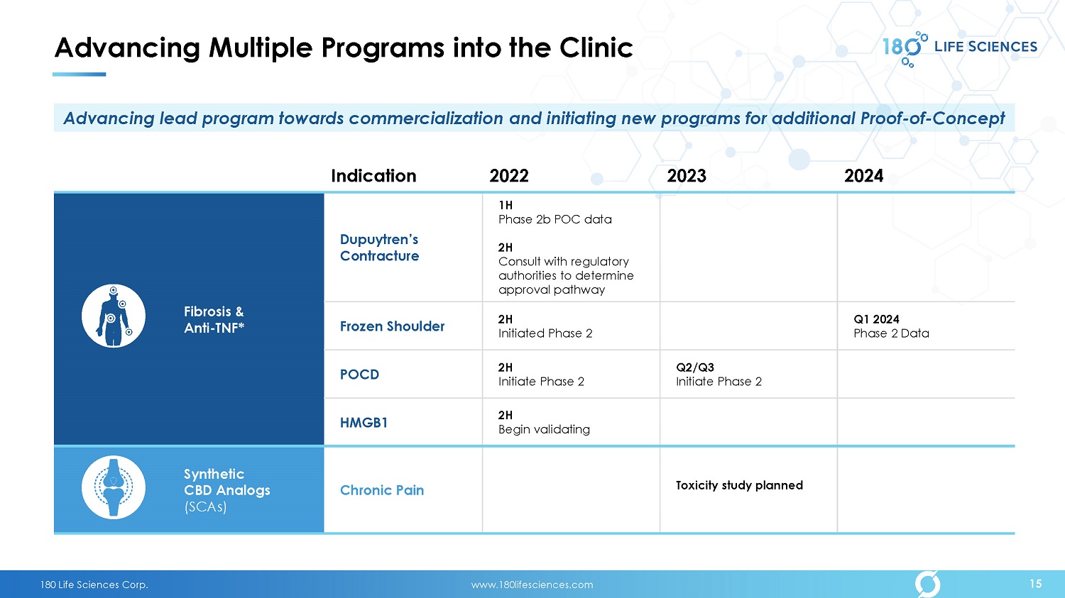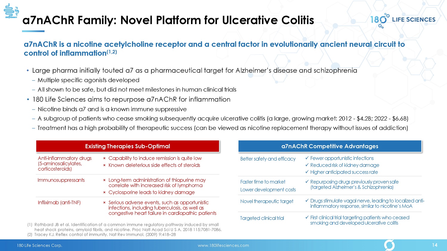 180 Life Sciences Corp. www.180lifesciences.com a7nAChR Family: Novel Platform for Ulcerative Colitis a7nAChR is a nicotine acetylcholine receptor and a central factor in evolutionarily ancient neural circuit to control of inflammation (1,2) (1) Rothbard JB et al. Identification of a common immune regulatory pathway induced by small heat shock proteins, amyloid fibrils, and nicotine. Proc Natl Acad Sci U S A. 2018 115:7081 - 7086. (2) Tracey KJ. Reflex control of immunity. Nat Rev Immunol. (2009) 9:418 – 28 14 • Large pharma initially touted a7 as a pharmaceutical target for Alzheimer’s disease and schizophrenia ⎯ Multiple specific agonists developed ⎯ All shown to be safe, but did not meet milestones in human clinical trials • 180 Life Sciences aims to repurpose a7nAChR for inflammation ⎯ Nicotine binds a7 and is a known immune suppressive ⎯ A subgroup of patients who cease smoking subsequently acquire ulcerative colitis (a large, growing market: 2012 - $4.2B; 2022 - $6.6B) ⎯ Treatment has a high probability of therapeutic success (can be viewed as nicotine replacement therapy without issues of addi cti on) × Capability to induce remission is quite low × Known deleterious side effects of steroids Existing Therapies Sub - Optimal × Long - term administration of thiopurine may correlate with increased risk of lymphoma × Cyclosporine leads to kidney damage × Serious adverse events, such as opportunistic infections, including tuberculosis, as well as congestive heart failure in cardiopathic patients Anti - inflammatory drugs (5 - aminosalicylates, corticosteroids) Immunosuppressants Infliximab (anti - TNF) x Fewer opportunistic infections x Reduced risk of kidney damage x Higher anticipated success rate a7nAChR Competitive Advantages Better safety and efficacy Faster time to market Lower development costs Novel therapeutic target Targeted clinical trial x Repurposing drugs previously proven safe (targeted Alzheimer’s & Schizophrenia) x Drugs stimulate vagal nerve, leading to localized anti - inflammatory response, similar to nicotine’s MoA x First clinical trial targeting patients who ceased smoking and developed ulcerative colitis