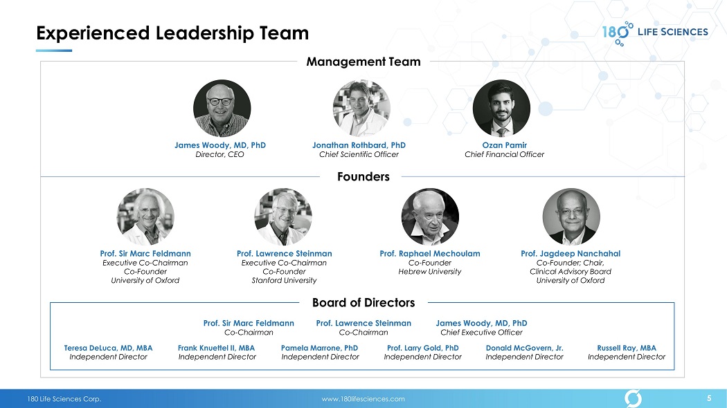 180 Life Sciences Corp. www.180lifesciences.com 4 Three Therapeutic Families Targeting Multiple Indications Indication Early - Stage Development Late - Stage Development Milestones Discovery/Validation Phase 1 Phase 2 Phase 3 Fibrosis & Anti - TNF* Dupuytren’s Contracture Pursuing Conditional Marketing Authorization in UK Frozen Shoulder UK feasibility study closed, new clinical trial site and country to be determined POCD Initiate Phase 2 Q2/Q3 2023 NASH Ongoing Validation HMGB1 Ongoing Validation Synthetic CBD Analogs (SCAs) Chronic Pain Ongoing Validation Early Arthritis Ongoing Validation Nicotine Acetylcholine Receptor ( α7 nAChR) Smoking Cessation Induced Ulcerative Colitis Ongoing Validation *Repurposed drugs in new indications may not need to follow standard regulatory approval pathways. Regulatory approvals obtai ned from the MHRA and CCMO and the relevant accredited ethics committees to perform clinical trials in the UK and The Netherlands. No meetings have been held with, and no applications or requests for a ppr oval have been submitted to the FDA for any products at this time. 4 adalimumab adalimumab infliximab