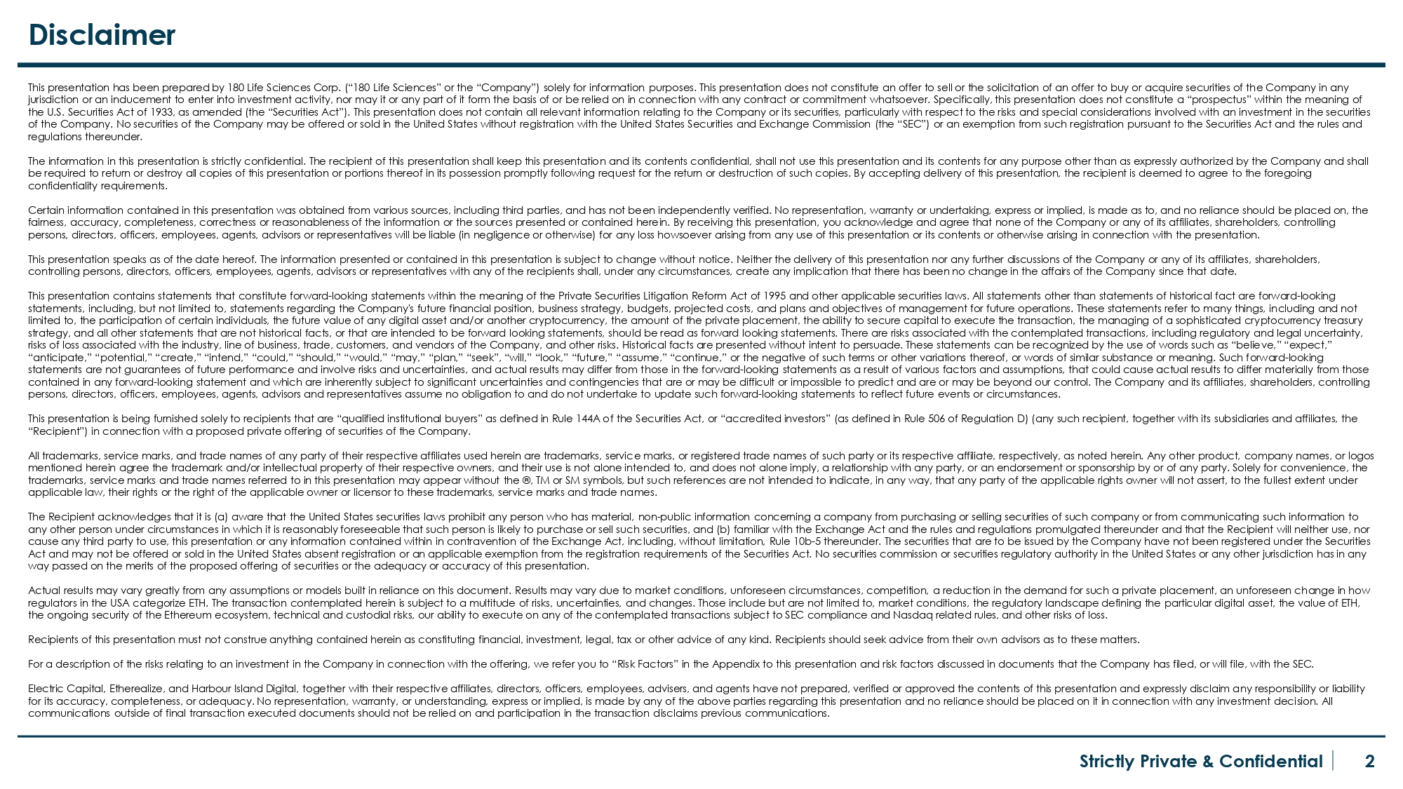 Disclaimer Strictly Private & Confidential 2 This presentation has been prepared by 180 Life Sciences Corp. (“180 Life Sciences” or the “Company”) solely for information purposes. This presentation does not constitute an offer to sell or the solicitation of an offer to buy or acquire securities of the Company in any jurisdiction or an inducement to enter into investment activity, nor may it or any part of it form the basis of or be relied on in connection with any contract or commitment whatsoever. Specifically, this presentation does not constitute a “prospectus” within the meaning of the U.S. Securities Act of 1933, as amended (the “Securities Act”). This presentation does not contain all relevant information relating to the Company or its securities, particularly with respect to the risks and special considerations involved with an investment in the securities of the Company. No securities of the Company may be offered or sold in the United States without registration with the United States Securities and Exchange Commission (the “SEC”) or an exemption from such registration pursuant to the Securities Act and the rules and regulations thereunder. The information in this presentation is strictly confidential. The recipient of this presentation shall keep this presentation and its contents confidential, shall not use this presentation and its contents for any purpose other than as expressly authorized by the Company and shall be required to return or destroy all copies of this presentation or portions thereof in its possession promptly following request for the return or destruction of such copies. By accepting delivery of this presentation, the recipient is deemed to agree to the foregoing confidentiality requirements. Certain information contained in this presentation was obtained from various sources, including third parties, and has not been independently verified. No representation, warranty or undertaking, express or implied, is made as to, and no reliance should be placed on, the fairness, accuracy, completeness, correctness or reasonableness of the information or the sources presented or contained herein. By receiving this presentation, you acknowledge and agree that none of the Company or any of its affiliates, shareholders, controlling persons, directors, officers, employees, agents, advisors or representatives will be liable (in negligence or otherwise) for any loss howsoever arising from any use of this presentation or its contents or otherwise arising in connection with the presentation. This presentation speaks as of the date hereof. The information presented or contained in this presentation is subject to change without notice. Neither the delivery of this presentation nor any further discussions of the Company or any of its affiliates, shareholders, controlling persons, directors, officers, employees, agents, advisors or representatives with any of the recipients shall, under any circumstances, create any implication that there has been no change in the affairs of the Company since that date. This presentation contains statements that constitute forward - looking statements within the meaning of the Private Securities Litigation Reform Act of 1995 and other applicable securities laws. All statements other than statements of historical fact are forward - looking statements, including, but not limited to, statements regarding the Company's future financial position, business strategy, budgets, projected costs, and plans and objectives of management for future operations. These statements refer to many things, including and not limited to, the participation of certain individuals, the future value of any digital asset and/or another cryptocurrency, the amount of the private placement, the ability to secure capital to execute the transaction, the managing of a sophisticated cryptocurrency treasury strategy, and all other statements that are not historical facts, or that are intended to be forward looking statements, should be read as forward looking statements. There are risks associated with the contemplated transactions, including regulatory and legal uncertainty, risks of loss associated with the industry, line of business, trade, customers, and vendors of the Company, and other risks. Historical facts are presented without intent to persuade. These statements can be recognized by the use of words such as “believe,” “expect,” “anticipate,” “potential,” “create,” “intend,” “could,” “should,” “would,” “may,” “plan,” “seek”, “will,” “look,” “future,” “assume,” “continue,” or the negative of such terms or other variations thereof, or words of similar substance or meaning. Such forward - looking statements are not guarantees of future performance and involve risks and uncertainties, and actual results may differ from those in the forward - looking statements as a result of various factors and assumptions, that could cause actual results to differ materially from those contained in any forward - looking statement and which are inherently subject to significant uncertainties and contingencies that are or may be difficult or impossible to predict and are or may be beyond our control. The Company and its affiliates, shareholders, controlling persons, directors, officers, employees, agents, advisors and representatives assume no obligation to and do not undertake to update such forward - looking statements to reflect future events or circumstances. This presentation is being furnished solely to recipients that are “qualified institutional buyers” as defined in Rule 144A of the Securities Act, or “accredited investors” (as defined in Rule 506 of Regulation D) (any such recipient, together with its subsidiaries and affiliates, the “Recipient”) in connection with a proposed private offering of securities of the Company. All trademarks, service marks, and trade names of any party of thei