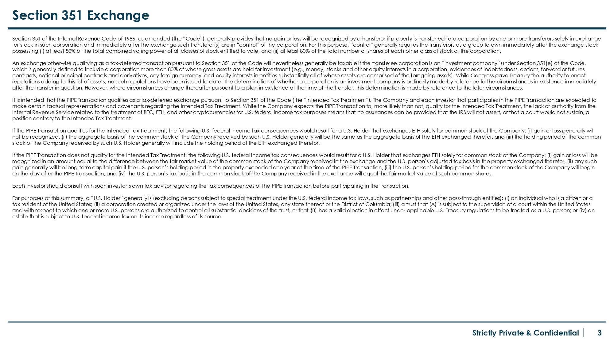Section 351 Exchange Strictly Private & Confidential 3 Section 351 of the Internal Revenue Code of 1986, as amended (the “Code”), generally provides that no gain or loss will be recognized by a transferor if property is transferred to a corporation by one or more transferors solely in exchange for stock in such corporation and immediately after the exchange such transferor(s) are in “control” of the corporation. For this purpose, “control” generally requires the transferors as a group to own immediately after the exchange stock possessing (i) at least 80% of the total combined voting power of all classes of stock entitled to vote, and (ii) at least 80% of the total number of shares of each other class of stock of the corporation. An exchange otherwise qualifying as a tax - deferred transaction pursuant to Section 351 of the Code will nevertheless generally be taxable if the transferee corporation is an “investment company” under Section 351(e) of the Code, which is generally defined to include a corporation more than 80% of whose gross assets are held for investment (e.g., money, stocks and other equity interests in a corporation, evidences of indebtedness, options, forward or futures contracts, notional principal contracts and derivatives, any foreign currency, and equity interests in entities substantially all of whose assets are comprised of the foregoing assets). While Congress gave Treasury the authority to enact regulations adding to this list of assets, no such regulations have been issued to date. The determination of whether a corporation is an investment company is ordinarily made by reference to the circumstances in existence immediately after the transfer in question. However, where circumstances change thereafter pursuant to a plan in existence at the time of the transfer, this determination is made by reference to the later circumstances. It is intended that the PIPE Transaction qualifies as a tax - deferred exchange pursuant to Section 351 of the Code (the “Intended Tax Treatment”). The Company and each investor that participates in the PIPE Transaction are expected to make certain factual representations and covenants regarding the Intended Tax Treatment. While the Company expects the PIPE Transaction to, more likely than not, qualify for the Intended Tax Treatment, the lack of authority from the Internal Revenue Service related to the treatment of BTC, ETH, and other cryptocurrencies for U.S. federal income tax purposes means that no assurances can be provided that the IRS will not assert, or that a court would not sustain, a position contrary to the Intended Tax Treatment. If the PIPE Transaction qualifies for the Intended Tax Treatment, the following U.S. federal income tax consequences would result for a U.S. Holder that exchanges ETH solely for common stock of the Company: (i) gain or loss generally will not be recognized, (ii) the aggregate basis of the common stock of the Company received by such U.S. Holder generally will be the same as the aggregate basis of the ETH exchanged therefor, and (iii) the holding period of the common stock of the Company received by such U.S. Holder generally will include the holding period of the ETH exchanged therefor. If the PIPE Transaction does not qualify for the Intended Tax Treatment, the following U.S. federal income tax consequences would result for a U.S. Holder that exchanges ETH solely for common stock of the Company: (i) gain or loss will be recognized in an amount equal to the difference between the fair market value of the common stock of the Company received in the exchange and the U.S. person’s adjusted tax basis in the property exchanged therefor, (ii) any such gain generally will be long - term capital gain if the U.S. person’s holding period in the property exceeded one year at the time of the PIPE Transaction, (iii) the U.S. person’s holding period for the common stock of the Company will begin on the day after the PIPE Transaction, and (iv) the U.S. person’s tax basis in the common stock of the Company received in the exchange will equal the fair market value of such common shares. Each investor should consult with such investor’s own tax advisor regarding the tax consequences of the PIPE Transaction before participating in the transaction. For purposes of this summary, a “U.S. Holder” generally is (excluding persons subject to special treatment under the U.S. federal income tax laws, such as partnerships and other pass - through entities): (i) an individual who is a citizen or a tax resident of the United States; (ii) a corporation created or organized under the laws of the United States, any state thereof or the District of Columbia; (iii) a trust that (A) is subject to the supervision of a court within the United States and with respect to which one or more U.S. persons are authorized to control all substantial decisions of the trust, or that (B) has a valid election in effect under applicable U.S. Treasury regulations to be treated as a U.S. person; or (iv) an estate that is subject to U.S. federal income tax on its income regardless of its source.