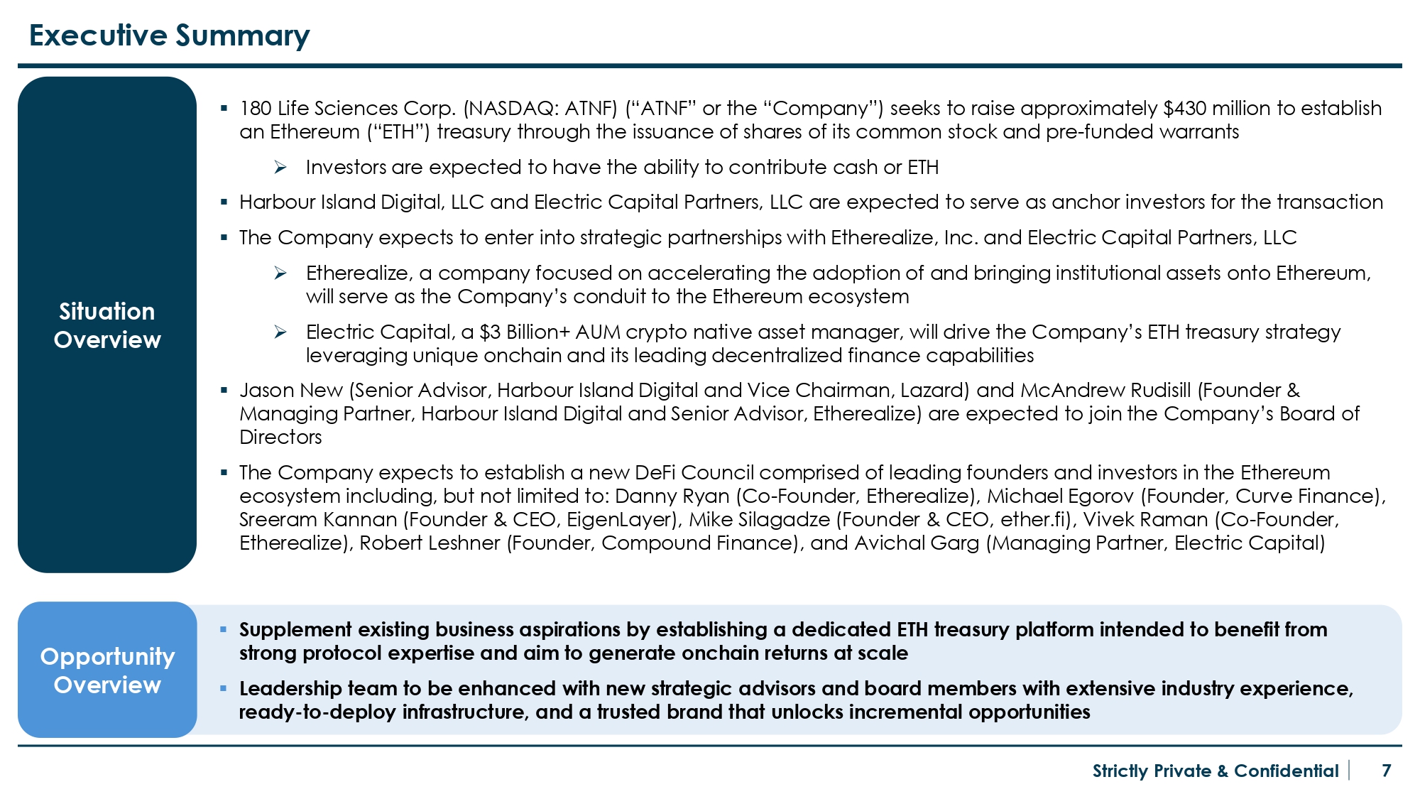 Executive Summary Situation Overview ▪ 180 Life Sciences Corp. (NASDAQ: ATNF) (“ATNF” or the “Company”) seeks to raise approximately $430 million to establish an Ethereum (“ETH”) treasury through the issuance of shares of its common stock and pre - funded warrants » Investors are expected to have the ability to contribute cash or ETH ▪ Harbour Island Digital, LLC and Electric Capital Partners, LLC are expected to serve as anchor investors for the transaction ▪ The Company expects to enter into strategic partnerships with Etherealize, Inc. and Electric Capital Partners, LLC » Etherealize, a company focused on accelerating the adoption of and bringing institutional assets onto Ethereum, will serve as the Company’s conduit to the Ethereum ecosystem » Electric Capital, a $3 Billion+ AUM crypto native asset manager, will drive the Company’s ETH treasury strategy leveraging unique onchain and its leading decentralized finance capabilities ▪ Jason New (Senior Advisor, Harbour Island Digital and Vice Chairman, Lazard) and McAndrew Rudisill (Founder & Managing Partner, Harbour Island Digital and Senior Advisor, Etherealize) are expected to join the Company’s Board of Directors ▪ The Company expects to establish a new DeFi Council comprised of leading founders and investors in the Ethereum ecosystem including, but not limited to: Danny Ryan (Co - Founder, Etherealize), Michael Egorov (Founder, Curve Finance), Sreeram Kannan (Founder & CEO, EigenLayer), Mike Silagadze (Founder & CEO, ether.fi), Vivek Raman (Co - Founder, Etherealize), Robert Leshner (Founder, Compound Finance), and Avichal Garg (Managing Partner, Electric Capital) ▪ Supplement existing business aspirations by establishing a dedicated ETH treasury platform intended to benefit from strong protocol expertise and aim to generate onchain returns at scale ▪ Leadership team to be enhanced with new strategic advisors and board members with extensive industry experience, ready - to - deploy infrastructure, and a trusted brand that unlocks incremental opportunities Opportunity Overview Strictly Private & Confidential 7