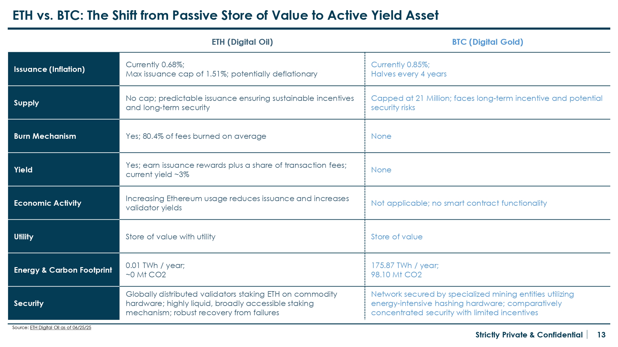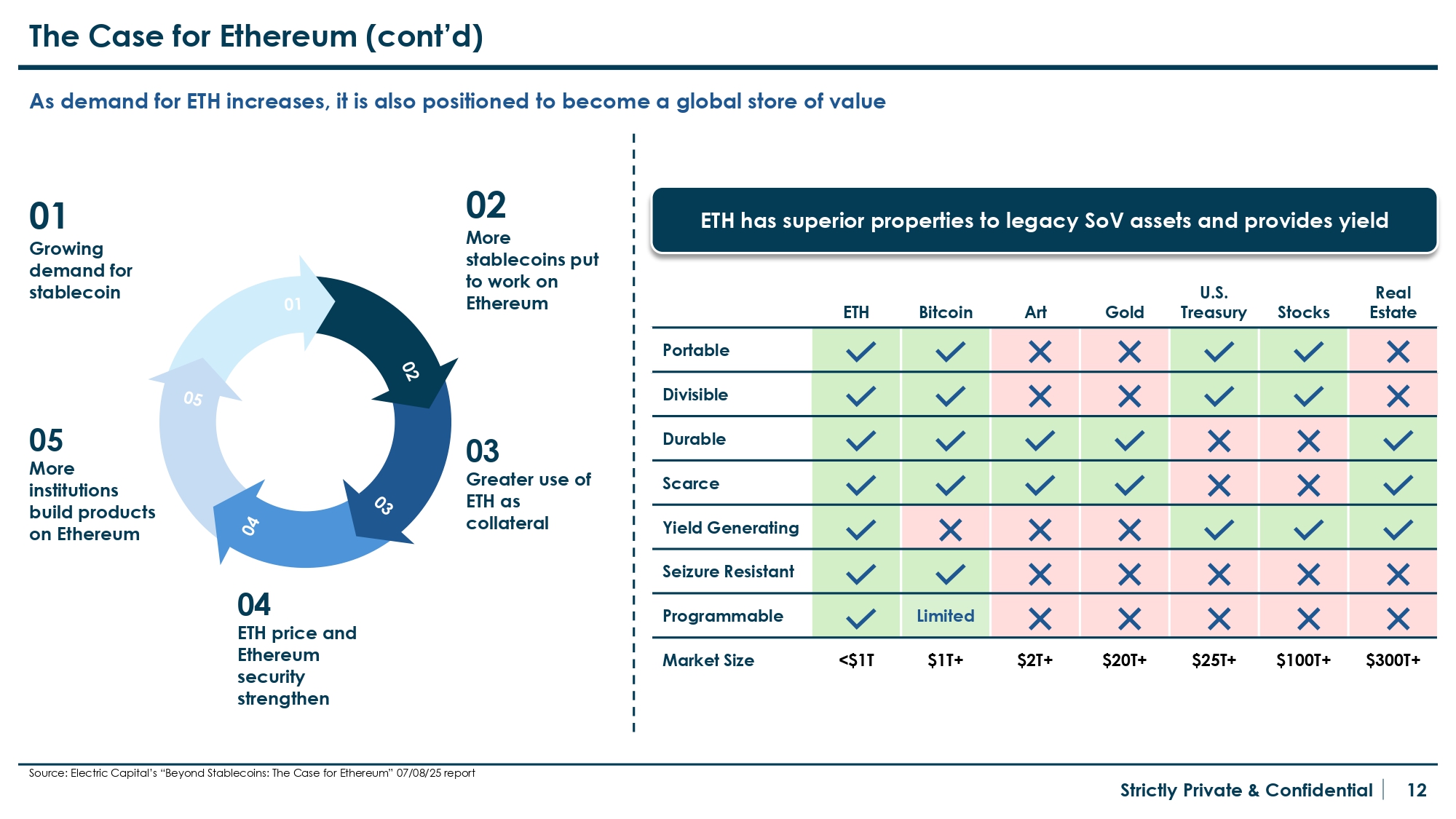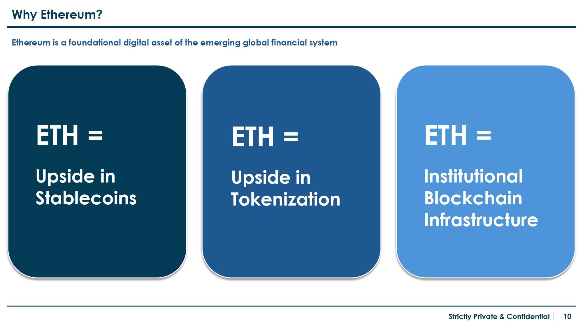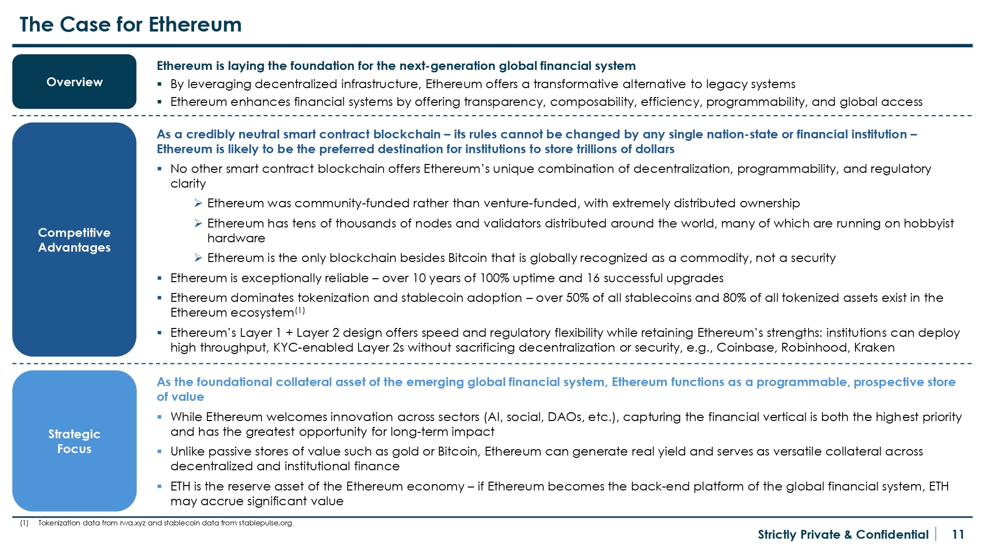 The Case for Ethereum Overview Ethereum is laying the foundation for the next - generation global financial system ▪ By leveraging decentralized infrastructure, Ethereum offers a transformative alternative to legacy systems ▪ Ethereum enhances financial systems by offering transparency, composability, efficiency, programmability, and global access Competitive Advantages As a credibly neutral smart contract blockchain – its rules cannot be changed by any single nation - state or financial institution – Ethereum is likely to be the preferred destination for institutions to store trillions of dollars ▪ No other smart contract blockchain offers Ethereum’s unique combination of decentralization, programmability, and regulatory clarity » Ethereum was community - funded rather than venture - funded, with extremely distributed ownership » Ethereum has tens of thousands of nodes and validators distributed around the world, many of which are running on hobbyist hardware » Ethereum is the only blockchain besides Bitcoin that is globally recognized as a commodity, not a security ▪ Ethereum is exceptionally reliable – over 10 years of 100% uptime and 16 successful upgrades ▪ Ethereum dominates tokenization and stablecoin adoption – over 50% of all stablecoins and 80% of all tokenized assets exist in the Ethereum ecosystem (1) ▪ Ethereum’s Layer 1 + Layer 2 design offers speed and regulatory flexibility while retaining Ethereum’s strengths: institutions can deploy high throughput, KYC - enabled Layer 2s without sacrificing decentralization or security, e.g., Coinbase, Robinhood, Kraken Strategic Focus Strictly Private & Confidential 11 As the foundational collateral asset of the emerging global financial system, Ethereum functions as a programmable, prospective store of value ▪ While Ethereum welcomes innovation across sectors (AI, social, DAOs, etc.), capturing the financial vertical is both the highest priority and has the greatest opportunity for long - term impact ▪ Unlike passive stores of value such as gold or Bitcoin, Ethereum can generate real yield and serves as versatile collateral across decentralized and institutional finance ▪ ETH is the reserve asset of the Ethereum economy – if Ethereum becomes the back - end platform of the global financial system, ETH may accrue significant value (1) Tokenization data from rwa.xyz and stablecoin data from stablepulse.org