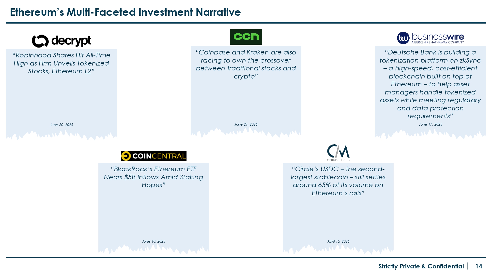 Ethereum’s Multi - Faceted Investment Narrative “Robinhood Shares Hit All - Time High as Firm Unveils Tokenized Stocks, Ethereum L2” June 30, 2025 “Deutsche Bank is building a tokenization platform on zkSync – a high - speed, cost - efficient blockchain built on top of Ethereum – to help asset managers handle tokenized assets while meeting regulatory and data protection requirements” June 17, 2025 “BlackRock’s Ethereum ETF Nears $5B Inflows Amid Staking Hopes” June 10, 2025 “Circle’s USDC – the second - largest stablecoin – still settles around 65% of its volume on Ethereum’s rails” April 15, 2025 “Coinbase and Kraken are also racing to own the crossover between traditional stocks and crypto” June 21, 2025 Strictly Private & Confidential 14