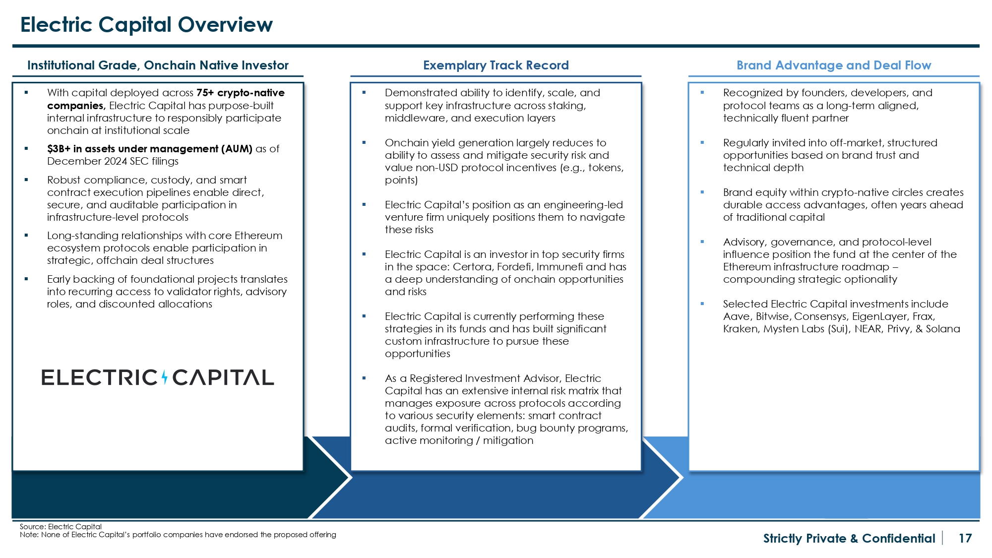 17 Strictly Private & Confidential Institutional Grade, Onchain Native Investor ▪ With capital deployed across 75+ crypto - native companies, Electric Capital has purpose - built internal infrastructure to responsibly participate onchain at institutional scale ▪ $3B+ in assets under management (AUM) as of December 2024 SEC filings ▪ Robust compliance, custody, and smart contract execution pipelines enable direct, secure, and auditable participation in infrastructure - level protocols ▪ Long - standing relationships with core Ethereum ecosystem protocols enable participation in strategic, offchain deal structures ▪ Early backing of foundational projects translates into recurring access to validator rights, advisory roles, and discounted allocations Electric Capital Overview Exemplary Track Record ▪ Demonstrated ability to identify, scale, and support key infrastructure across staking, middleware, and execution layers ▪ Onchain yield generation largely reduces to ability to assess and mitigate security risk and value non - USD protocol incentives (e.g., tokens, points) ▪ Electric Capital’s position as an engineering - led venture firm uniquely positions them to navigate these risks ▪ Electric Capital is an investor in top security firms in the space: Certora, Fordefi, Immunefi and has a deep understanding of onchain opportunities and risks ▪ Electric Capital is currently performing these strategies in its funds and has built significant custom infrastructure to pursue these opportunities ▪ As a Registered Investment Advisor, Electric Capital has an extensive internal risk matrix that manages exposure across protocols according to various security elements: smart contract audits, formal verification, bug bounty programs, active monitoring / mitigation Brand Advantage and Deal Flow ▪ Recognized by founders, developers, and protocol teams as a long - term aligned, technically fluent partner ▪ Regularly invited into off - market, structured opportunities based on brand trust and technical depth ▪ Brand equity within crypto - native circles creates durable access advantages, often years ahead of traditional capital ▪ Advisory, governance, and protocol - level influence position the fund at the center of the Ethereum infrastructure roadmap – compounding strategic optionality ▪ Selected Electric Capital investments include Aave, Bitwise, Consensys, EigenLayer, Frax, Kraken, Mysten Labs (Sui), NEAR, Privy, & Solana Source: Electric Capital Note: None of Electric Capital’s portfolio companies have endorsed the proposed offering