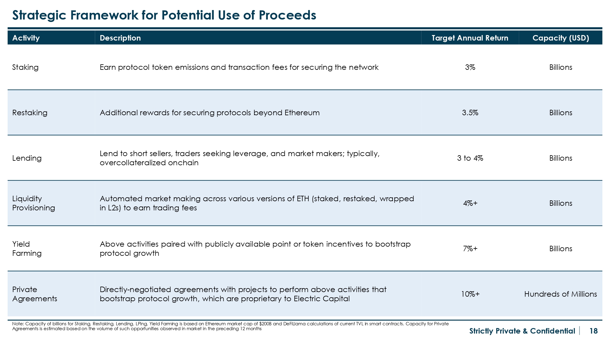 18 Capacity (USD) Target Annual Return Description Activity Billions 3% Earn protocol token emissions and transaction fees for securing the network Staking Billions 3.5% Additional rewards for securing protocols beyond Ethereum Restaking Billions 3 to 4% Lend to short sellers, traders seeking leverage, and market makers; typically, overcollateralized onchain Lending Billions 4%+ Automated market making across various versions of ETH (staked, restaked, wrapped in L2s) to earn trading fees Liquidity Provisioning Billions 7%+ Above activities paired with publicly available point or token incentives to bootstrap protocol growth Yield Farming Hundreds of Millions 10%+ Directly - negotiated agreements with projects to perform above activities that bootstrap protocol growth, which are proprietary to Electric Capital Private Agreements Strictly Private & Confidential Strategic Framework for Potential Use of Proceeds Note: Capacity of billions for Staking, Restaking, Lending, LPing, Yield Farming is based on Ethereum market cap of $200B and DeFiLlama calculations of current TVL in smart contracts. Capacity for Private Agreements is estimated based on the volume of such opportunities observed in market in the preceding 12 months