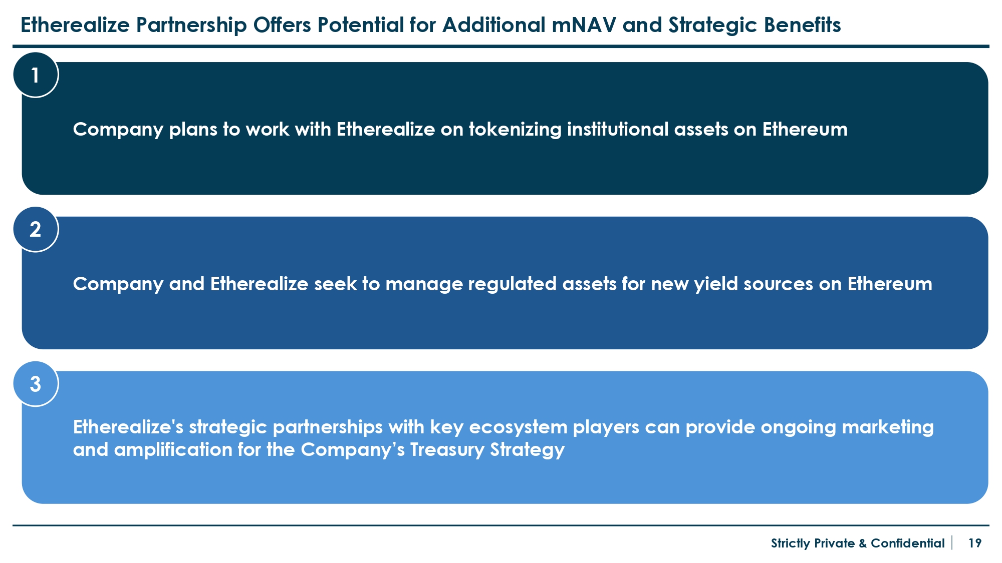 Etherealize Partnership Offers Potential for Additional mNAV and Strategic Benefits 3 Etherealize's strategic partnerships with key ecosystem players can provide ongoing marketing and amplification for the Company’s Treasury Strategy 2 Company and Etherealize seek to manage regulated assets for new yield sources on Ethereum Strictly Private & Confidential 19 1 Company plans to work with Etherealize on tokenizing institutional assets on Ethereum