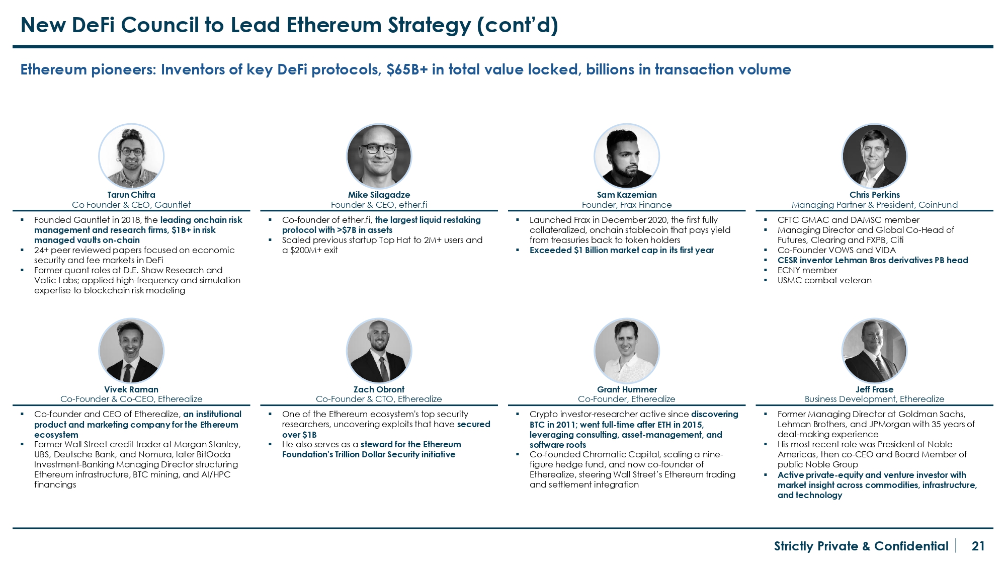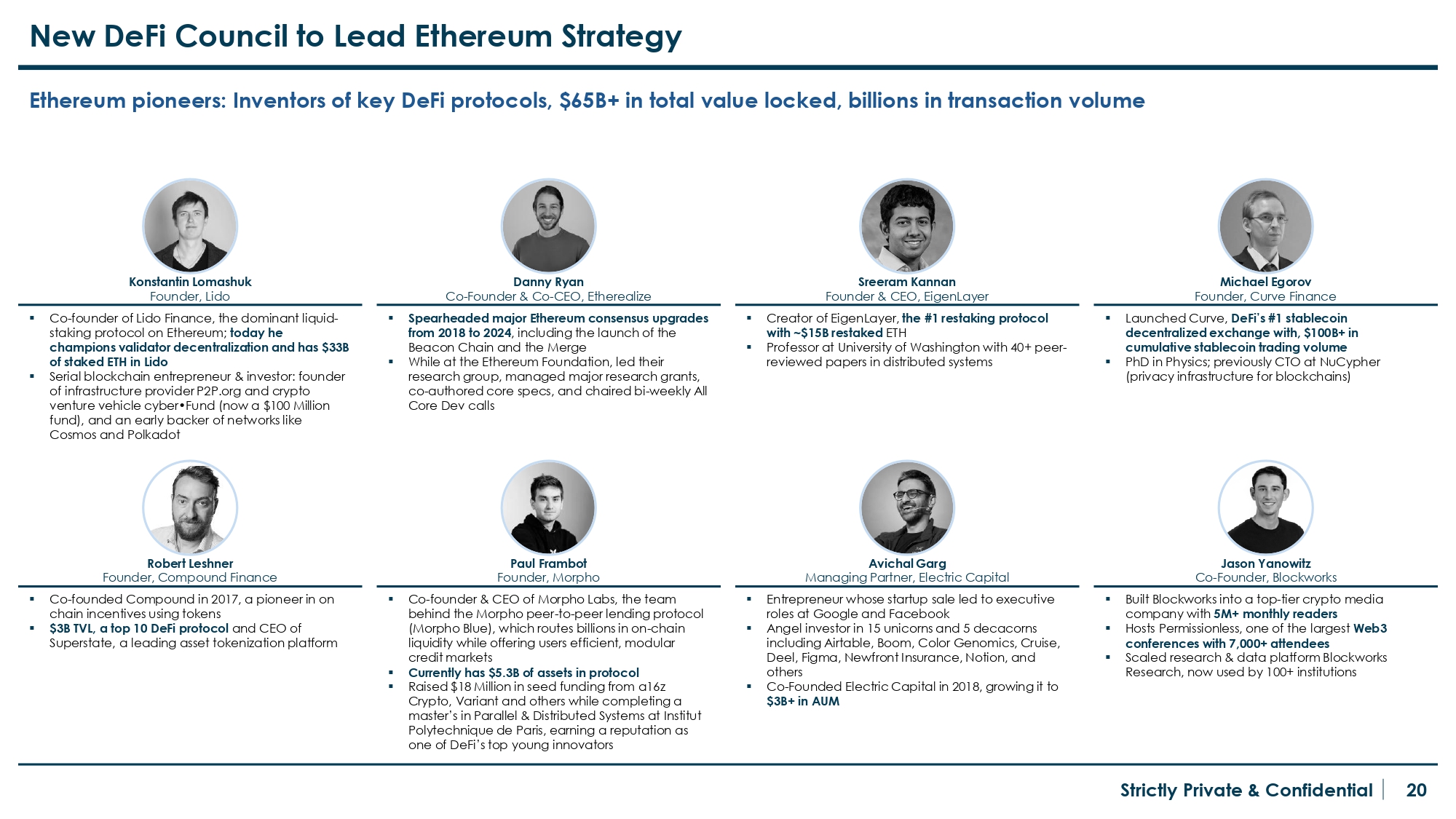 New DeFi Council to Lead Ethereum Strategy Ethereum pioneers: Inventors of key DeFi protocols, $65B+ in total value locked, billions in transaction volume Sreeram Kannan Founder & CEO, EigenLayer ▪ Creator of EigenLayer, the #1 restaking protocol with ~$15B restaked ETH ▪ Professor at University of Washington with 40+ peer - reviewed papers in distributed systems Danny Ryan Co - Founder & Co - CEO, Etherealize ▪ Spearheaded major Ethereum consensus upgrades from 2018 to 2024 , including the launch of the Beacon Chain and the Merge ▪ While at the Ethereum Foundation, led their research group, managed major research grants, co - authored core specs, and chaired bi - weekly All Core Dev calls Robert Leshner Founder, Compound Finance ▪ Co - founded Compound in 2017, a pioneer in on chain incentives using tokens ▪ $3B TVL, a top 10 DeFi protocol and CEO of Superstate, a leading asset tokenization platform Avichal Garg Managing Partner, Electric Capital ▪ Entrepreneur whose startup sale led to executive roles at Google and Facebook ▪ Angel investor in 15 unicorns and 5 decacorns including Airtable, Boom, Color Genomics, Cruise, Deel, Figma, Newfront Insurance, Notion, and others ▪ Co - Founded Electric Capital in 2018, growing it to $3B+ in AUM Michael Egorov Founder, Curve Finance ▪ Launched Curve, DeFi’s #1 stablecoin decentralized exchange with, $100B+ in cumulative stablecoin trading volume ▪ PhD in Physics; previously CTO at NuCypher (privacy infrastructure for blockchains) Konstantin Lomashuk Founder, Lido ▪ Co - founder of Lido Finance, the dominant liquid - staking protocol on Ethereum; today he champions validator decentralization and has $33B of staked ETH in Lido ▪ Serial blockchain entrepreneur & investor: founder of infrastructure provider P2P.org and crypto venture vehicle cyber•Fund (now a $100 Million fund), and an early backer of networks like Cosmos and Polkadot Paul Frambot Founder, Morpho ▪ Co - founder & CEO of Morpho Labs, the team behind the Morpho peer - to - peer lending protocol (Morpho Blue), which routes billions in on - chain liquidity while offering users efficient, modular credit markets ▪ Currently has $5.3B of assets in protocol ▪ Raised $18 Million in seed funding from a16z Crypto, Variant and others while completing a master’s in Parallel & Distributed Systems at Institut Polytechnique de Paris, earning a reputation as one of DeFi’s top young innovators Jason Yanowitz Co - Founder, Blockworks ▪ Built Blockworks into a top - tier crypto media company with 5M+ monthly readers ▪ Hosts Permissionless, one of the largest Web3 conferences with 7,000+ attendees ▪ Scaled research & data platform Blockworks Research, now used by 100+ institutions Strictly Private & Confidential 20