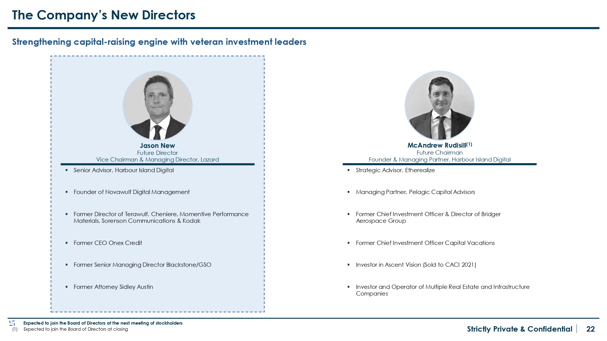 22 Strictly Private & Confidential The Company’s New Directors Strengthening capital - raising engine with veteran investment leaders Jason New Future Director Vice Chairman & Managing Director, Lazard ▪ Senior Advisor, Harbour Island Digital ▪ Founder of Novawulf Digital Management ▪ Former Director of Terawulf, Cheniere, Momentive Performance Materials, Sorenson Communications & Kodak ▪ Former CEO Onex Credit ▪ Former Senior Managing Director Blackstone/GSO ▪ Former Attorney Sidley Austin McAndrew Rudisill (1) Future Chairman Founder & Managing Partner, Harbour Island Digital ▪ Strategic Advisor, Etherealize ▪ Managing Partner, Pelagic Capital Advisors ▪ Former Chief Investment Officer & Director of Bridger Aerospace Group ▪ Former Chief Investment Officer Capital Vacations ▪ Investor in Ascent Vision (Sold to CACI 2021) ▪ Investor and Operator of Multiple Real Estate and Infrastructure Companies Expected to join the Board of Directors at the next meeting of stockholders (1) Expected to join the Board of Directors at closing