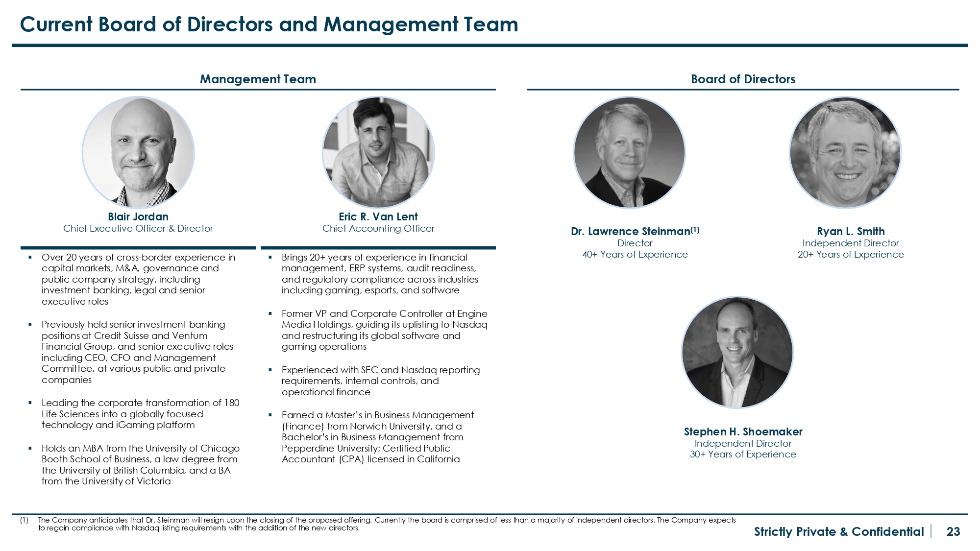 23 Strictly Private & Confidential Current Board of Directors and Management Team (1) The Company anticipates that Dr. Steinman will resign upon the closing of the proposed offering. Currently the board is comprised of less than a majority of independent directors. The Company expects to regain compliance with Nasdaq listing requirements with the addition of the new directors Management Team ▪ Over 20 years of cross - border experience in capital markets, M&A, governance and public company strategy, including investment banking, legal and senior executive roles ▪ Previously held senior investment banking positions at Credit Suisse and Ventum Financial Group, and senior executive roles including CEO, CFO and Management Committee, at various public and private companies ▪ Leading the corporate transformation of 180 Life Sciences into a globally focused technology and iGaming platform ▪ Holds an MBA from the University of Chicago Booth School of Business, a law degree from the University of British Columbia, and a BA from the University of Victoria Blair Jordan Chief Executive Officer & Director ▪ Brings 20+ years of experience in financial management, ERP systems, audit readiness, and regulatory compliance across industries including gaming, esports, and software ▪ Former VP and Corporate Controller at Engine Media Holdings, guiding its uplisting to Nasdaq and restructuring its global software and gaming operations ▪ Experienced with SEC and Nasdaq reporting requirements, internal controls, and operational finance ▪ Earned a Master’s in Business Management (Finance) from Norwich University, and a Bachelor’s in Business Management from Pepperdine University; Certified Public Accountant (CPA) licensed in California Eric R. Van Lent Chief Accounting Officer Dr. Lawrence Steinman (1) Director 40+ Years of Experience Stephen H. Shoemaker Independent Director 30+ Years of Experience Ryan L. Smith Independent Director 20+ Years of Experience Board of Directors