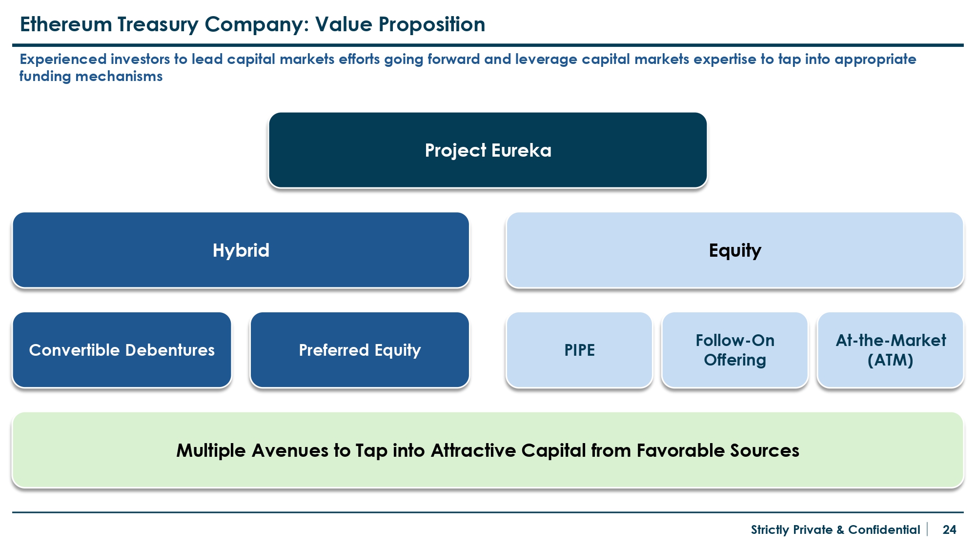 Ethereum Treasury Company: Value Proposition Project Eureka Hybrid Equity Multiple Avenues to Tap into Attractive Capital from Favorable Sources Experienced investors to lead capital markets efforts going forward and leverage capital markets expertise to tap into appropriate funding mechanisms Preferred Equity PIPE At - the - Market (ATM) Convertible Debentures Follow - On Offering Strictly Private & Confidential 24