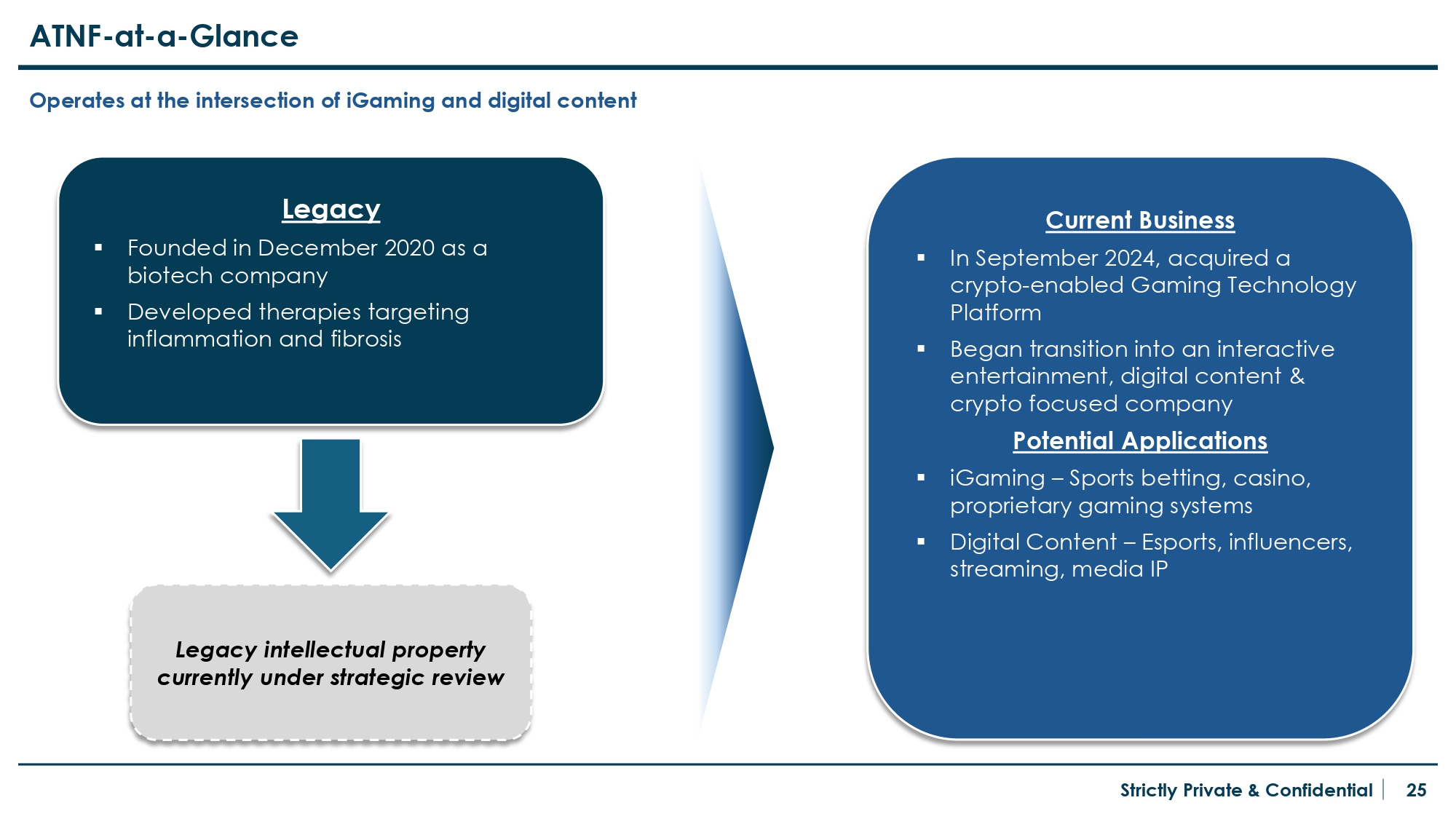 ATNF - at - a - Glance Operates at the intersection of iGaming and digital content Current Business ▪ In September 2024, acquired a crypto - enabled Gaming Technology Platform ▪ Began transition into an interactive entertainment, digital content & crypto focused company Potential Applications ▪ iGaming – Sports betting, casino, proprietary gaming systems ▪ Digital Content – Esports, influencers, streaming, media IP Legacy intellectual property currently under strategic review Legacy ▪ Founded in December 2020 as a biotech company ▪ Developed therapies targeting inflammation and fibrosis Strictly Private & Confidential 25