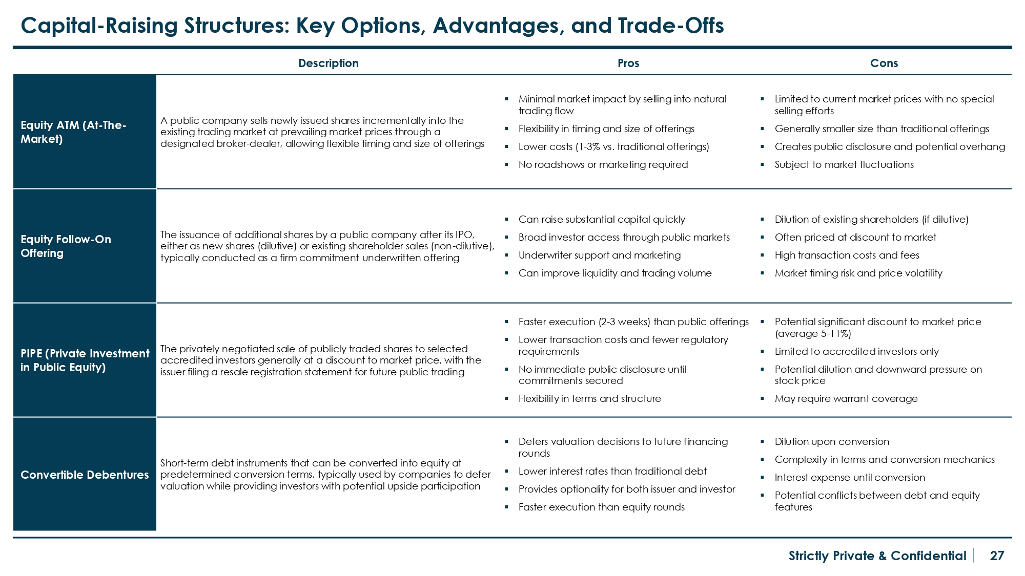 Cons Pros Description ▪ Limited to current market prices with no special selling efforts ▪ Generally smaller size than traditional offerings ▪ Creates public disclosure and potential overhang ▪ Subject to market fluctuations ▪ Minimal market impact by selling into natural trading flow ▪ Flexibility in timing and size of offerings ▪ Lower costs (1 - 3% vs. traditional offerings) ▪ No roadshows or marketing required A public company sells newly issued shares incrementally into the existing trading market at prevailing market prices through a designated broker - dealer, allowing flexible timing and size of offerings Equity ATM (At - The - Market) ▪ Dilution of existing shareholders (if dilutive) ▪ Often priced at discount to market ▪ High transaction costs and fees ▪ Market timing risk and price volatility ▪ Can raise substantial capital quickly ▪ Broad investor access through public markets ▪ Underwriter support and marketing ▪ Can improve liquidity and trading volume The issuance of additional shares by a public company after its IPO, either as new shares (dilutive) or existing shareholder sales (non - dilutive), typically conducted as a firm commitment underwritten offering Equity Follow - On Offering ▪ Potential significant discount to market price (average 5 - 11%) ▪ Limited to accredited investors only ▪ Potential dilution and downward pressure on stock price ▪ May require warrant coverage ▪ Faster execution (2 - 3 weeks) than public offerings ▪ Lower transaction costs and fewer regulatory requirements ▪ No immediate public disclosure until commitments secured ▪ Flexibility in terms and structure The privately negotiated sale of publicly traded shares to selected accredited investors generally at a discount to market price, with the issuer filing a resale registration statement for future public trading PIPE (Private Investment in Public Equity) ▪ Dilution upon conversion ▪ Complexity in terms and conversion mechanics ▪ Interest expense until conversion ▪ Potential conflicts between debt and equity features ▪ Defers valuation decisions to future financing rounds ▪ Lower interest rates than traditional debt ▪ Provides optionality for both issuer and investor ▪ Faster execution than equity rounds Short - term debt instruments that can be converted into equity at predetermined conversion terms, typically used by companies to defer valuation while providing investors with potential upside participation Convertible Debentures Strictly Private & Confidential 27 Capital - Raising Structures: Key Options, Advantages, and Trade - Offs