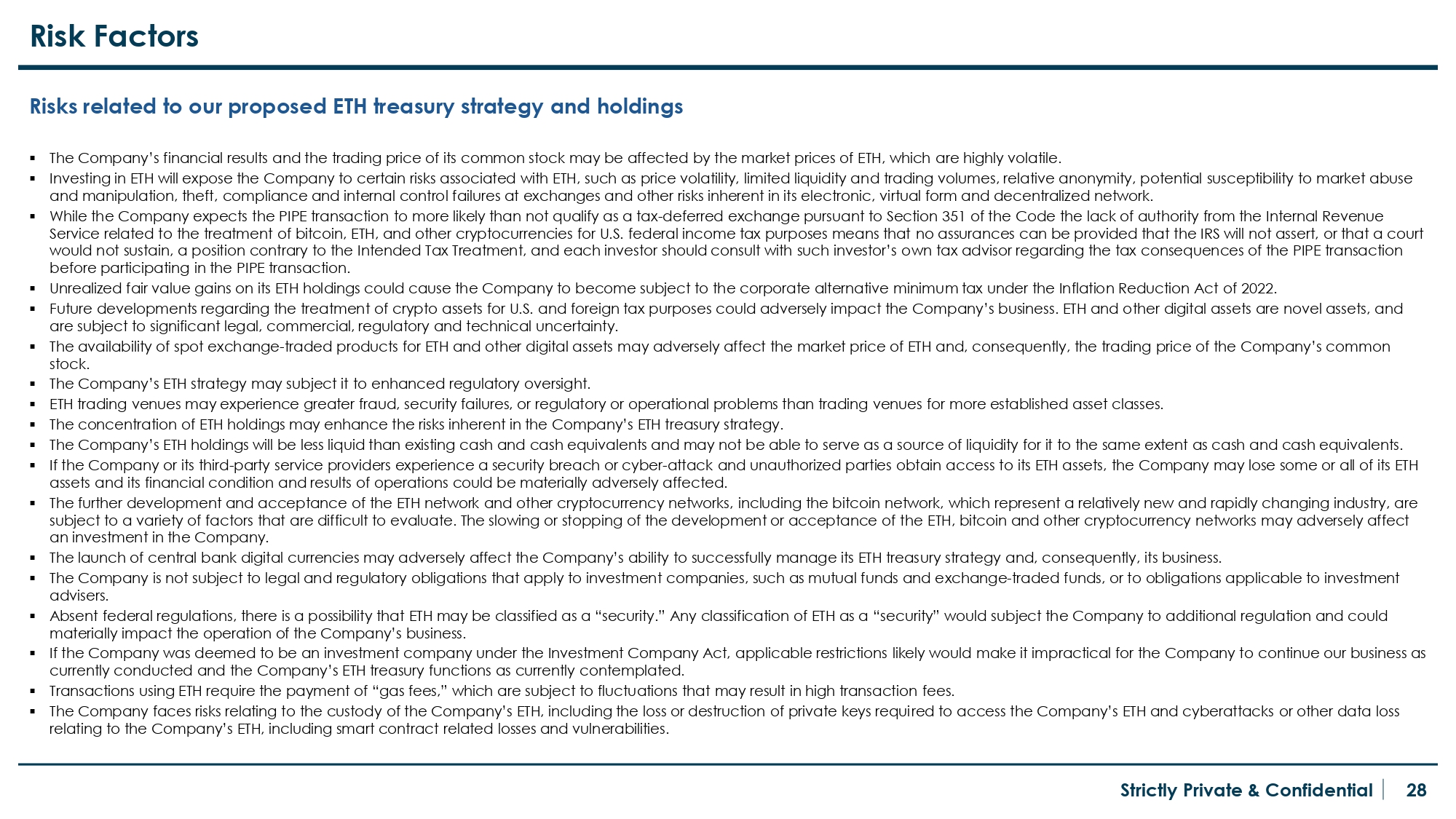 Risk Factors Strictly Private & Confidential 28 Risks related to our proposed ETH treasury strategy and holdings ▪ The Company’s financial results and the trading price of its common stock may be affected by the market prices of ETH, which are highly volatile. ▪ Investing in ETH will expose the Company to certain risks associated with ETH, such as price volatility, limited liquidity and trading volumes, relative anonymity, potential susceptibility to market abuse and manipulation, theft, compliance and internal control failures at exchanges and other risks inherent in its electronic, virtual form and decentralized network. ▪ While the Company expects the PIPE transaction to more likely than not qualify as a tax - deferred exchange pursuant to Section 351 of the Code the lack of authority from the Internal Revenue Service related to the treatment of bitcoin, ETH, and other cryptocurrencies for U.S. federal income tax purposes means that no assurances can be provided that the IRS will not assert, or that a court would not sustain, a position contrary to the Intended Tax Treatment, and each investor should consult with such investor’s own tax advisor regarding the tax consequences of the PIPE transaction before participating in the PIPE transaction. ▪ Unrealized fair value gains on its ETH holdings could cause the Company to become subject to the corporate alternative minimum tax under the Inflation Reduction Act of 2022. ▪ Future developments regarding the treatment of crypto assets for U.S. and foreign tax purposes could adversely impact the Company’s business. ETH and other digital assets are novel assets, and are subject to significant legal, commercial, regulatory and technical uncertainty. ▪ The availability of spot exchange - traded products for ETH and other digital assets may adversely affect the market price of ETH and, consequently, the trading price of the Company’s common stock. ▪ The Company’s ETH strategy may subject it to enhanced regulatory oversight. ▪ ETH trading venues may experience greater fraud, security failures, or regulatory or operational problems than trading venues for more established asset classes. ▪ The concentration of ETH holdings may enhance the risks inherent in the Company’s ETH treasury strategy. ▪ The Company’s ETH holdings will be less liquid than existing cash and cash equivalents and may not be able to serve as a source of liquidity for it to the same extent as cash and cash equivalents. ▪ If the Company or its third - party service providers experience a security breach or cyber - attack and unauthorized parties obtain access to its ETH assets, the Company may lose some or all of its ETH assets and its financial condition and results of operations could be materially adversely affected. ▪ The further development and acceptance of the ETH network and other cryptocurrency networks, including the bitcoin network, which represent a relatively new and rapidly changing industry, are subject to a variety of factors that are difficult to evaluate. The slowing or stopping of the development or acceptance of the ETH, bitcoin and other cryptocurrency networks may adversely affect an investment in the Company. ▪ The launch of central bank digital currencies may adversely affect the Company’s ability to successfully manage its ETH treasury strategy and, consequently, its business. ▪ The Company is not subject to legal and regulatory obligations that apply to investment companies, such as mutual funds and exchange - traded funds, or to obligations applicable to investment advisers. ▪ Absent federal regulations, there is a possibility that ETH may be classified as a “security.” Any classification of ETH as a “security” would subject the Company to additional regulation and could materially impact the operation of the Company’s business. ▪ If the Company was deemed to be an investment company under the Investment Company Act, applicable restrictions likely would make it impractical for the Company to continue our business as currently conducted and the Company’s ETH treasury functions as currently contemplated. ▪ Transactions using ETH require the payment of “gas fees,” which are subject to fluctuations that may result in high transaction fees. ▪ The Company faces risks relating to the custody of the Company’s ETH, including the loss or destruction of private keys required to access the Company’s ETH and cyberattacks or other data loss relating to the Company’s ETH, including smart contract related losses and vulnerabilities.