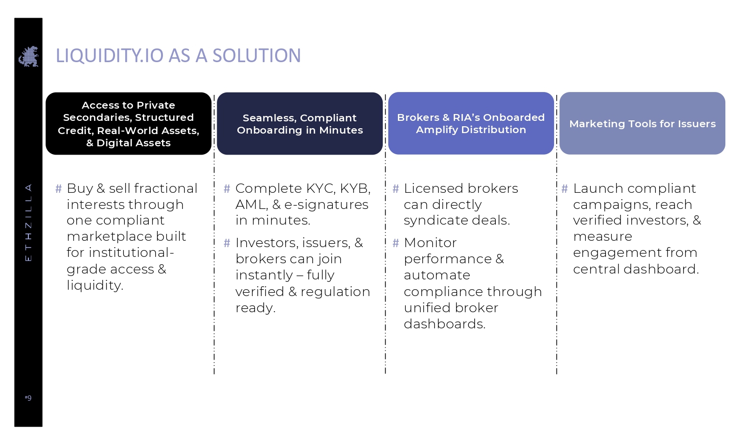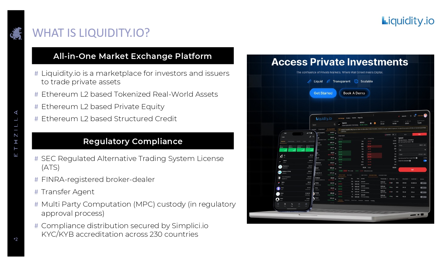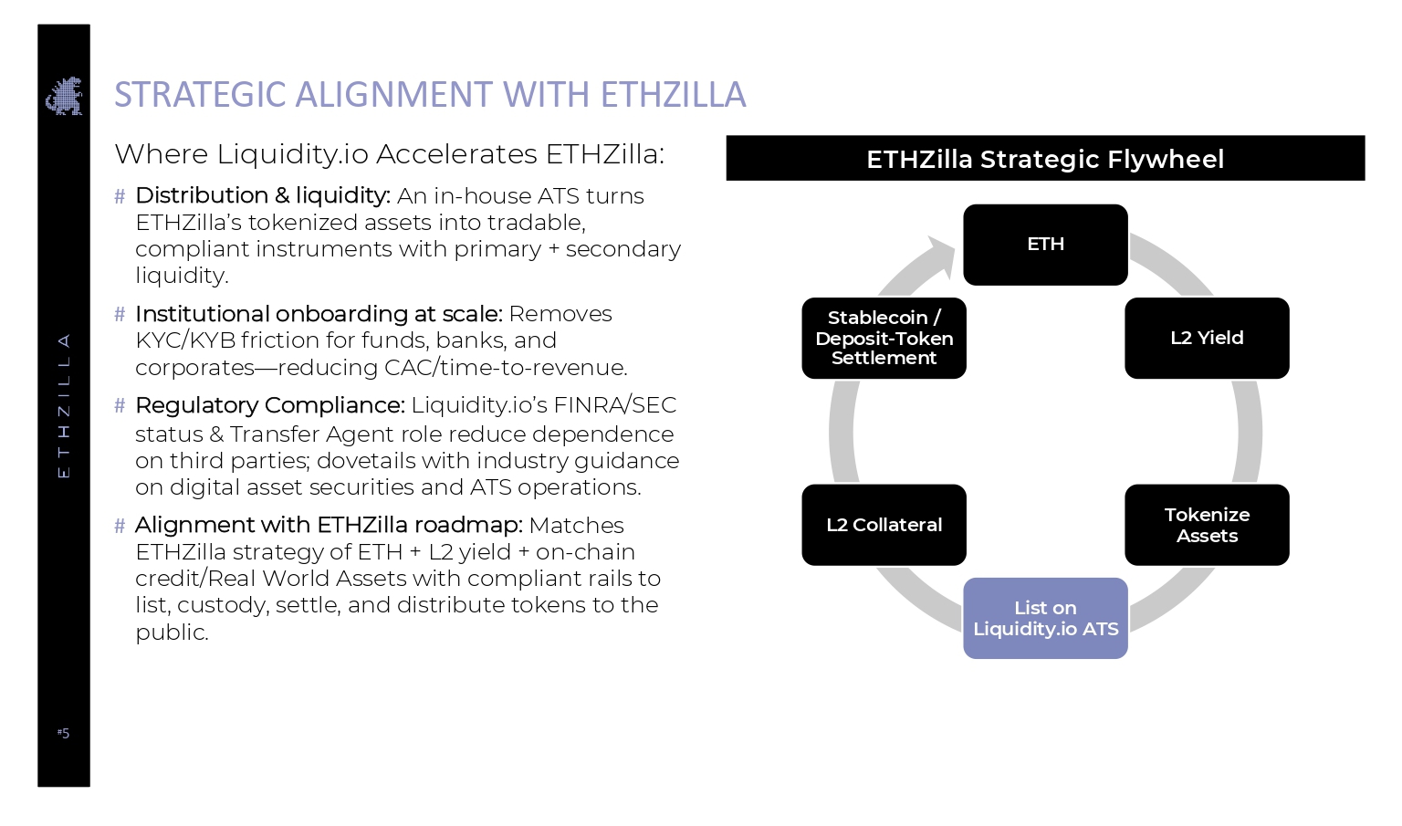 # 5 STRATEGIC ALIGNMENT WITH ETHZILLA ETH L2 Yield Tokenize Assets List on Liquidity.io ATS L2 Collateral Stablecoin / Deposit - Token Settlement ETHZilla Strategic Flywheel Where Liquidity.io Accelerates ETHZilla : # Distribution & liquidity: An in - house ATS turns ETHZilla’s tokenized assets into tradable, compliant instruments with primary + secondary liquidity. # Institutional onboarding at scale: Removes KYC/KYB friction for funds, banks, and corporates — reducing CAC/time - to - revenue. # Regulatory Compliance: Liquidity.io’s FINRA/SEC status & Transfer Agent role reduce dependence on third parties; dovetails with industry guidance on digital asset securities and ATS operations. # Alignment with ETHZilla roadmap: Matches ETHZilla strategy of ETH + L2 yield + on - chain credit/Real World Assets with compliant rails to list, custody, settle, and distribute tokens to the public.