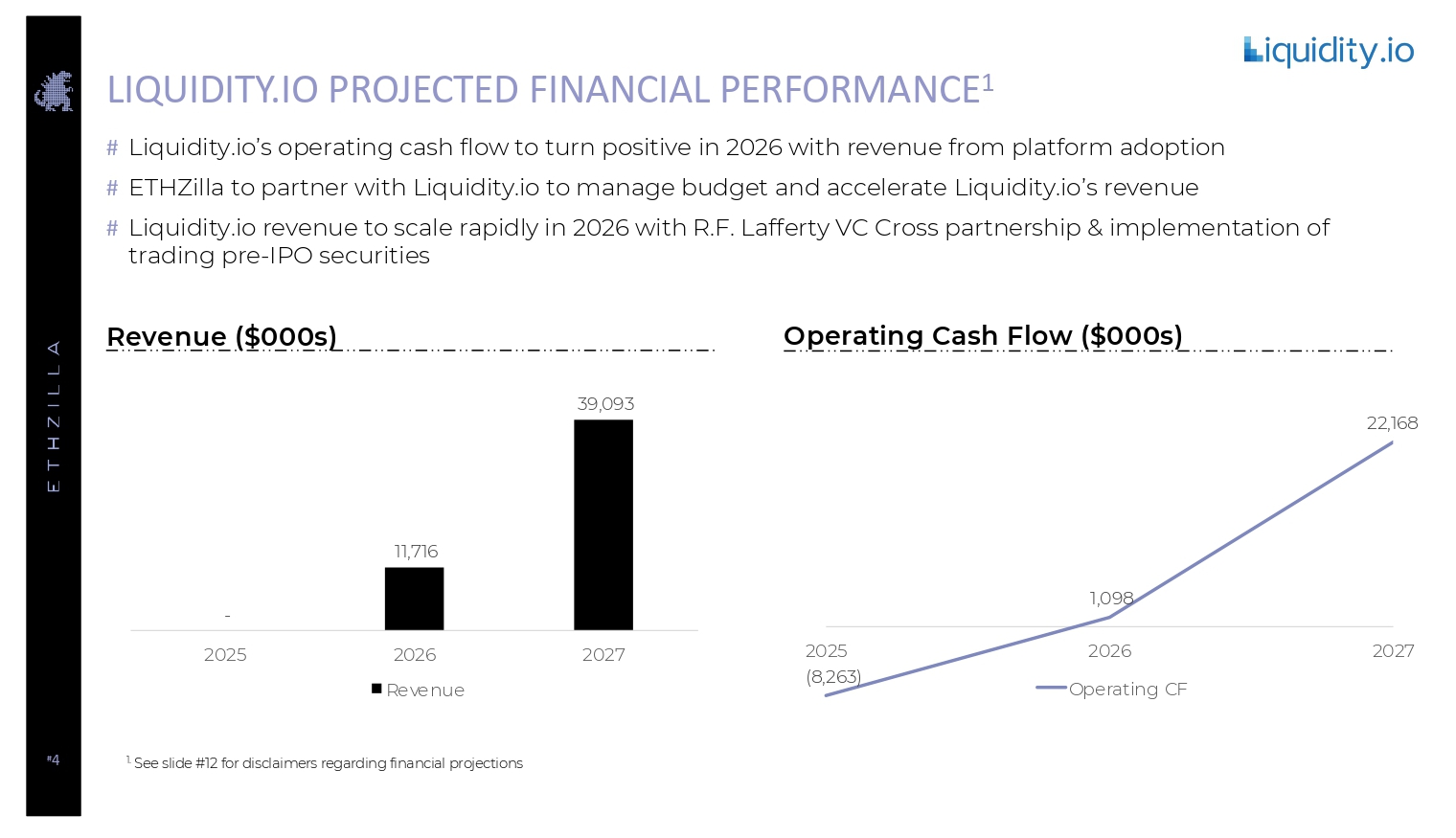 # 4 LIQUIDITY.IO PROJECTED FINANCIAL PERFORMANCE 1 # Liquidity.io’s operating cash flow to turn positive in 2026 with revenue from platform adoption # ETHZilla to partner with Liquidity.io to manage budget and accelerate Liquidity.io’s revenue # Liquidity.io revenue to scale rapidly in 2026 with R.F. Lafferty VC Cross partnership & implementation of trading pre - IPO securities - 11,716 39,093 2025 2026 2027 Revenue (8,263) 1,098 22,168 2025 2026 2027 Operating CF Revenue ($000s) Operating Cash Flow ($000s) 1. See slide #12 for disclaimers regarding financial projections
