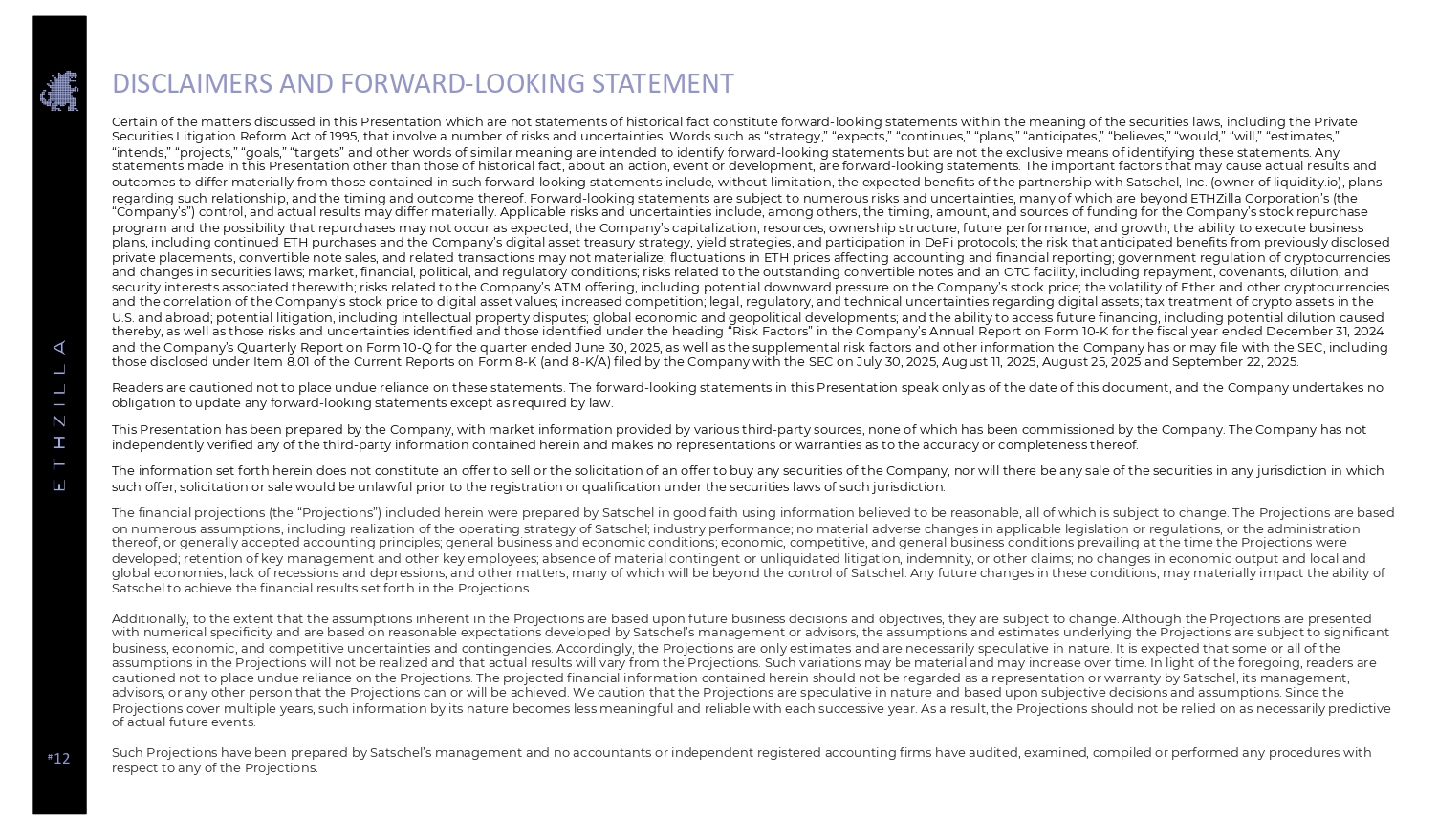# 12 DISCLAIMERS AND FORWARD - LOOKING STATEMENT Certain of the matters discussed in this Presentation which are not statements of historical fact constitute forward - looking sta tements within the meaning of the securities laws, including the Private Securities Litigation Reform Act of 1995, that involve a number of risks and uncertainties. Words such as “strategy,” “expect s,” “continues,” “plans,” “anticipates,” “believes,” “would,” “will,” “estimates,” “intends,” “projects,” “goals,” “targets” and other words of similar meaning are intended to identify forward - looking statements but are not the exclusive means of identifying these statements. Any statements made in this Presentation other than those of historical fact, about an action, event or development, are forward - loo king statements. The important factors that may cause actual results and outcomes to differ materially from those contained in such forward - looking statements include, without limitation, the expected benefits of the partnership with Satschel , Inc. (owner of liquidity.io ), plans regarding such relationship, and the timing and outcome thereof. Forward - looking statements are subject to numerous risks and un certainties, many of which are beyond ETHZilla Corporation’s (the “Company’s”) control, and actual results may differ materially. Applicable risks and uncertainties include, among others, the ti ming, amount, and sources of funding for the Company’s stock repurchase program and the possibility that repurchases may not occur as expected; the Company’s capitalization, resources, ownership st ruc ture, future performance, and growth; the ability to execute business plans, including continued ETH purchases and the Company’s digital asset treasury strategy, yield strategies, and participati on in DeFi protocols; the risk that anticipated benefits from previously disclosed private placements, convertible note sales, and related transactions may not materialize; fluctuations in ETH prices affectin g a ccounting and financial reporting; government regulation of cryptocurrencies and changes in securities laws; market, financial, political, and regulatory conditions; risks related to the outstanding con ver tible notes and an OTC facility, including repayment, covenants, dilution, and security interests associated therewith; risks related to the Company’s ATM offering, including potential downward pressure o n t he Company’s stock price; the volatility of Ether and other cryptocurrencies and the correlation of the Company’s stock price to digital asset values; increased competition; legal, regulatory, and techn ica l uncertainties regarding digital assets; tax treatment of crypto assets in the U.S. and abroad; potential litigation, including intellectual property disputes; global economic and geopolitical development s; and the ability to access future financing, including potential dilution caused thereby, as well as those risks and uncertainties identified and those identified under the heading “Risk Factors” in the Com pan y’s Annual Report on Form 10 - K for the fiscal year ended December 31, 2024 and the Company’s Quarterly Report on Form 10 - Q for the quarter ended June 30, 2025, as well as the supplemental risk factors an d other information the Company has or may file with the SEC, including those disclosed under Item 8.01 of the Current Reports on Form 8 - K (and 8 - K/A) filed by the Company with the SEC on July 30, 202 5, August 11, 2025, August 25, 2025 and September 22, 2025. Readers are cautioned not to place undue reliance on these statements. The forward - looking statements in this Presentation speak only as of the date of this document, and the Company undertakes no obligation to update any forward - looking statements except as required by law. This Presentation has been prepared by the Company, with market information provided by various third - party sources, none of whi ch has been commissioned by the Company. The Company has not independently verified any of the third - party information contained herein and makes no representations or warranties as to the accuracy or completeness thereof. The information set forth herein does not constitute an offer to sell or the solicitation of an offer to buy any securities o f t he Company, nor will there be any sale of the securities in any jurisdiction in which such offer, solicitation or sale would be unlawful prior to the registration or qualification under the securities laws of su ch jurisdiction. The financial projections (the “Projections”) included herein were prepared by Satschel in good faith using information believed to be reasonable, all of which is subject to change. The Projections are based on numerous assumptions, including realization of the operating strategy of Satschel ; industry performance; no material adverse changes in applicable legislation or regulations, or the administration thereof, or generally accepted accounting principles; general business and economic conditions; economic, competitive, and ge ner al business conditions prevailing at the time the Projections were developed; retention of key management and other key employees; absence of material contingent or unliquidated litigation, in dem nity, or other claims; no changes in economic output and local and global economies; lack of recessions and depressions; and other matters, many of which will be beyond the control of Satschel . Any future changes in these conditions, may materially impact the ability of Satschel to achieve the financial results set forth in the Projections. Additionally, to the extent that the assumptions inherent in the Projections are based upon future business decisions and obj ect ives, they are subject to change. Although the Projections are presented with numerical specificity and are based on reasonable expectations developed by Satschel’s management or a