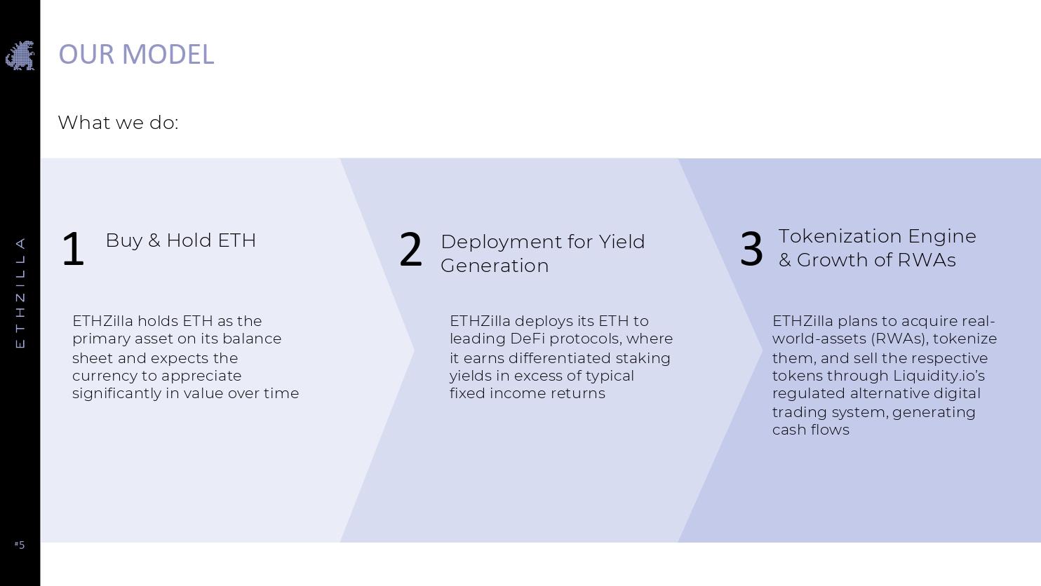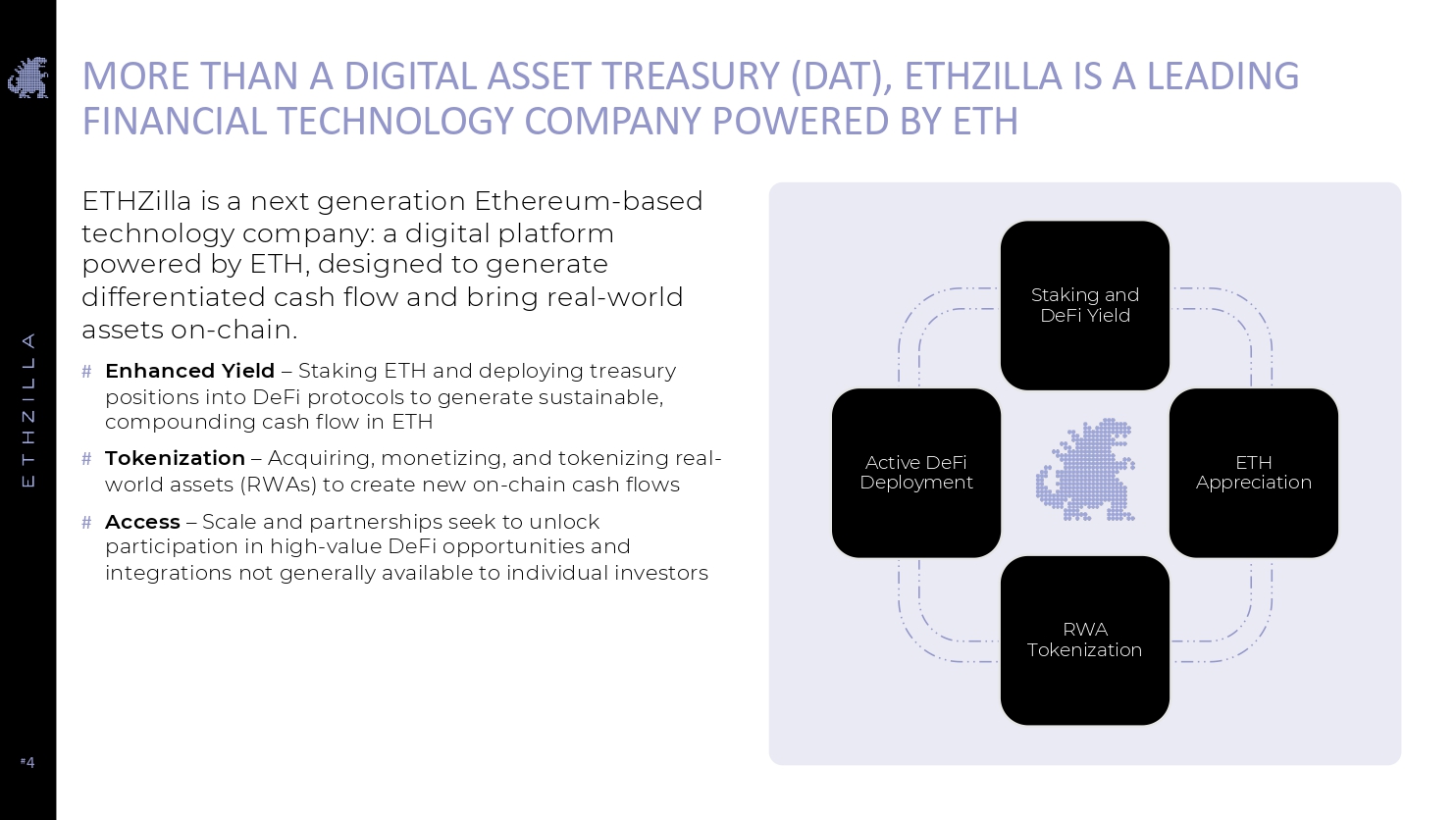 # 4 MORE THAN A DIGITAL ASSET TREASURY (DAT), ETHZILLA IS A LEADING FINANCIAL TECHNOLOGY COMPANY POWERED BY ETH ETHZilla is a next generation Ethereum - based technology company: a digital platform powered by ETH, designed to generate differentiated cash flow and bring real - world assets on - chain. # Enhanced Yield – Staking ETH and deploying treasury positions into DeFi protocols to generate sustainable, compounding cash flow in ETH # Tokenization – Acquiring, monetizing, and tokenizing real - world assets (RWAs) to create new on - chain cash flows # Access – Scale and partnerships seek to unlock participation in high - value DeFi opportunities and integrations not generally available to individual investors Staking and DeFi Yield RWA Tokenization ETH Appreciation Active DeFi Deployment