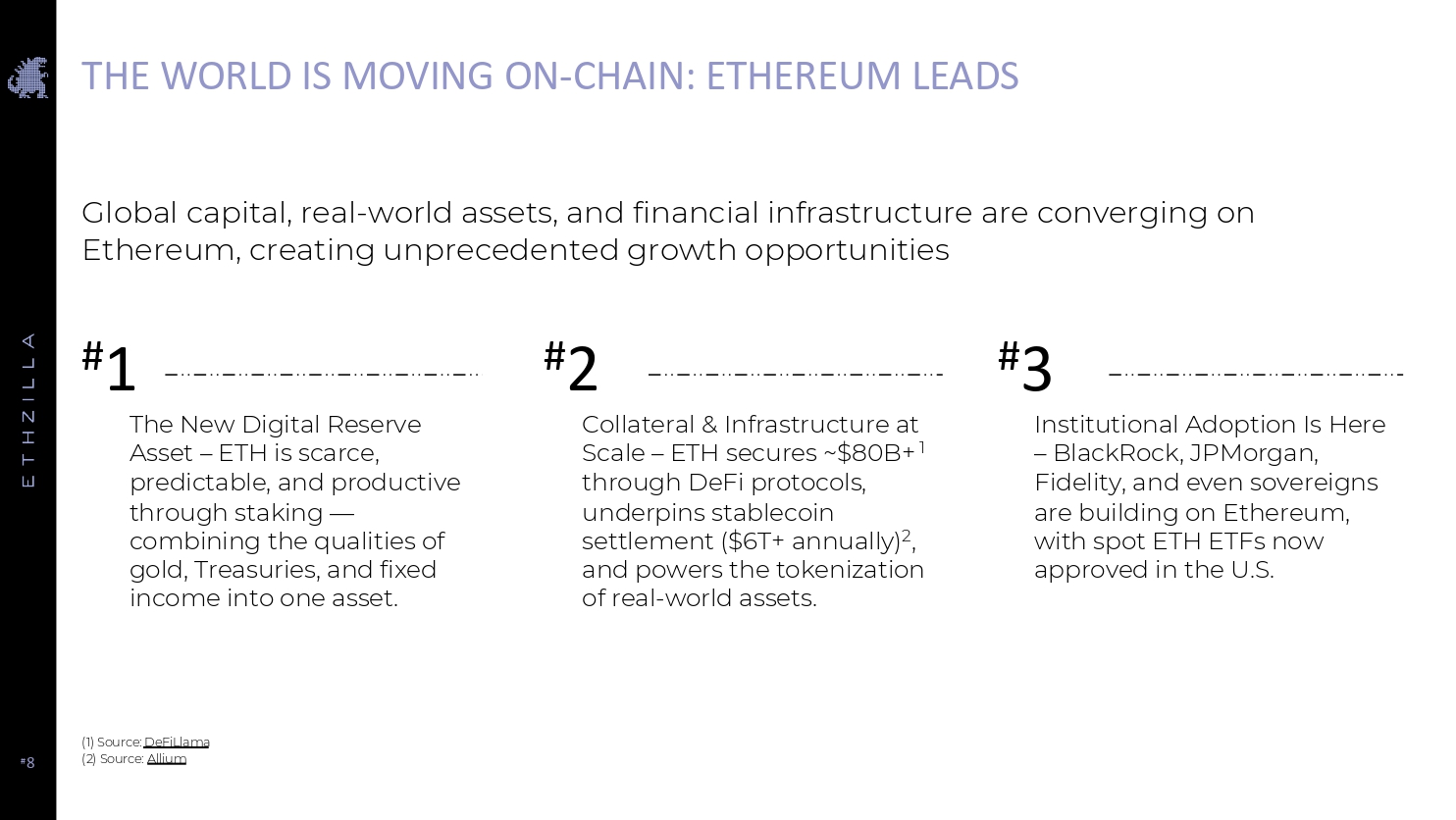 # 8 THE WORLD IS MOVING ON - CHAIN: ETHEREUM LEADS The New Digital Reserve Asset – ETH is scarce, predictable, and productive through staking — combining the qualities of gold, Treasuries, and fixed income into one asset. Collateral & Infrastructure at Scale – ETH secures ~$80B+ 1 through DeFi protocols, underpins stablecoin settlement ($6T+ annually) 2 , and powers the tokenization of real - world assets. Institutional Adoption Is Here – BlackRock, JPMorgan, Fidelity, and even sovereigns are building on Ethereum, with spot ETH ETFs now approved in the U.S. Global capital, real - world assets, and financial infrastructure are converging on Ethereum, creating unprecedented growth opportunities (1) Source: DeFiLlama (2) Source: Allium # 1 # 2 # 3
