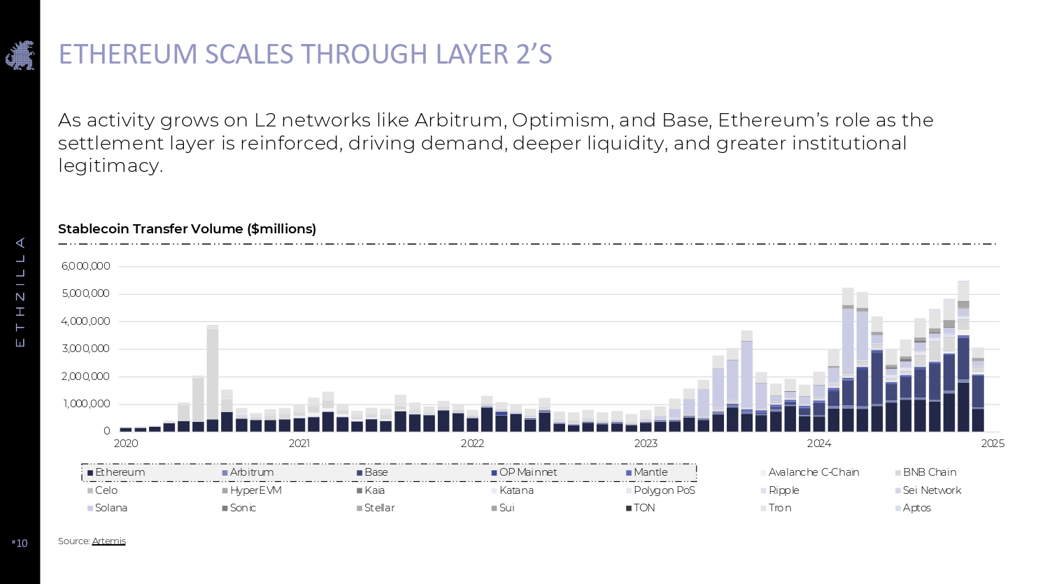 # 10 ETHEREUM SCALES THROUGH LAYER 2’S Source: Artemis As activity grows on L2 networks like Arbitrum , Optimism, and Base, Ethereum’s role as the settlement layer is reinforced, driving demand, deeper liquidity, and greater institutional legitimacy. Stablecoin Transfer Volume ($millions) 0 1,000,000 2,000,000 3,000,000 4,000,000 5,000,000 6,000,000 2020 2021 2022 2023 2024 2025 Ethereum Arbitrum Base OP Mainnet Mantle Avalanche C-Chain BNB Chain Celo HyperEVM Kaia Katana Polygon PoS Ripple Sei Network Solana Sonic Stellar Sui TON Tron Aptos
