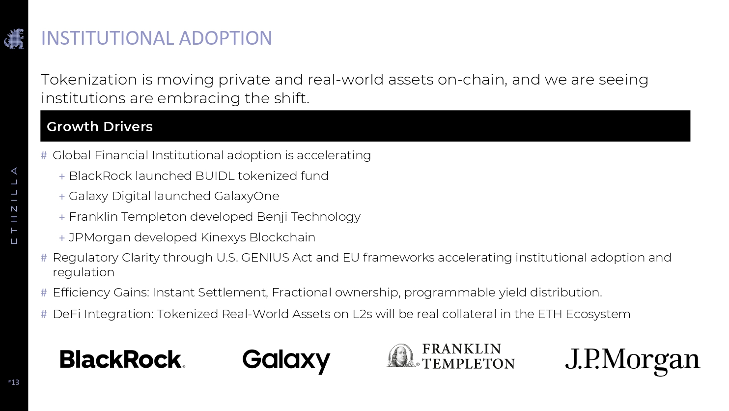 # 13 INSTITUTIONAL ADOPTION # Global Financial Institutional adoption is accelerating + BlackRock launched BUIDL tokenized fund + Galaxy Digital launched GalaxyOne + Franklin Templeton developed Benji Technology + JPMorgan developed Kinexys Blockchain # Regulatory Clarity through U.S. GENIUS Act and EU frameworks accelerating institutional adoption and regulation # Efficiency Gains: Instant Settlement, Fractional ownership, programmable yield distribution. # DeFi Integration: Tokenized Real - World Assets on L2s will be real collateral in the ETH Ecosystem Growth Drivers Tokenization is moving private and real - world assets on - chain, and we are seeing institutions are embracing the shift.